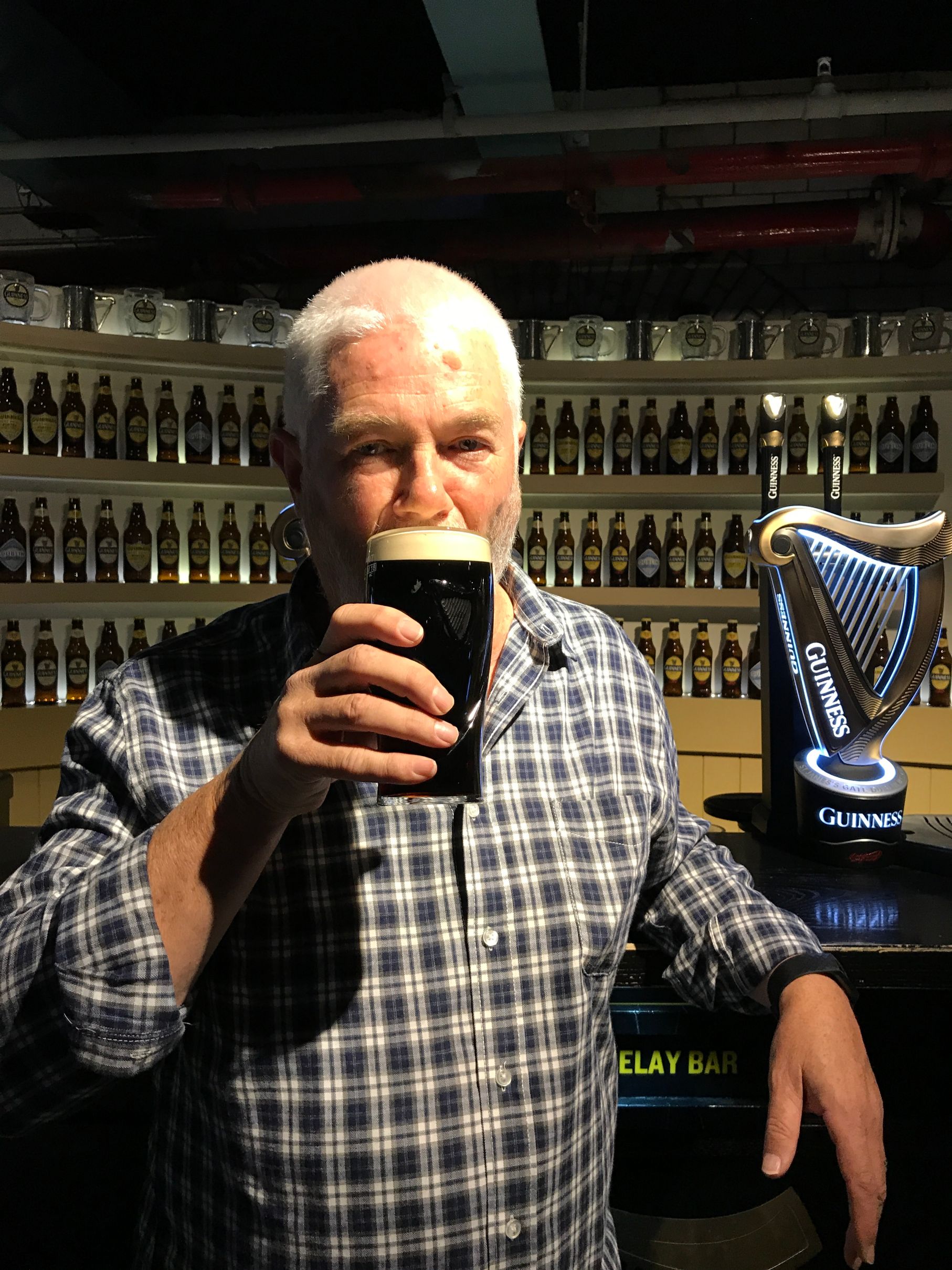 The Guinness Storehouse is in a large structure, seven storeys high, that takes the shape of a giant pint glass. It was here that the fermentation process once took place. Today it is a major tourist destination. Luckily we arrived ahead of most of the crowds. A few of us made our way to the Guinness Academy on the fourth floor to learn the craft of pouring a perfect Guinness. When the task was successfully achieved, we were able to drink the pint we had poured. It looked so good, Marg even took a few swigs of my glass. Not a bad effort from someone who doesn’t drink beer. The seventh floor bar provided 360 degree views of Dublin. As always, the exit was through the gift shop, where large amounts of tourist cash was being exchanged for all manner of goods bearing the famous Guinness label. I succumbed and bought a Guinness tee shirt.