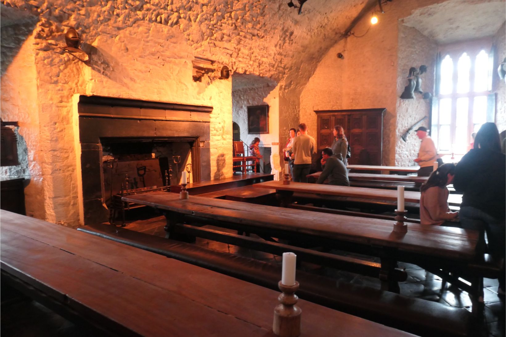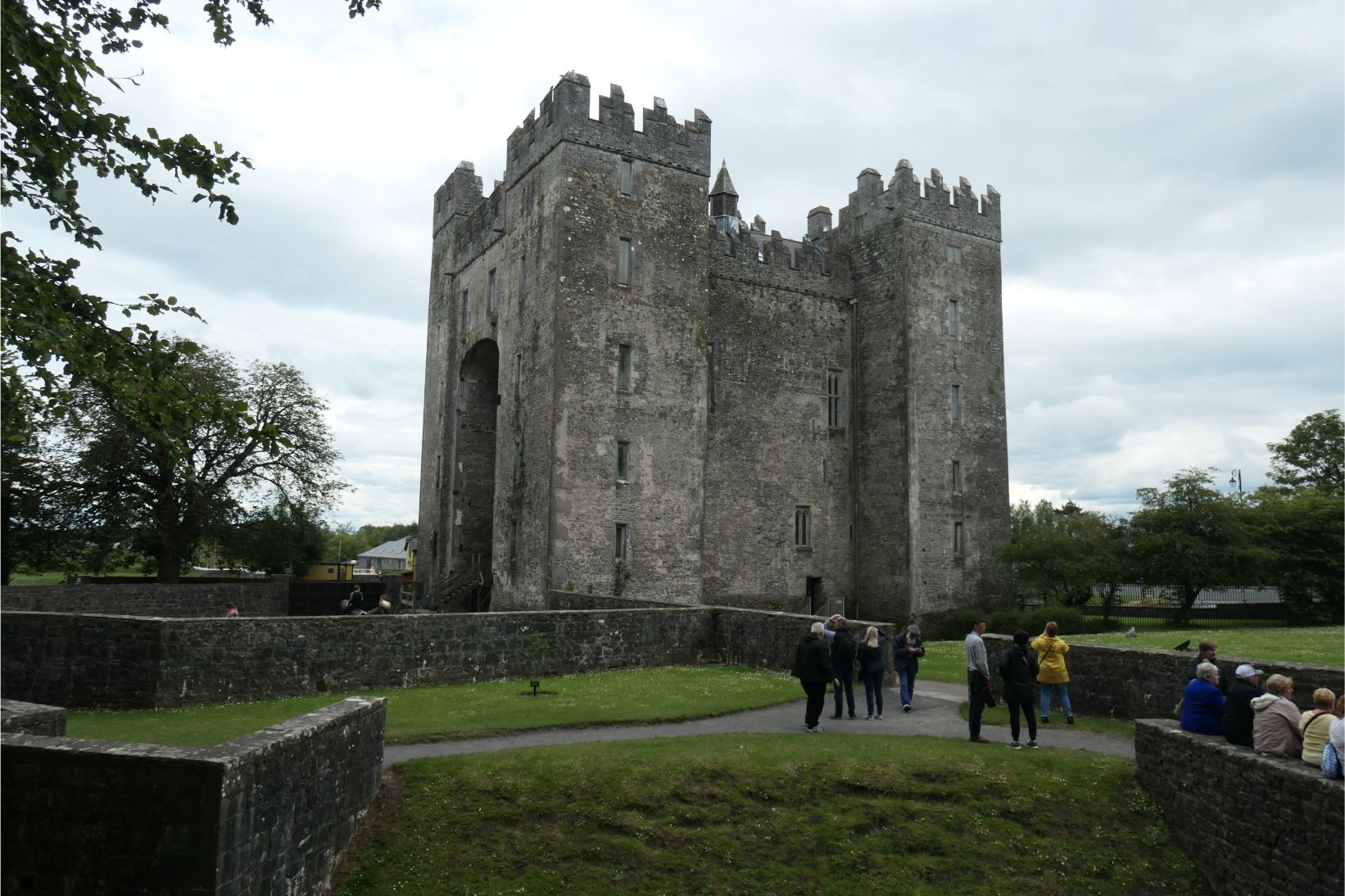 The castle was completed in the year 1425, and during the 16th and 17th centuries it was the stronghold of the powerful O’Brien kings and earls of Thomond and North Munster. There are three levels, each of which consists of a single large room. We entered the first level via a drawbridge. On its walls were the antlers of the giant elk, which has been extinct for many years. These prehistoric antlers were excavated from the nearby peat bogs. The peat is devoid of oxygen, so the antlers have not decomposed, but rather been preserved. This first room was where the soldiers slept and ate and received their orders. Thirty-odd narrow steps up a spiral staircase brought us to the next level, where the king or earl would receive visitors and hold his meetings. Another twenty-something narrower spiralling steps brought us to the third level, the private quarters of the king or earl and his family. A small trapdoor in the floor immediately above the drawbridge allowed boiling water or oil to be poured through onto an enemy directly below. The towers of the castle, which we didn’t enter, stand six storeys high.