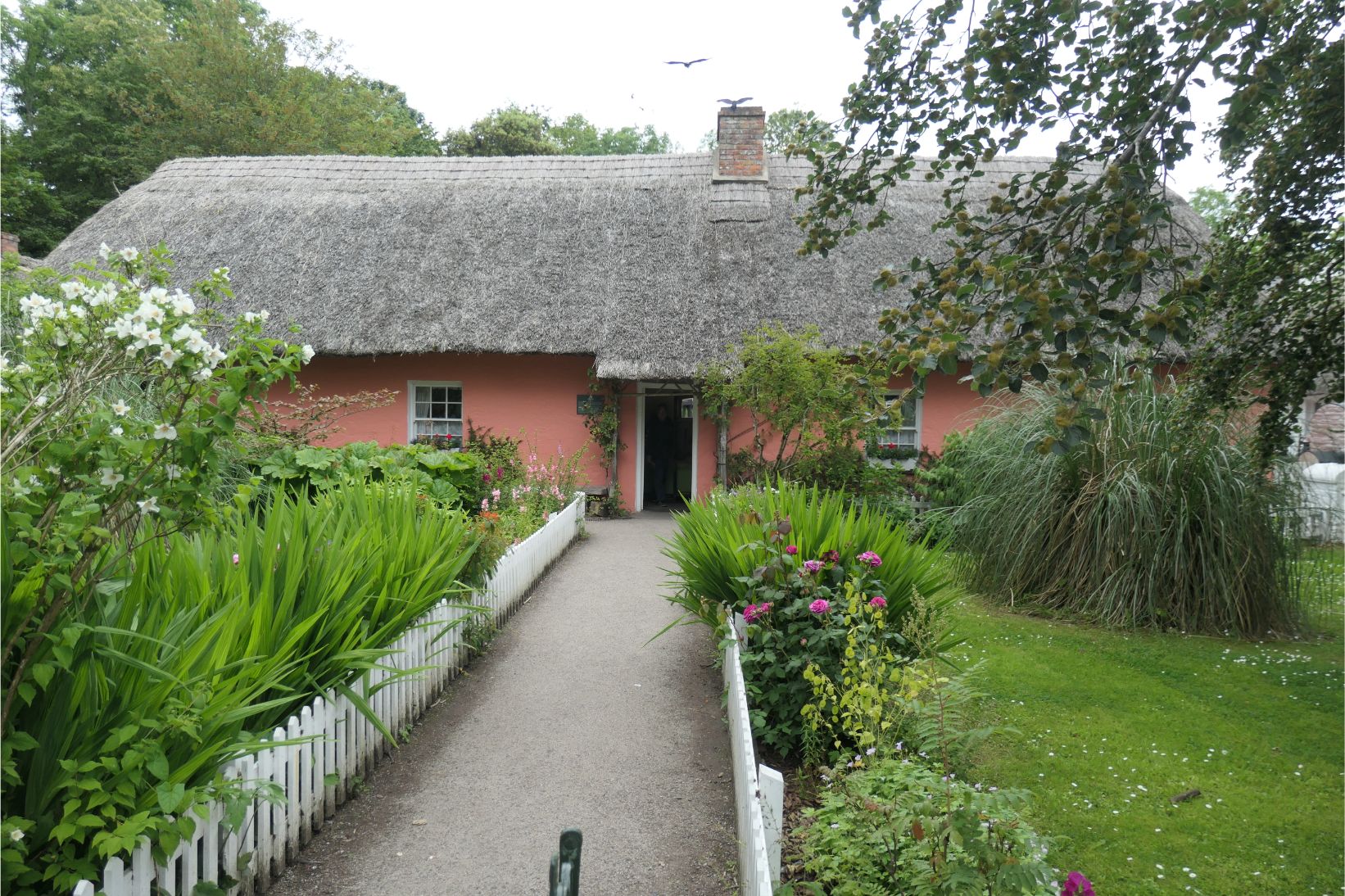 In the folk park we visited four authentic houses from the Victorian era. They ranged from a very poor family’s one room cottage, where the bedding was nothing more than a pile of hay, to a humble two-room fisherman’s cottage, to a middle-class family’s five room cottage to a well-to-do family’s home, cluttered with furniture and other desirable objects. Each had a thatched roof, although the type and standard of thatching varied with the family’s socio-economic status. These homes had been demolished, moved to this site, and then reassembled brick by brick to ensure their authenticity.