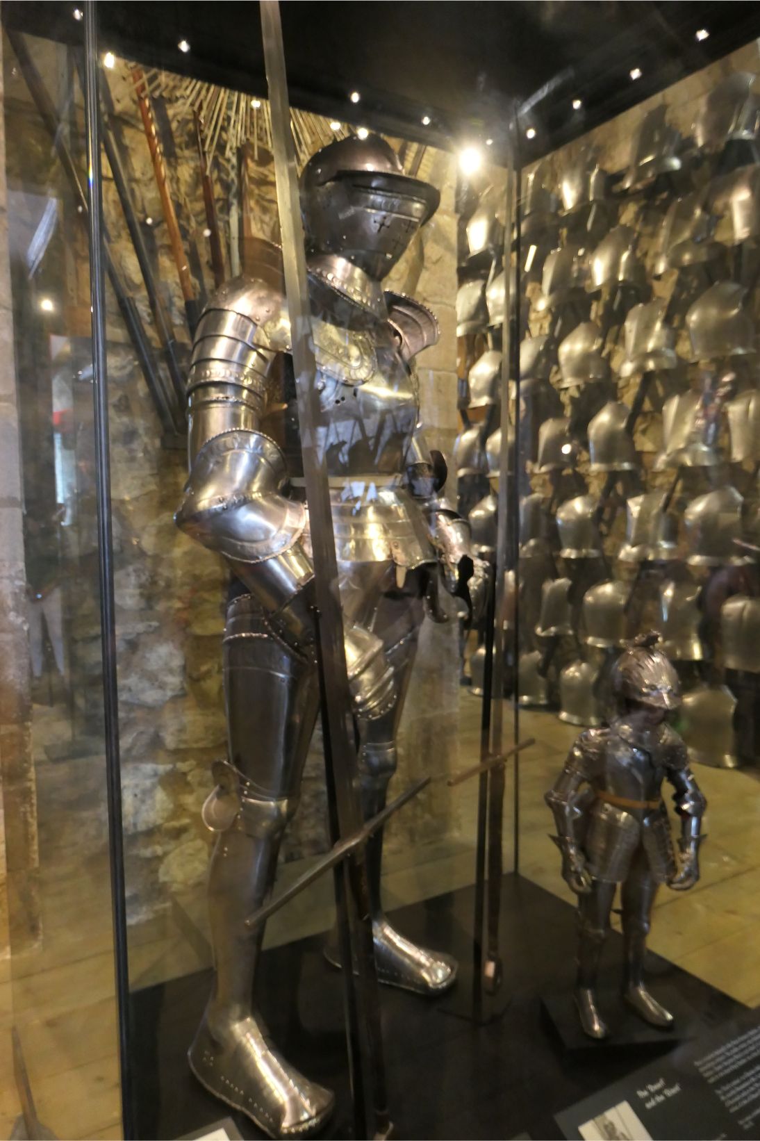 We entered the White Tower. This structure is over 900-years old. It houses the royal armouries. We saw large and small suits of armour, some reputedly belonging to famous kings, and all types of weaponry, including some captured by the English during wards. Perhaps the most remarkable suit of armour there reputedly belonged to John of Gaunt, who was apparently a man of very tall stature. The most gruesome implement on display was surely the sharp-bladed axe and wooden block, used in the beheadings. The descent from the top level of the White Tower was by means of a long, narrow winding spiral staircase. More text follows the set of photos below.
