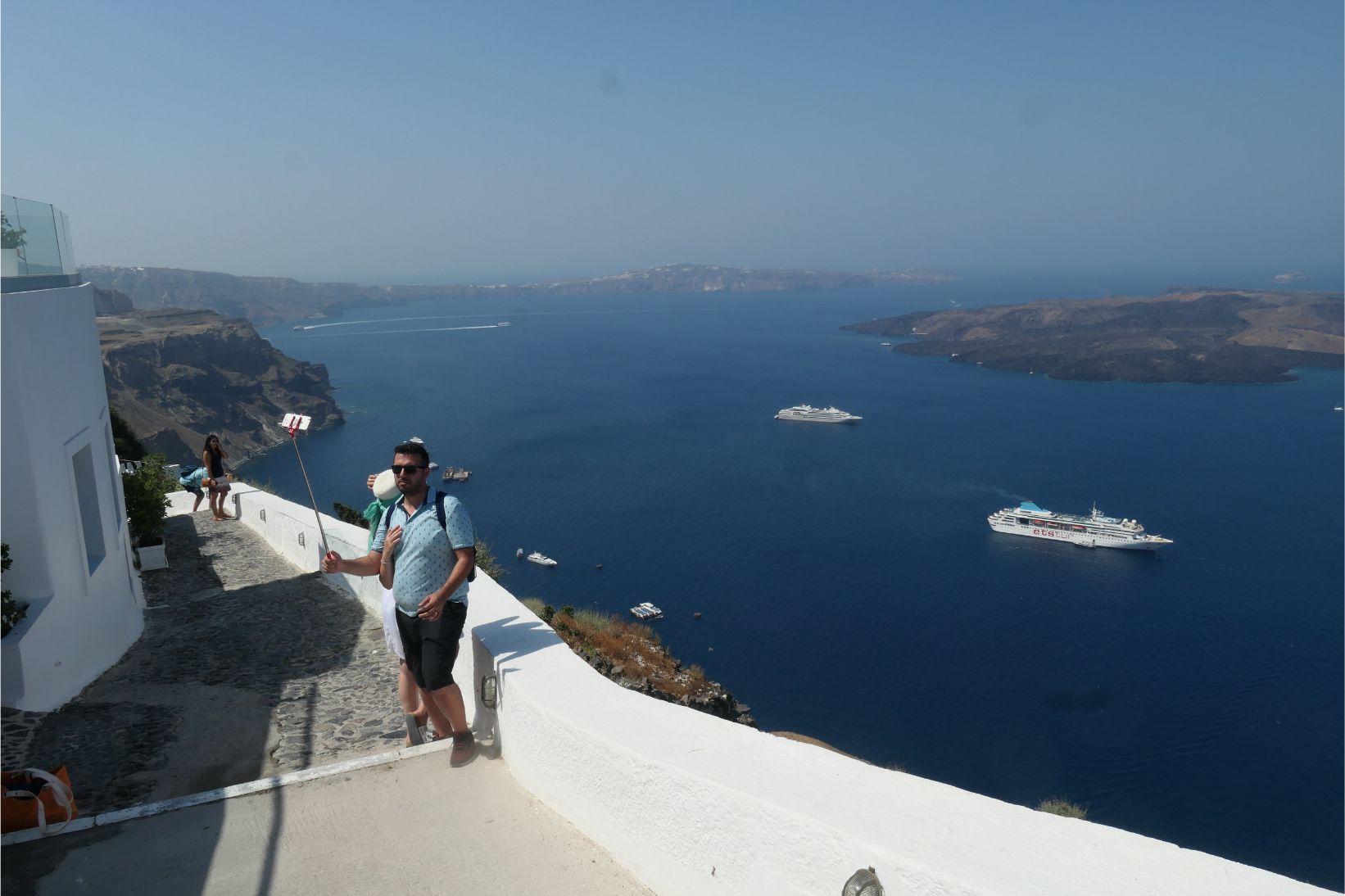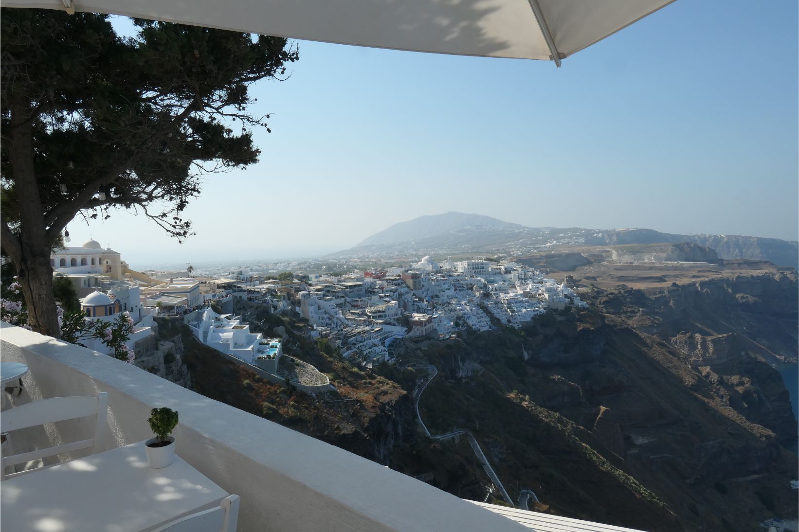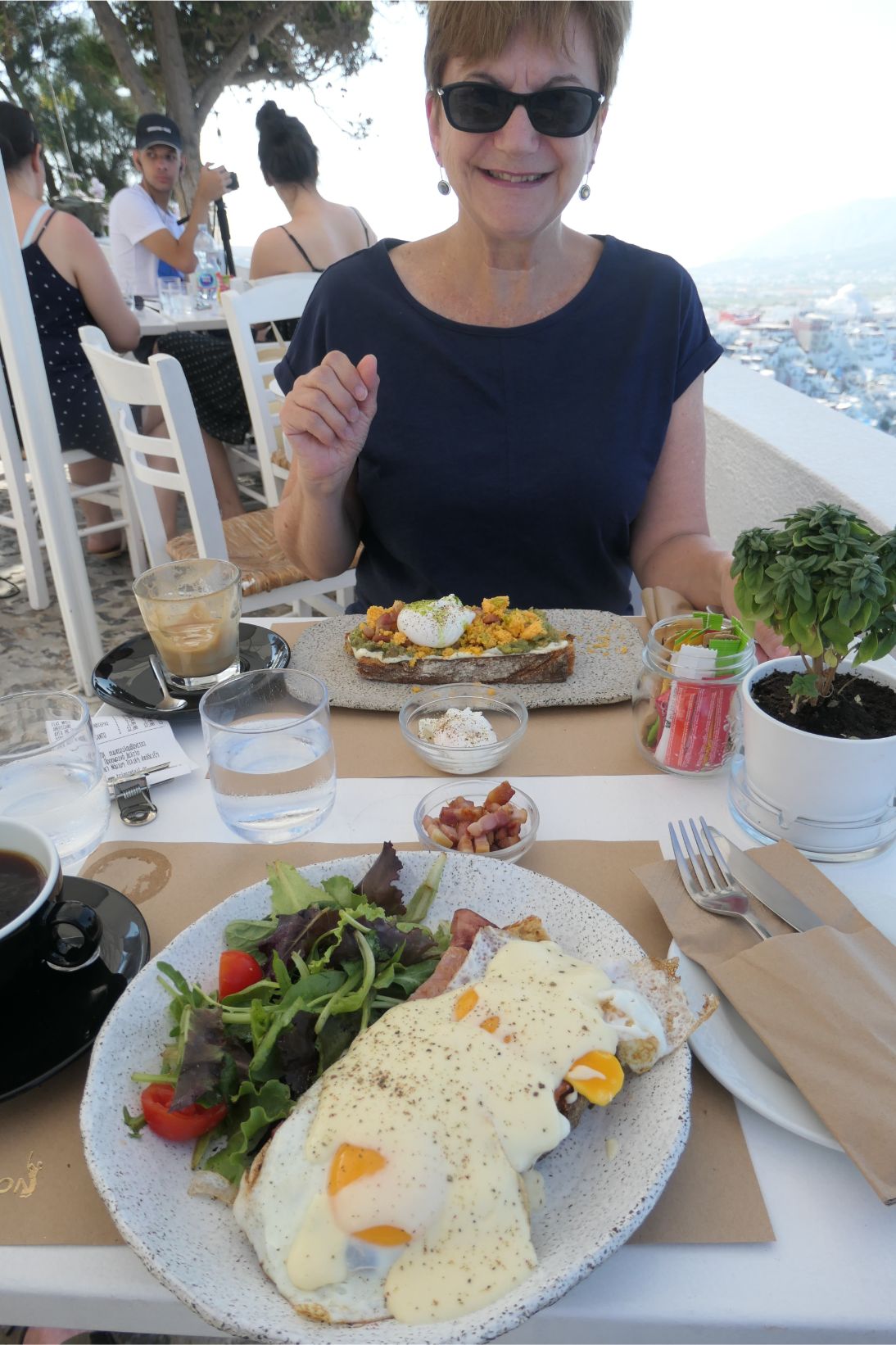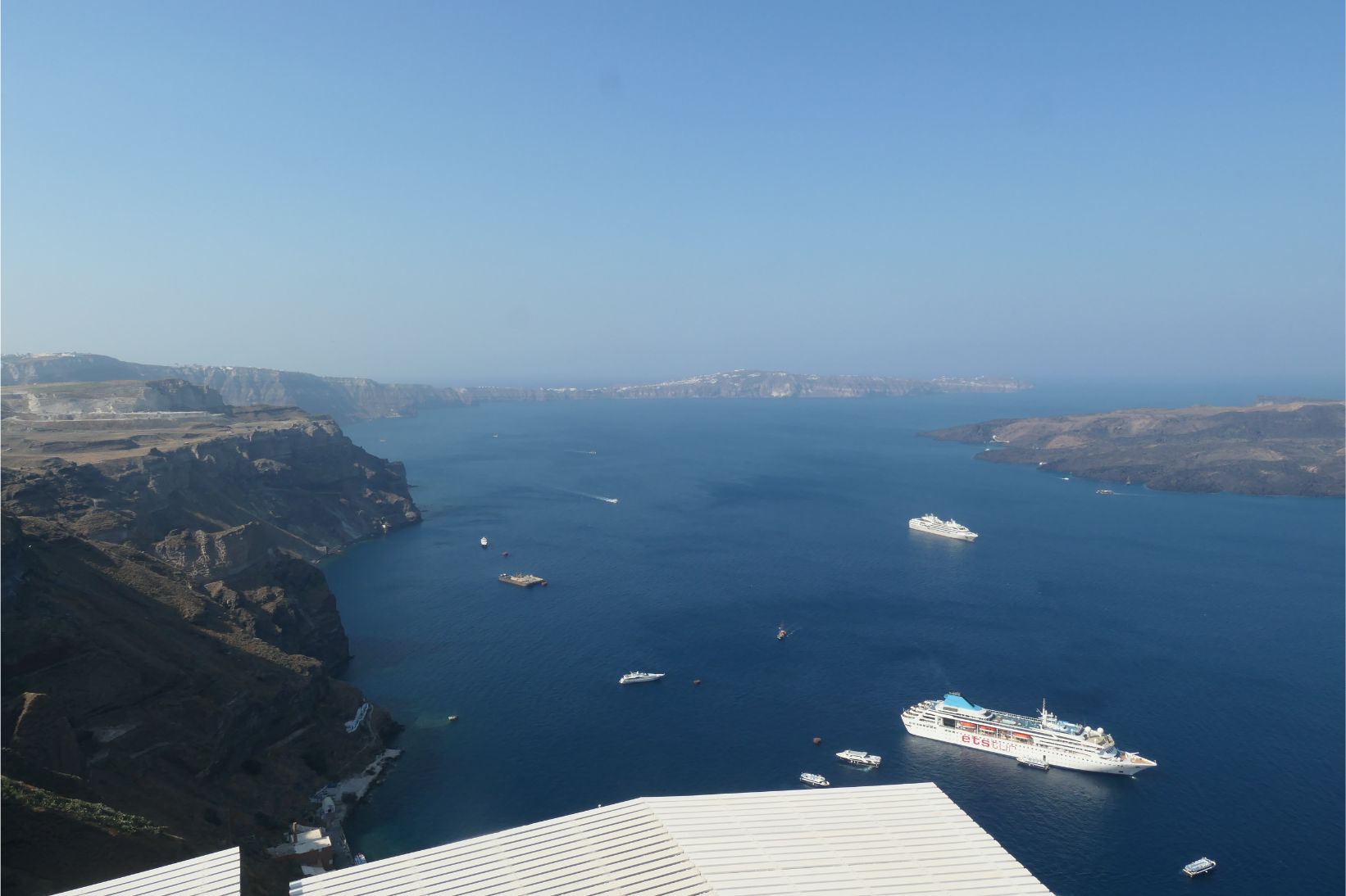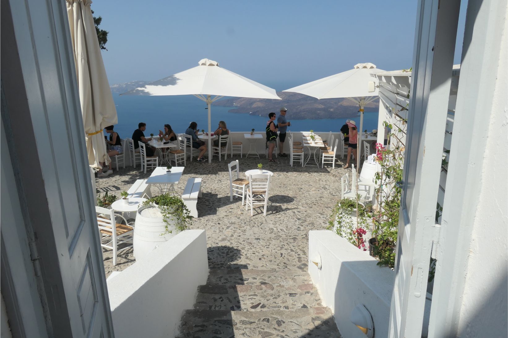 I got up early this morning and sat on the balcony checking websites, reading emails and watching the cruise ships sail in. I had a couple of the island’s many cats for company. Breakfast was at Volkan cafe, about 100 metres along the path from our place. We got a table right on the wall, looking directly down to the sea and out across the caldera – one of the best views you could ever wish to have while eating breakfast.