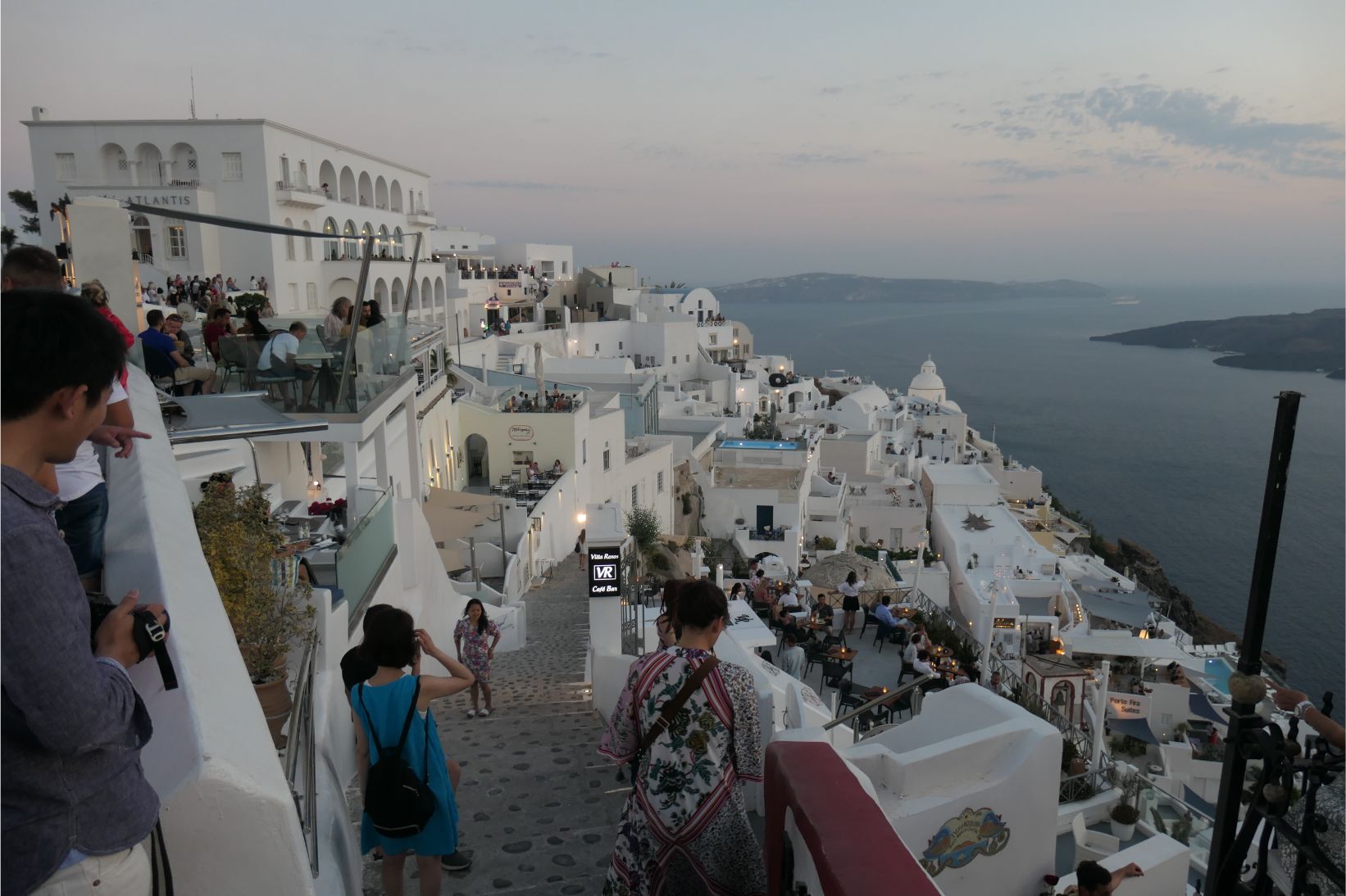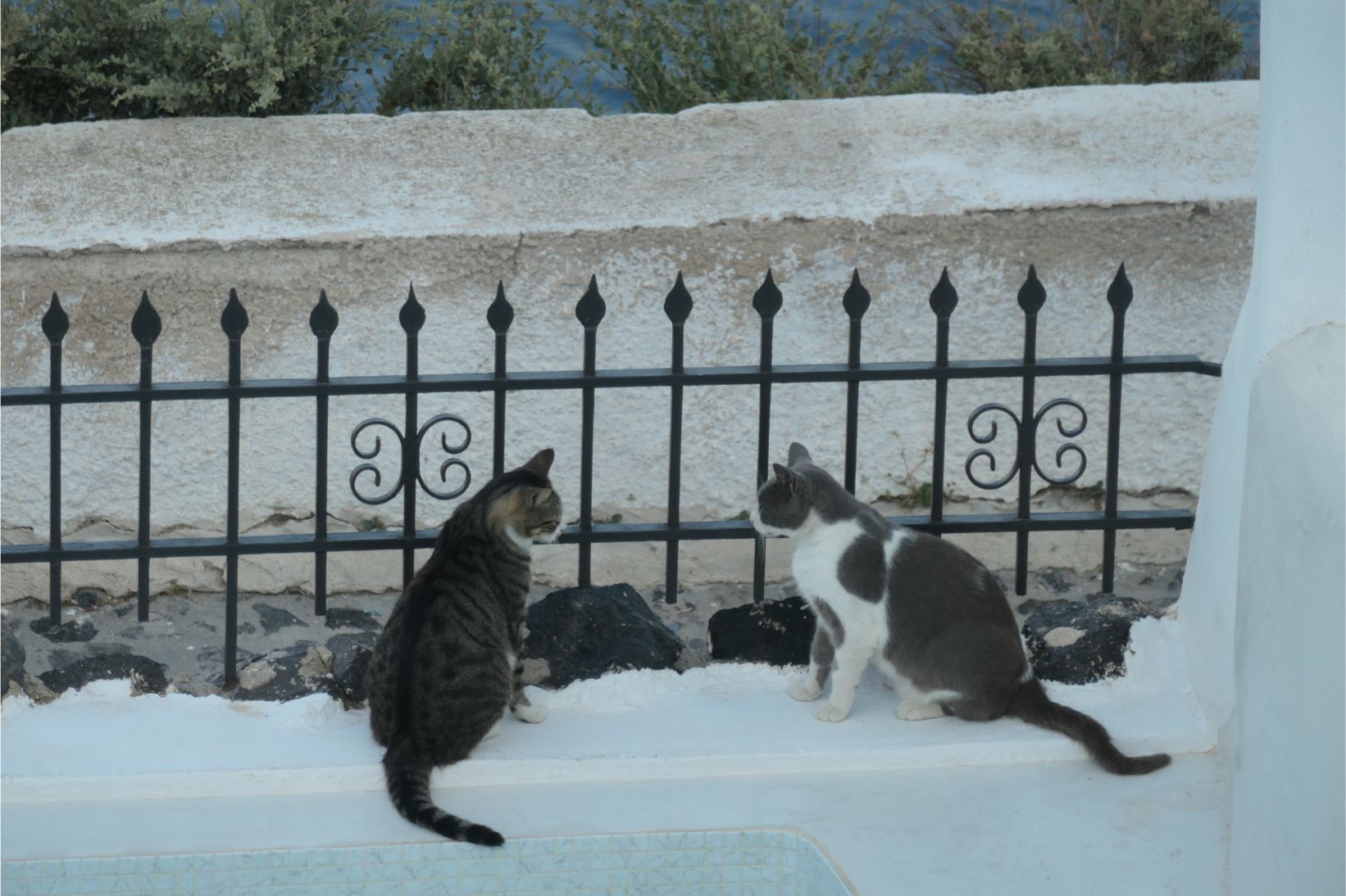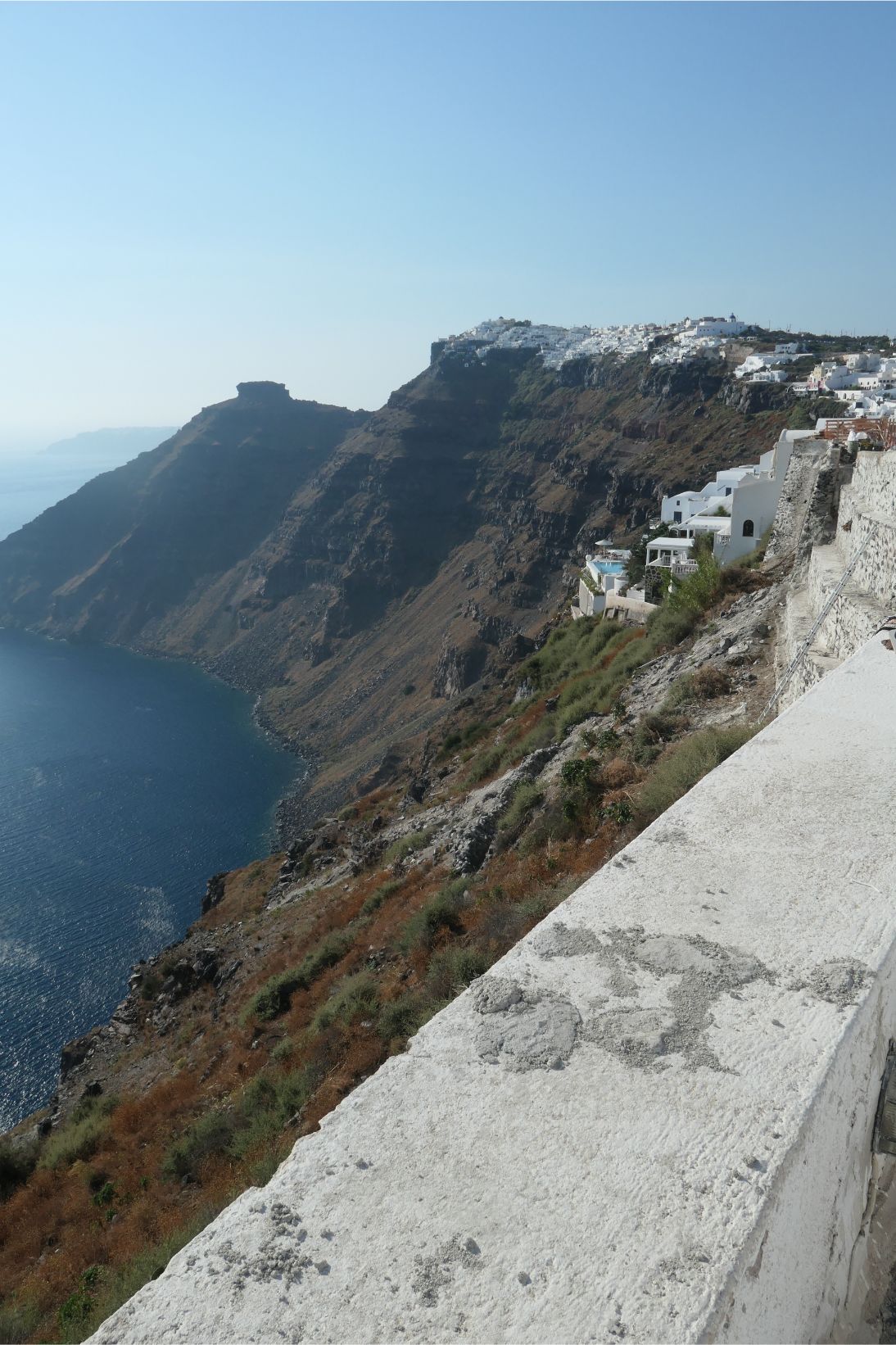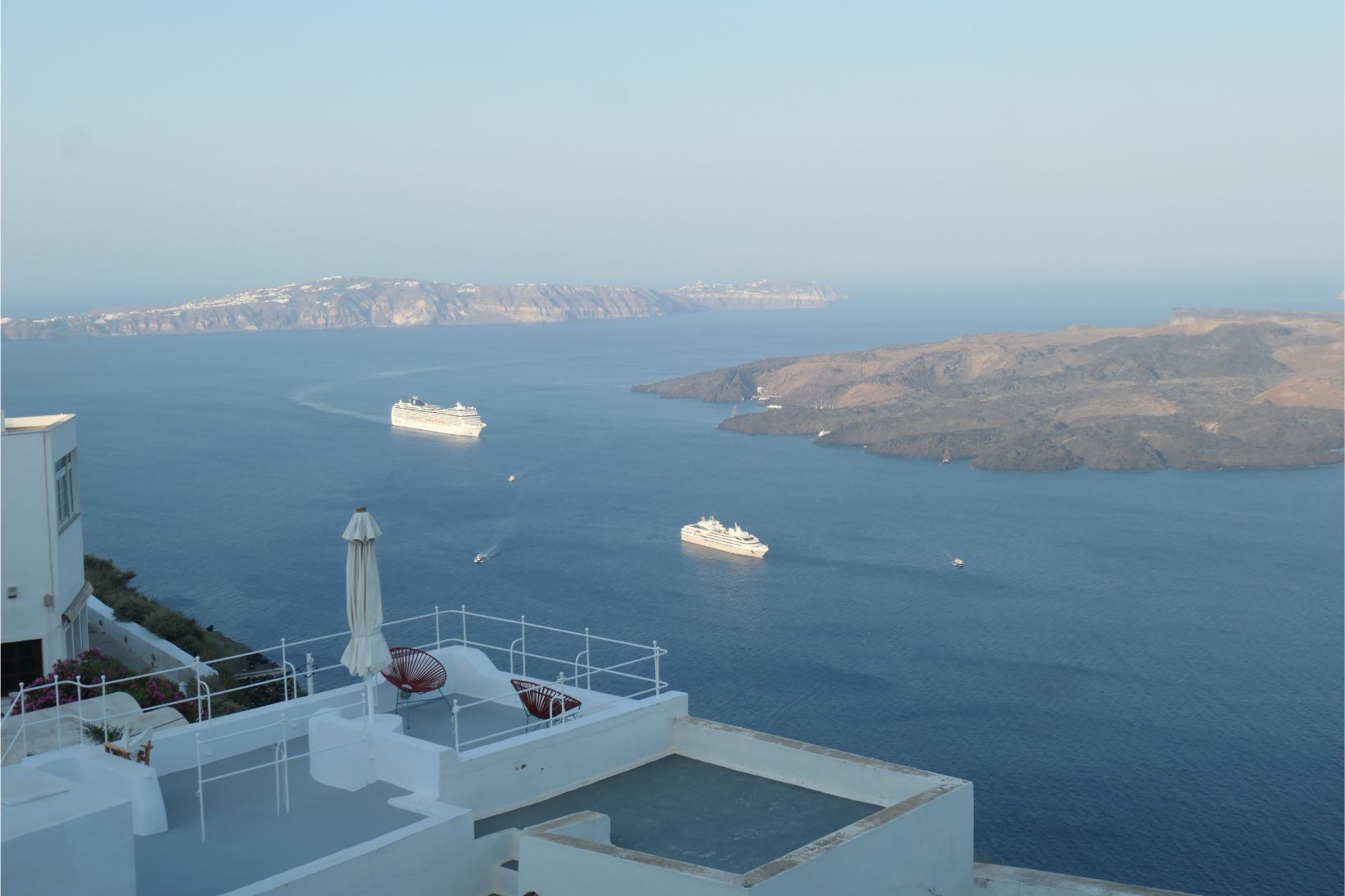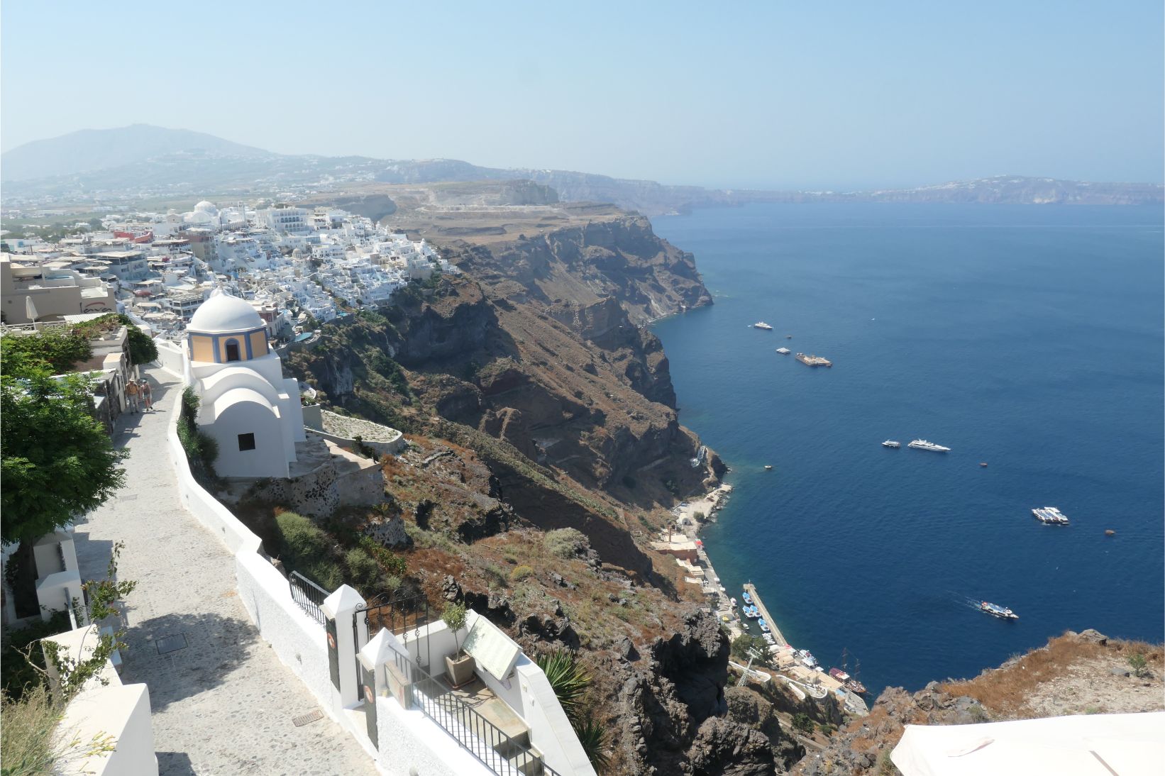 I got up early this morning and sat on the balcony checking websites, reading emails and watching the cruise ships sail in. I had a couple of the island’s many cats for company. Breakfast was at Volkan cafe, about 100 metres along the path from our place. We got a table right on the wall, looking directly down to the sea and out across the caldera – one of the best views you could ever wish to have while eating breakfast.