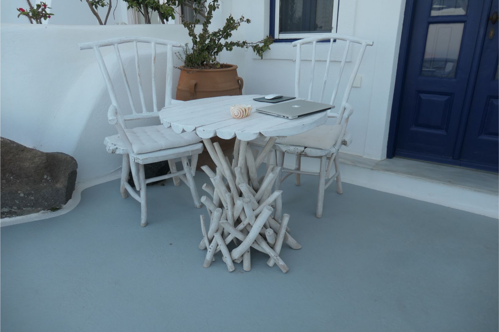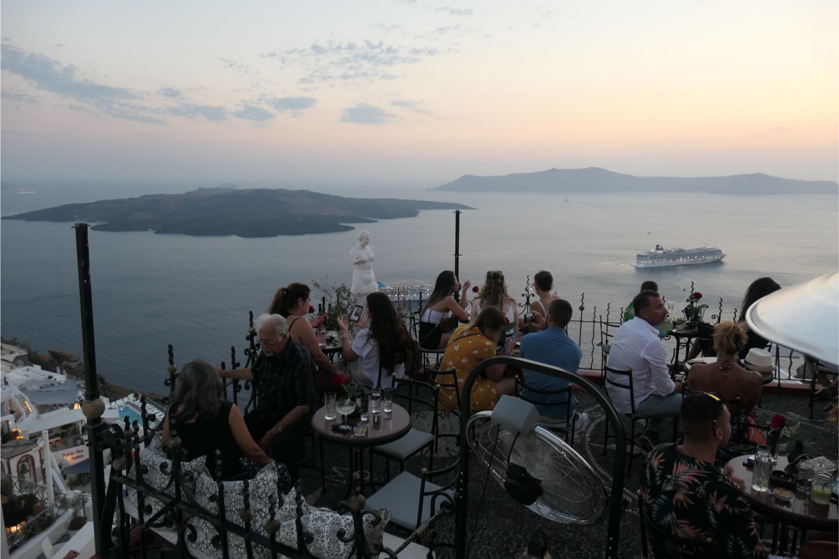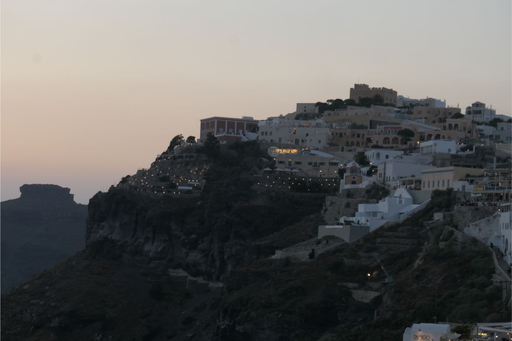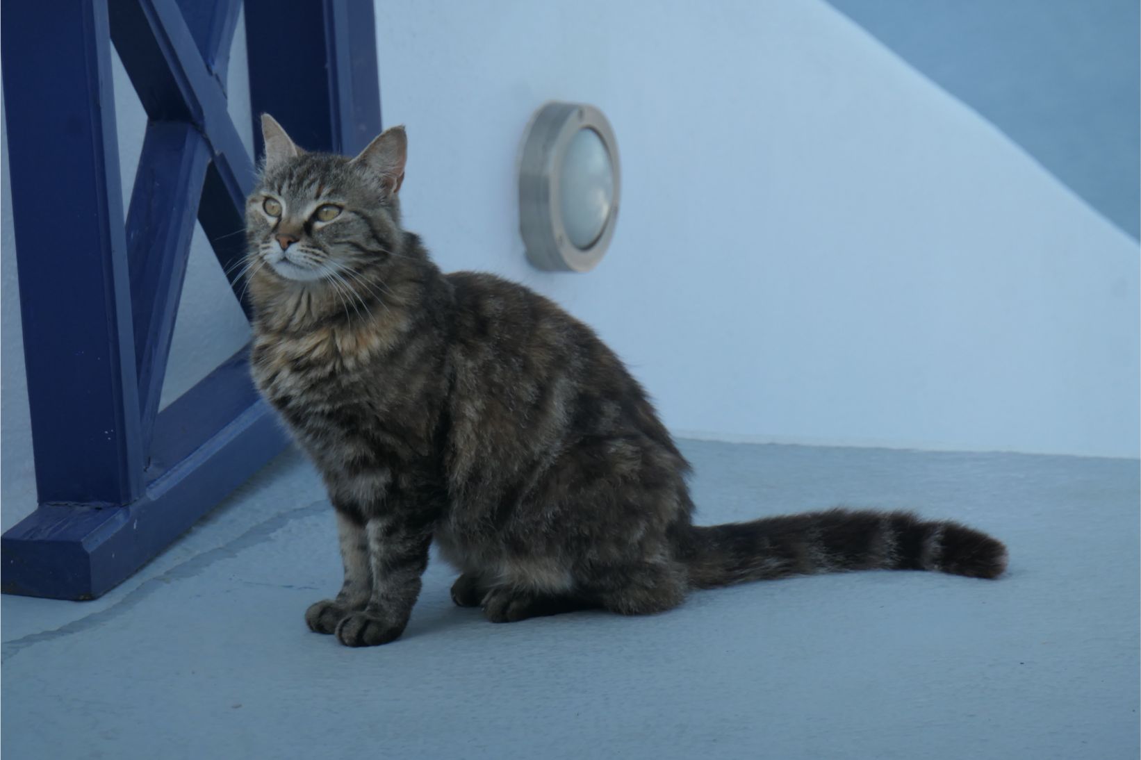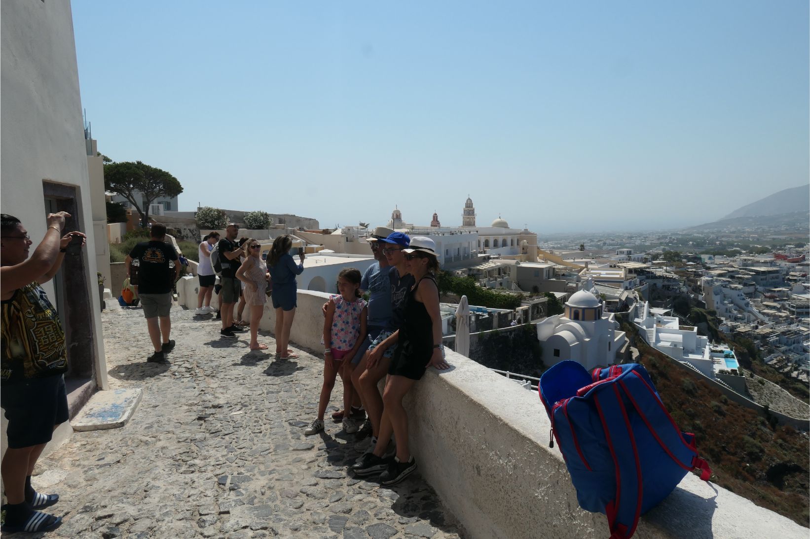 I got up early this morning and sat on the balcony checking websites, reading emails and watching the cruise ships sail in. I had a couple of the island’s many cats for company. Breakfast was at Volkan cafe, about 100 metres along the path from our place. We got a table right on the wall, looking directly down to the sea and out across the caldera – one of the best views you could ever wish to have while eating breakfast.