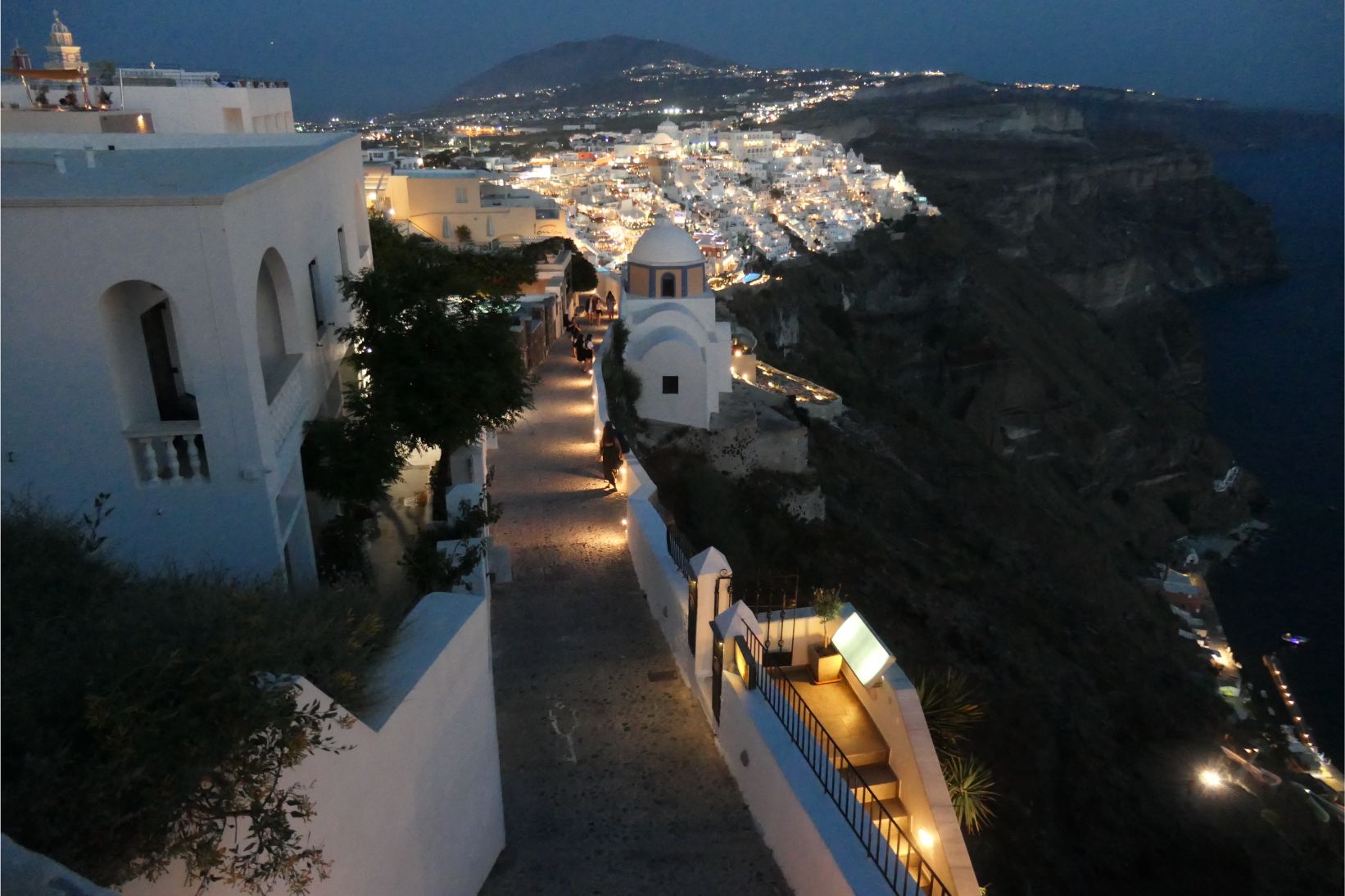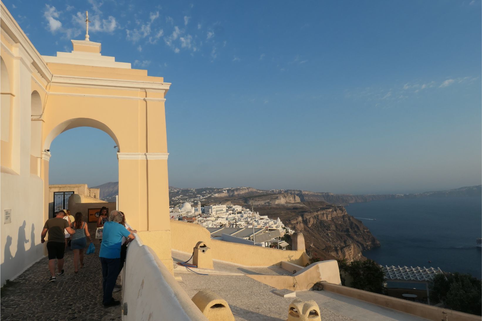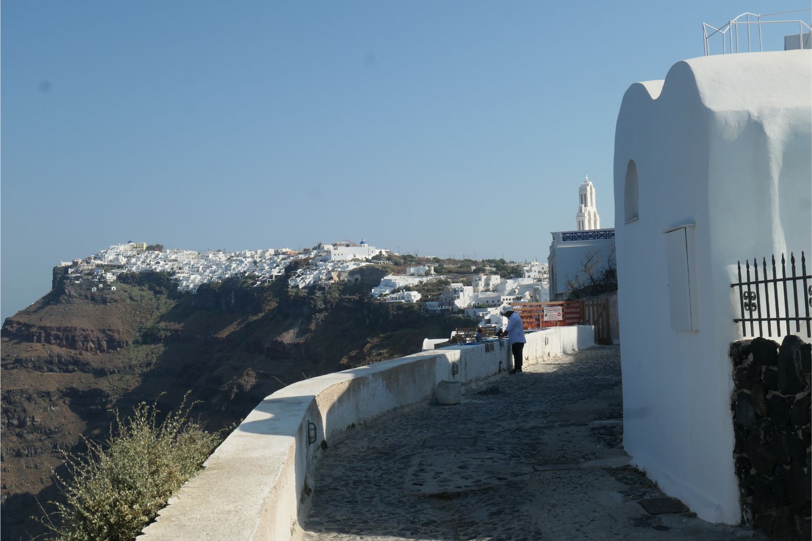 On our morning walk, Marg and I had to keep stepping around people on the path taking photos and selfies. That’s understandable. You don’t find backdrops like this one too often. The morning sun was out and the white buildings looked magnificent, especially when contrasted with the blue gates and doors and the blue sea. The stark contrast between blue and white on this island is really quite striking.