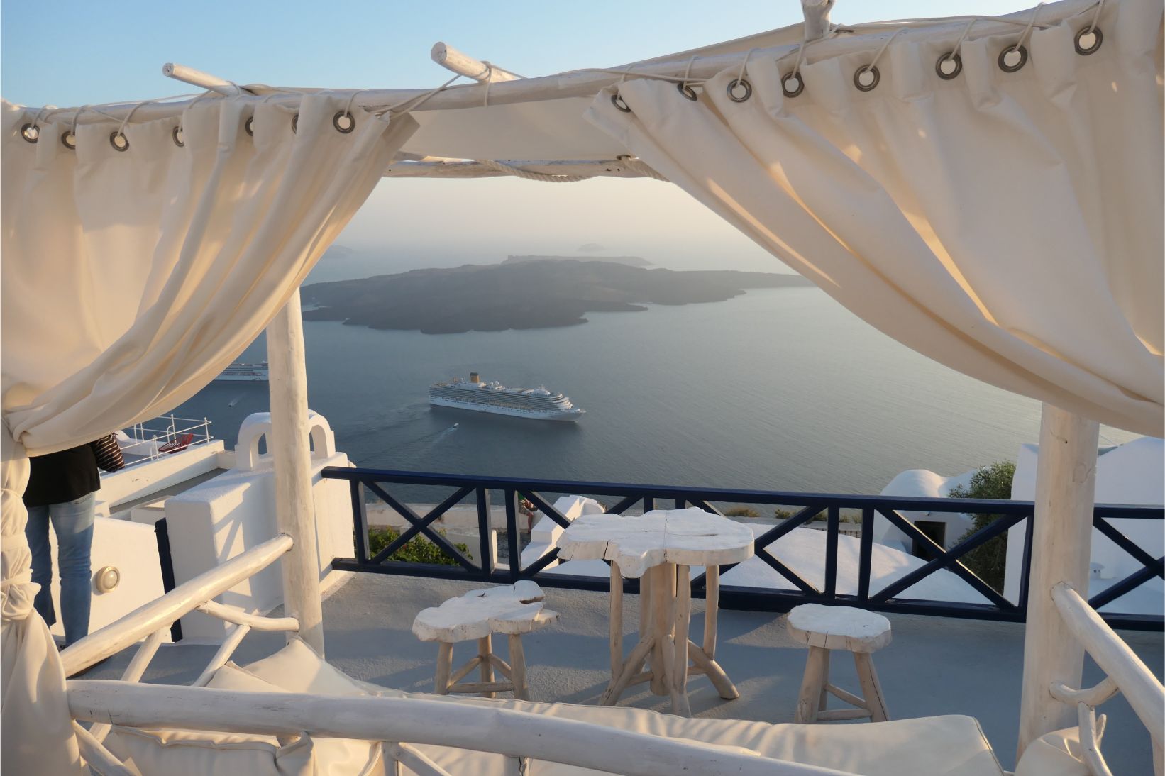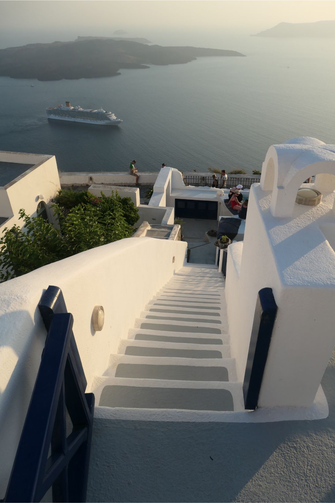So here we are in Greece, our fifteenth country on this trip, and our last. I’ve booked a cave house on AirBnB (photos below) high up on the hill overlooking the caldera in Thira. The views, as you can see, are quite spectacular. We have to climb 39 steps to get to our front door from the lane below. There were three cruise ships anchored just offshore when we arrived. One left while we were having dinner and another went at about 9.30pm. It looks like the third ship might still be here in the morning. The weather is a balmy 30-something degrees, although there is a cool breeze as I sit typing this on the balcony. I think we must have one of the prime locations on Santorini because this view is simply stunning.