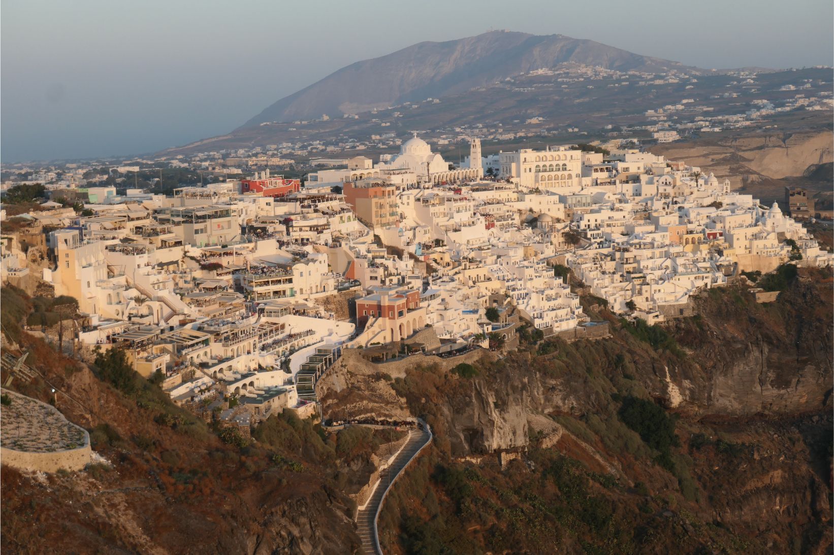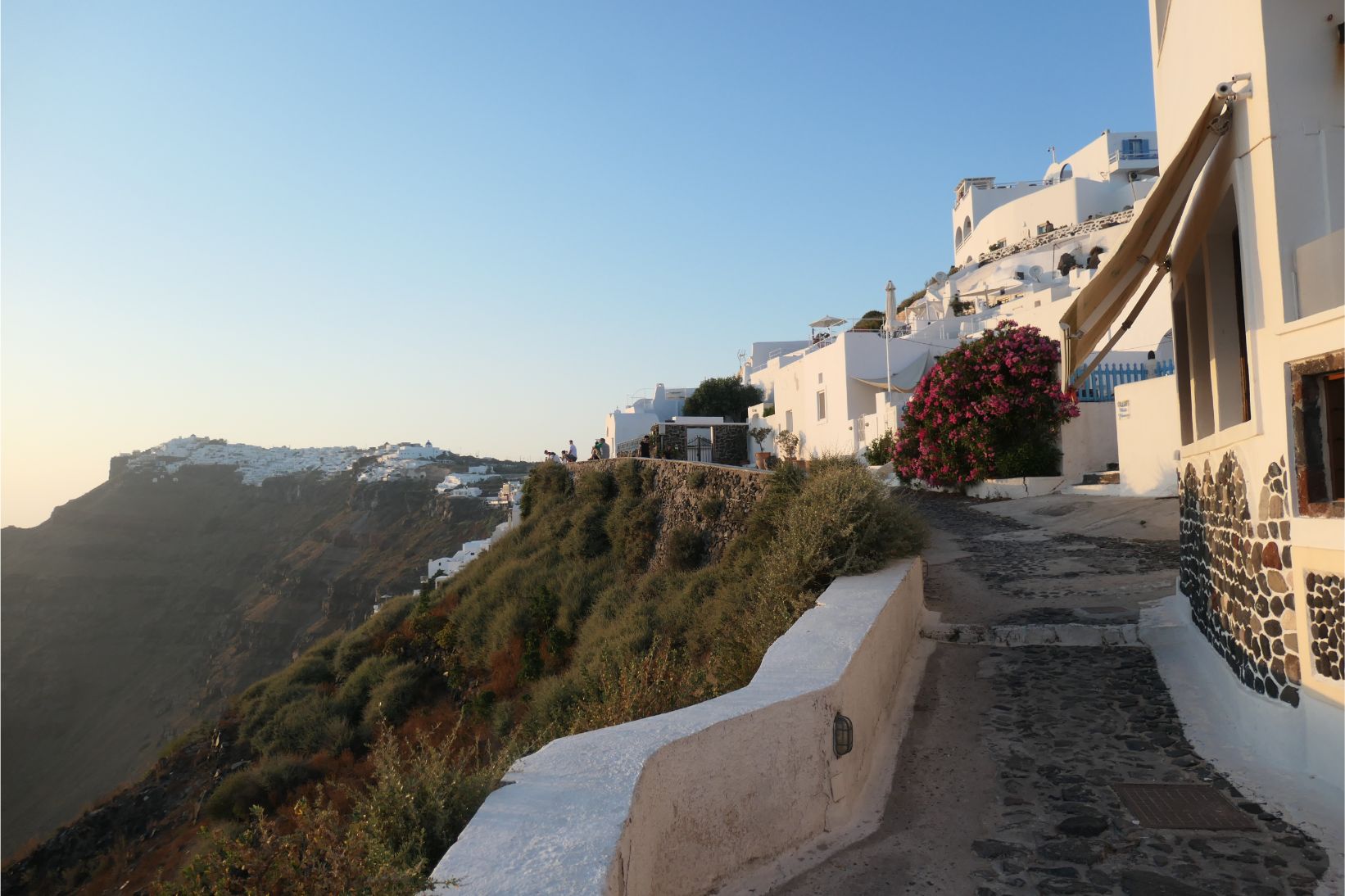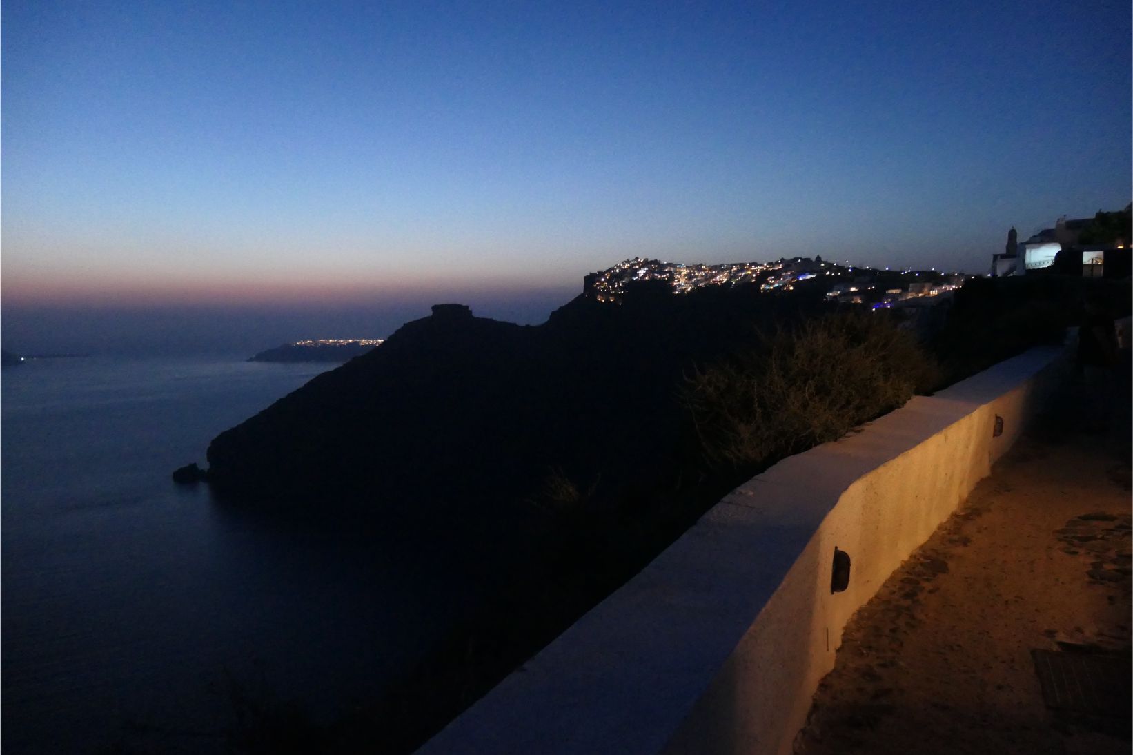 We found a really nice bar/cafe just a few doors from where we are staying. We were given a table overlooking Thira and its harbour, so we sat and watched the sun go down and the lights of the town gradually come on. It was quite magical. I’m very happy just thinking about doing the same thing for the next four nights too. And for our first night in Greece, Marg had a haloumi dish, which she said was superb and I had marinated octopus, which was also amazing.