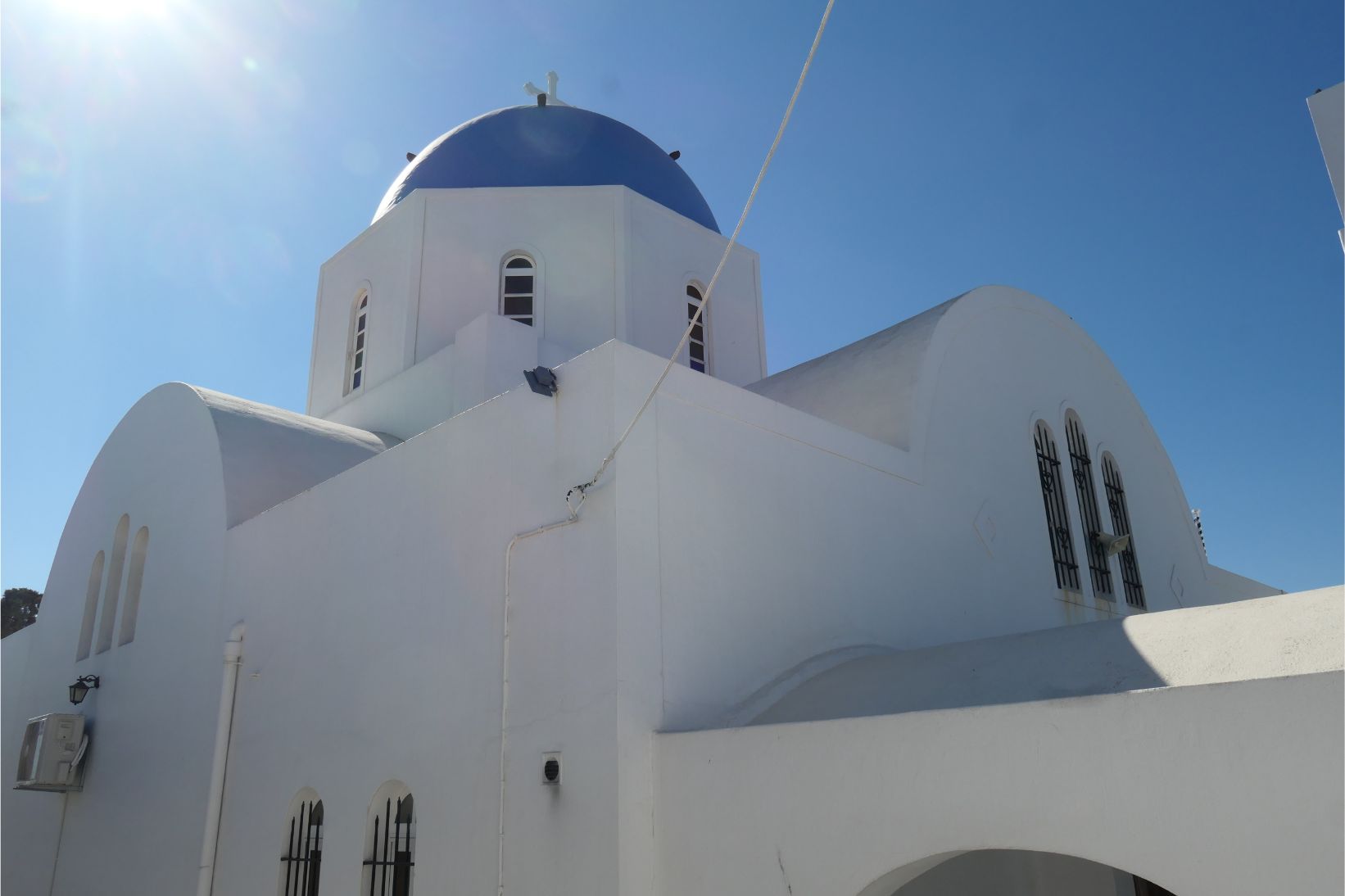 Sunglasses are an essential here, as the glare of the sun reflecting off the stark white surfaces is very strong. Not that I’m complaining, of course. The great beauty of Santorini is its white surfaces with occasional patches of blue. The blue roofs, gates and doorways are so much in harmony with the colour of the sea here. If you owned a paint store on Santorini, it would be a waste of time and money stocking any other colours. We found a guy whitewashing a wall. He must be just about the most employable man on the island.