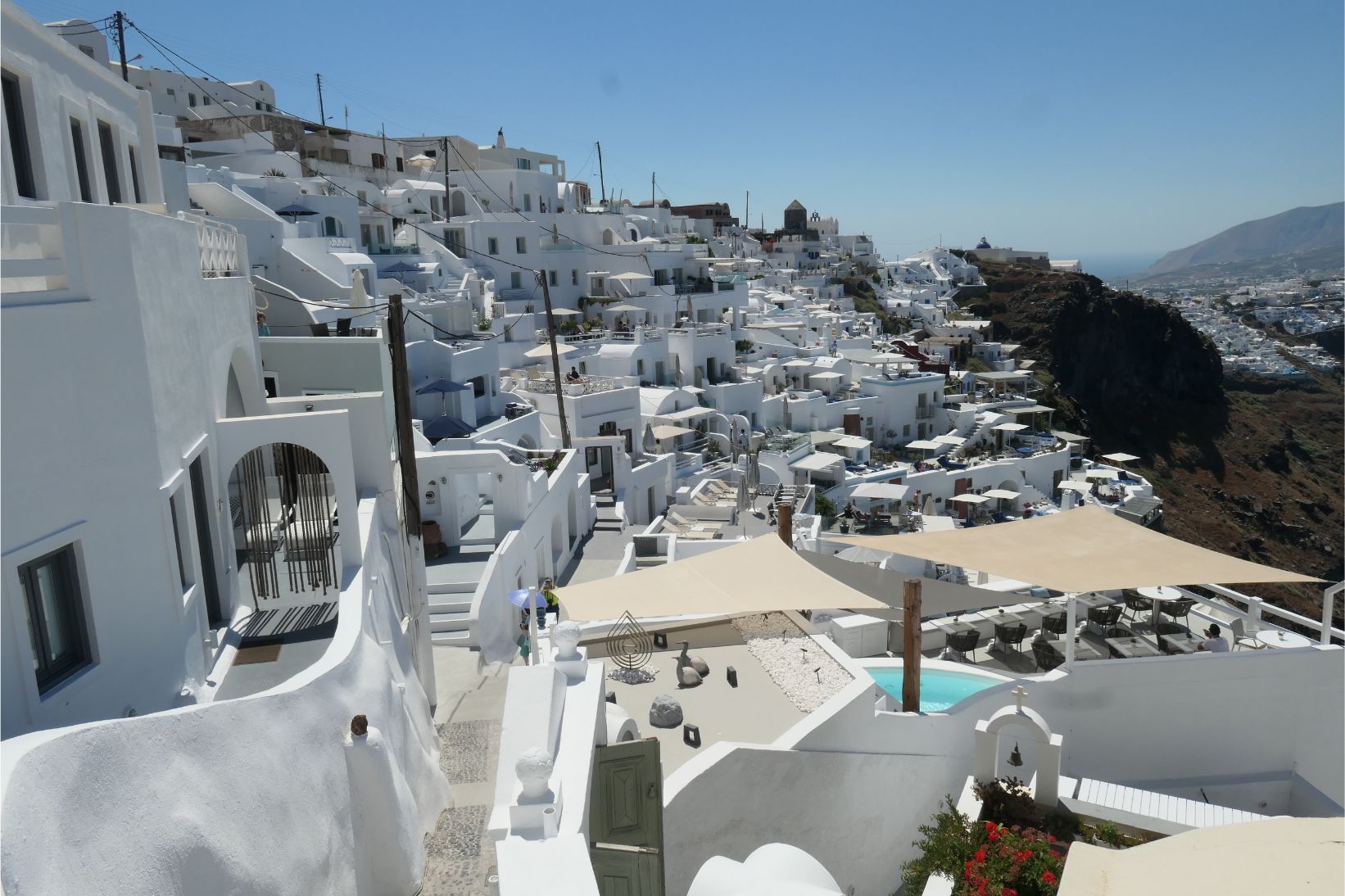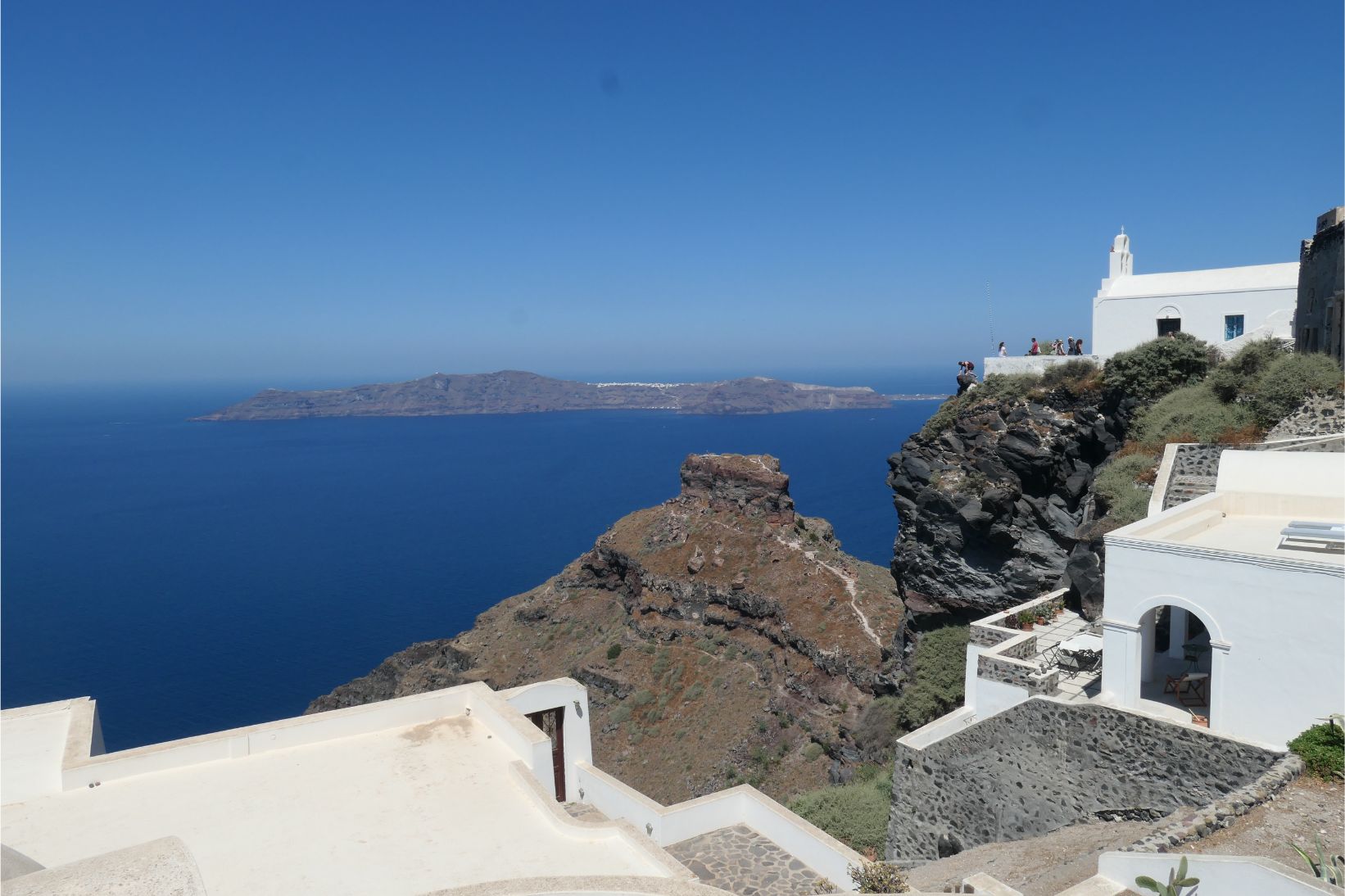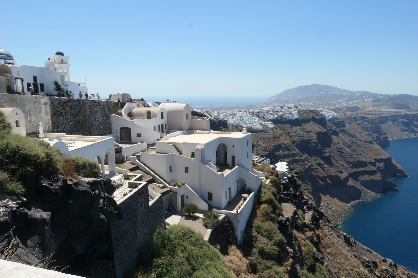 Determined to avoid walking in full sun during the hottest part of the day, Marg and I left our cave house studio earlier this morning and headed north along the winding hilltop path to Imerovigli. We took our time, stopping often to enjoy the views, take a photo or take a break wherever there was a cool breeze blowing. Needless to say, this is a spectacular walk, with so many beautiful vantage points. It’s no wonder there are holiday accommodation places all the way along the path. This walk took us away from Thira, so there were only regular holiday makers here and it was much easier making our way along the cobblestones when we didn’t have to battle the hordes that come in every day from the cruise ships.