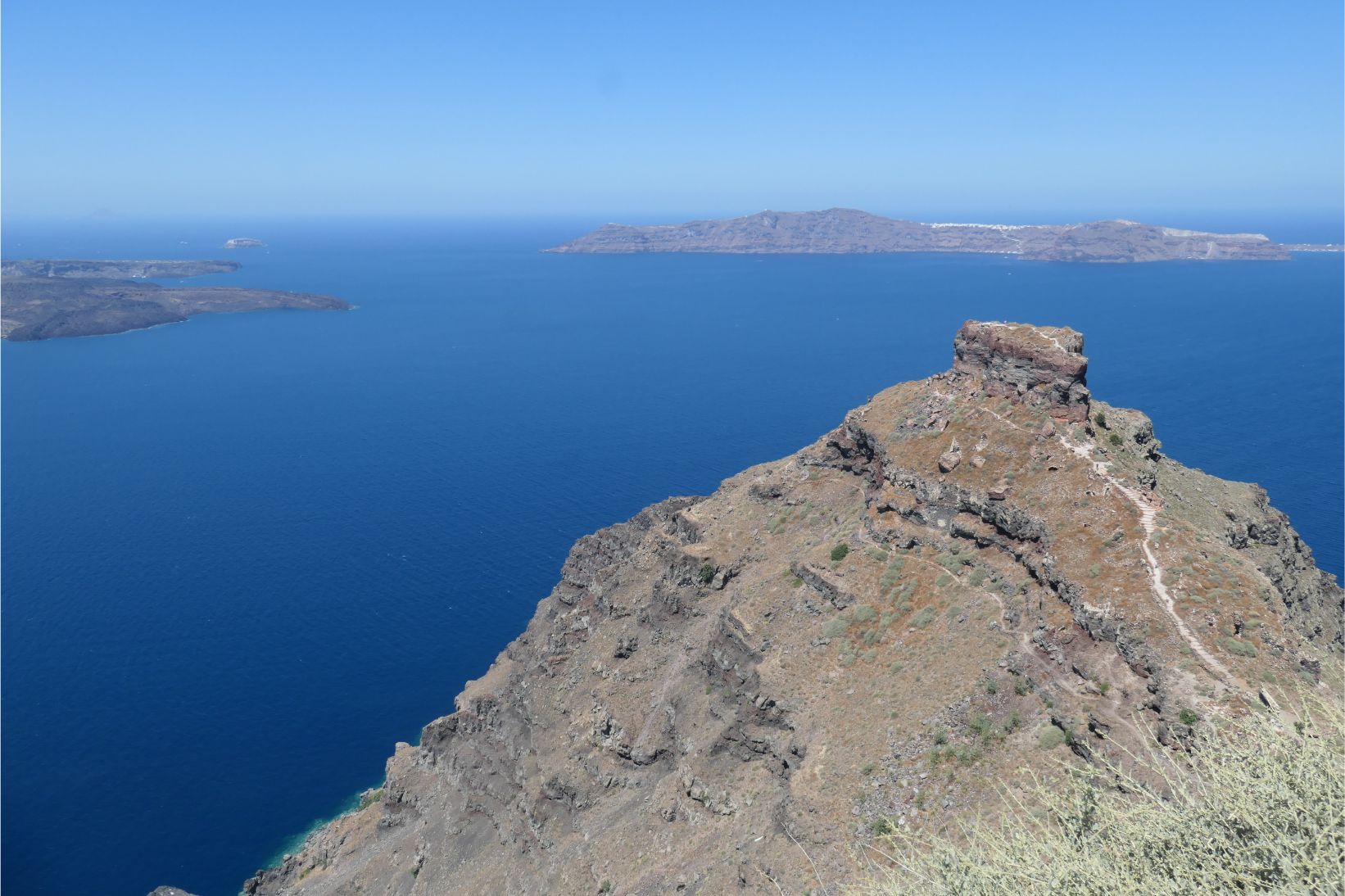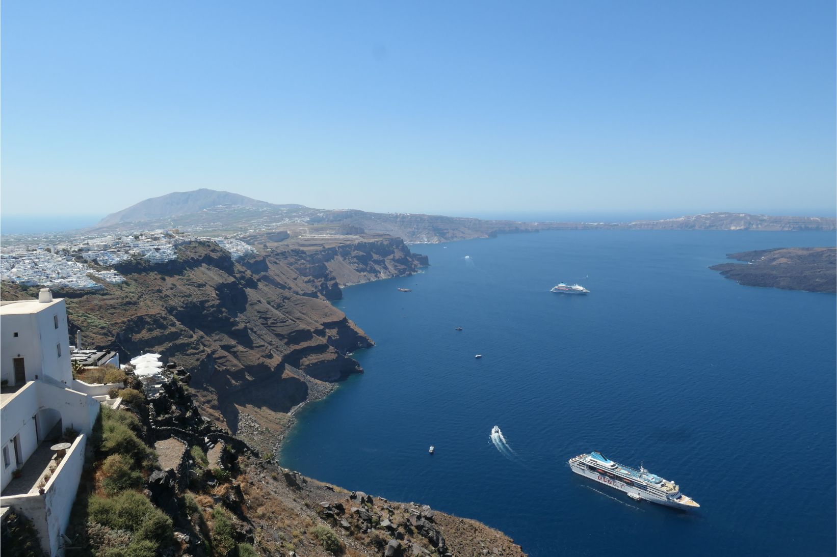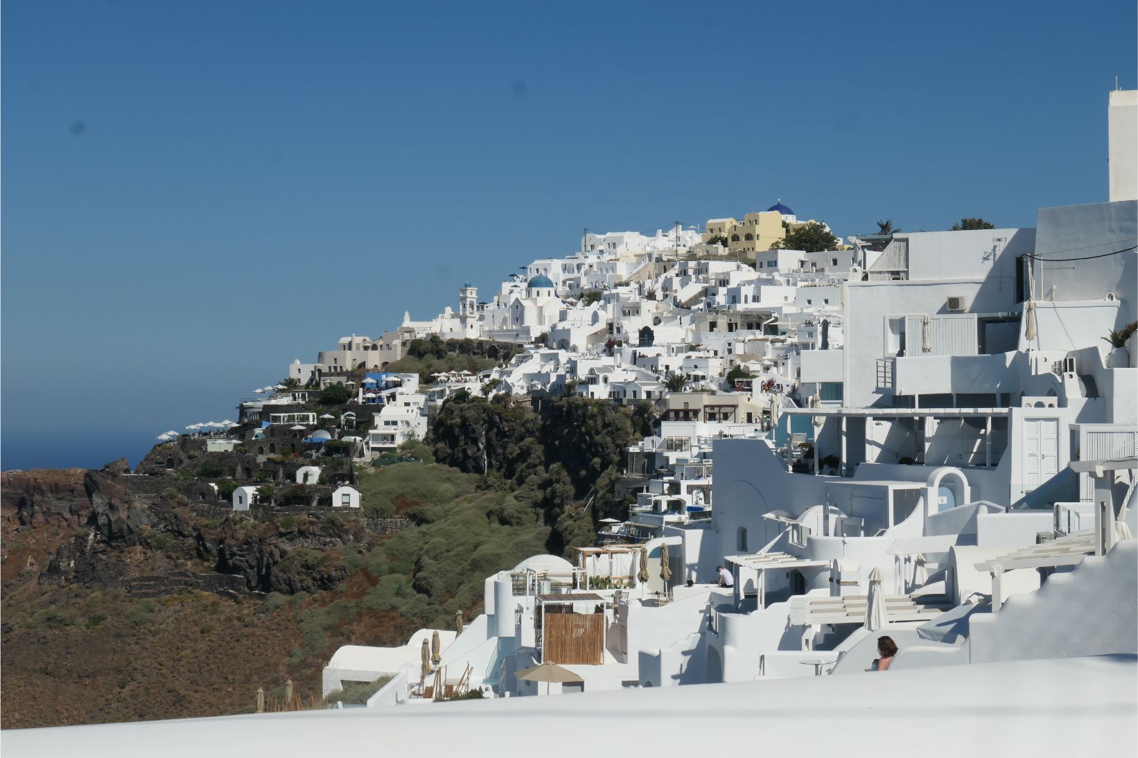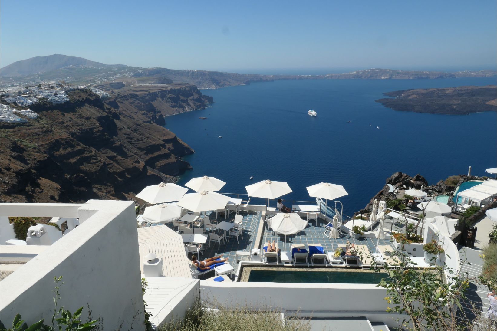 Determined to avoid walking in full sun during the hottest part of the day, Marg and I left our cave house studio earlier this morning and headed north along the winding hilltop path to Imerovigli. We took our time, stopping often to enjoy the views, take a photo or take a break wherever there was a cool breeze blowing. Needless to say, this is a spectacular walk, with so many beautiful vantage points. It’s no wonder there are holiday accommodation places all the way along the path. This walk took us away from Thira, so there were only regular holiday makers here and it was much easier making our way along the cobblestones when we didn’t have to battle the hordes that come in every day from the cruise ships.