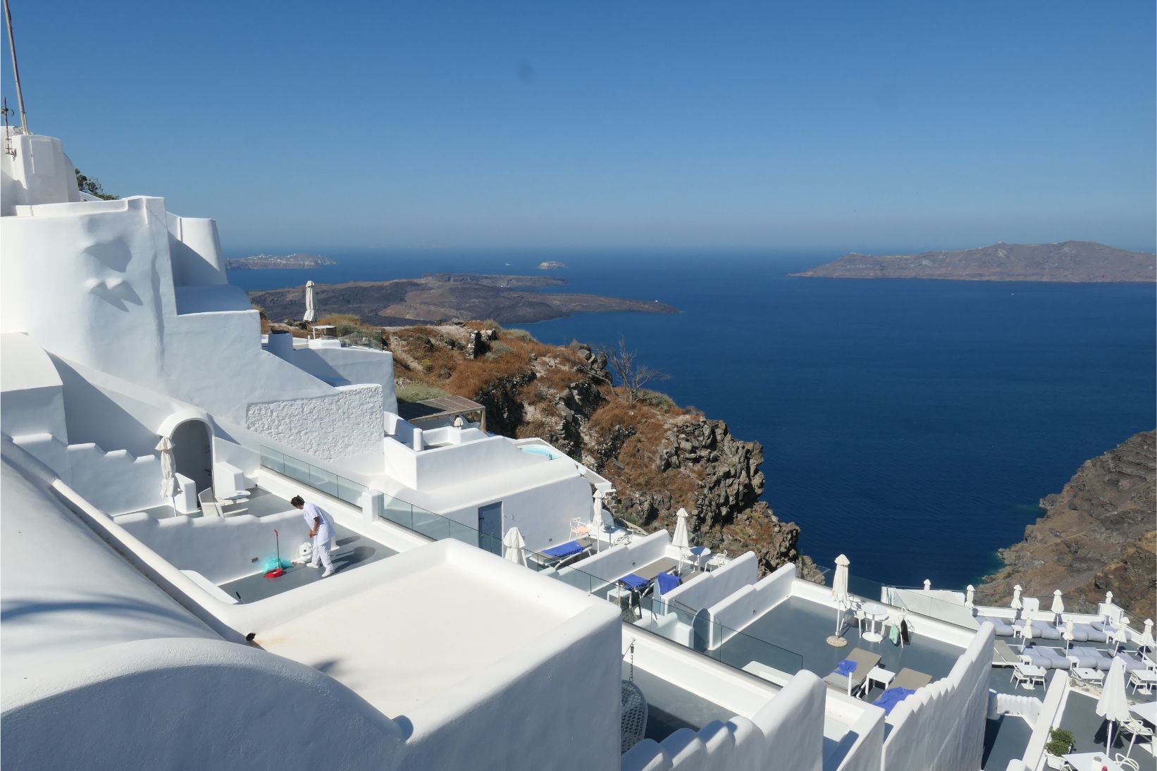 Sunglasses are an essential here, as the glare of the sun reflecting off the stark white surfaces is very strong. Not that I’m complaining, of course. The great beauty of Santorini is its white surfaces with occasional patches of blue. The blue roofs, gates and doorways are so much in harmony with the colour of the sea here. If you owned a paint store on Santorini, it would be a waste of time and money stocking any other colours. We found a guy whitewashing a wall. He must be just about the most employable man on the island.