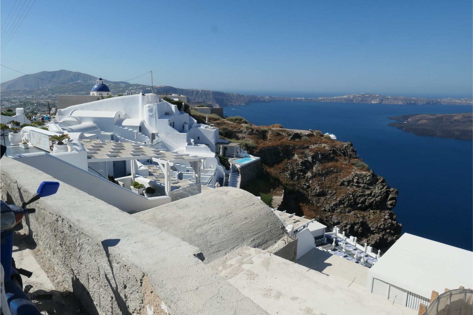Sunglasses are an essential here, as the glare of the sun reflecting off the stark white surfaces is very strong. Not that I’m complaining, of course. The great beauty of Santorini is its white surfaces with occasional patches of blue. The blue roofs, gates and doorways are so much in harmony with the colour of the sea here. If you owned a paint store on Santorini, it would be a waste of time and money stocking any other colours. We found a guy whitewashing a wall. He must be just about the most employable man on the island.