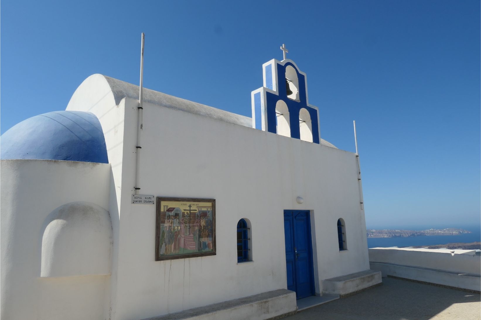 Sunglasses are an essential here, as the glare of the sun reflecting off the stark white surfaces is very strong. Not that I’m complaining, of course. The great beauty of Santorini is its white surfaces with occasional patches of blue. The blue roofs, gates and doorways are so much in harmony with the colour of the sea here. If you owned a paint store on Santorini, it would be a waste of time and money stocking any other colours. We found a guy whitewashing a wall. He must be just about the most employable man on the island.