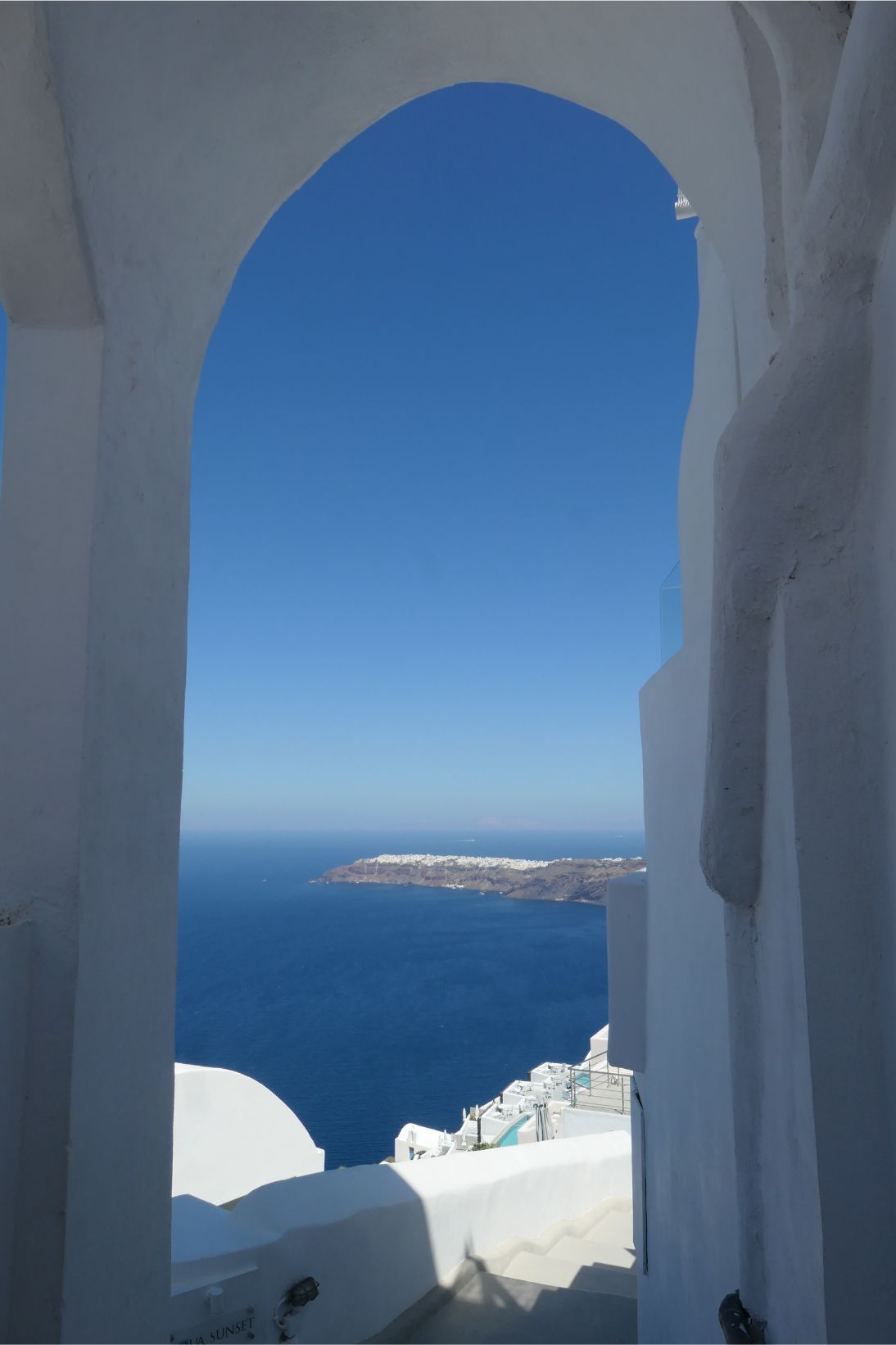 Sunglasses are an essential here, as the glare of the sun reflecting off the stark white surfaces is very strong. Not that I’m complaining, of course. The great beauty of Santorini is its white surfaces with occasional patches of blue. The blue roofs, gates and doorways are so much in harmony with the colour of the sea here. If you owned a paint store on Santorini, it would be a waste of time and money stocking any other colours. We found a guy whitewashing a wall. He must be just about the most employable man on the island.