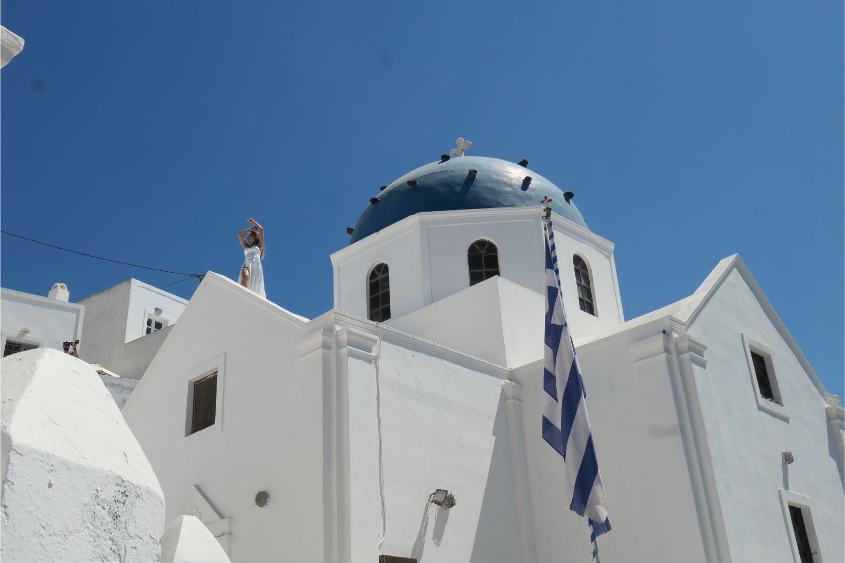 Sunglasses are an essential here, as the glare of the sun reflecting off the stark white surfaces is very strong. Not that I’m complaining, of course. The great beauty of Santorini is its white surfaces with occasional patches of blue. The blue roofs, gates and doorways are so much in harmony with the colour of the sea here. If you owned a paint store on Santorini, it would be a waste of time and money stocking any other colours. We found a guy whitewashing a wall. He must be just about the most employable man on the island.
