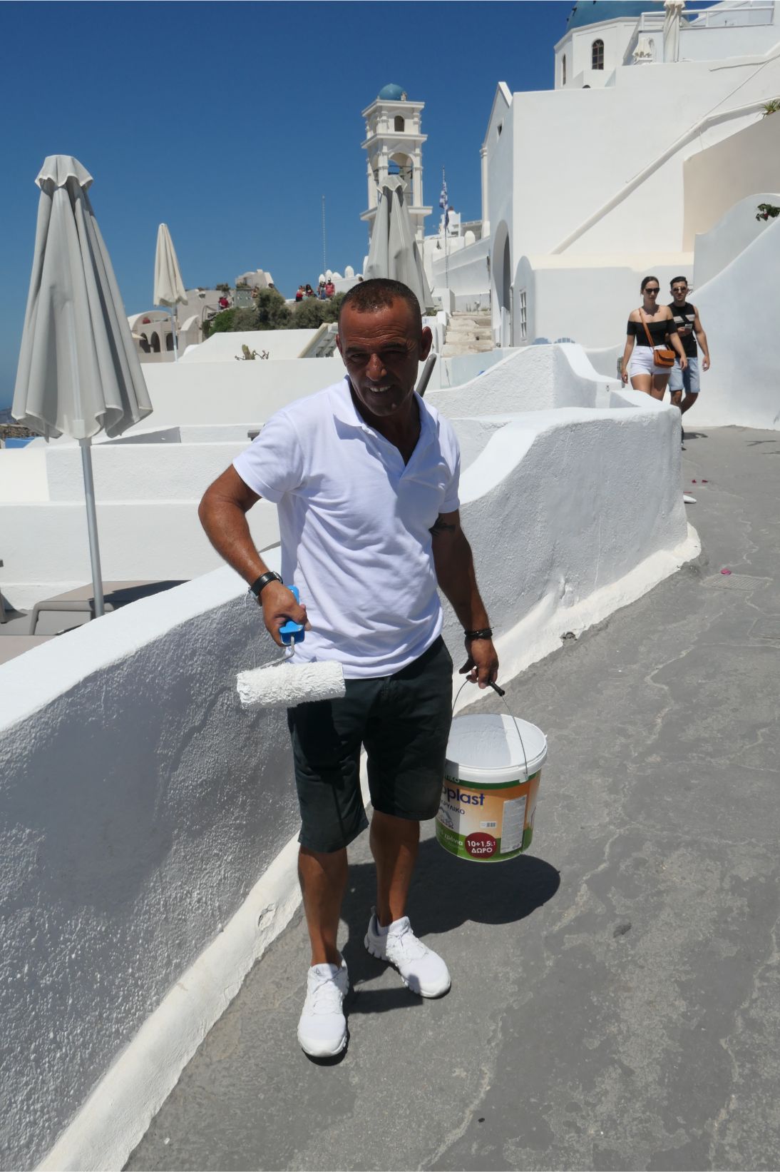 Sunglasses are an essential here, as the glare of the sun reflecting off the stark white surfaces is very strong. Not that I’m complaining, of course. The great beauty of Santorini is its white surfaces with occasional patches of blue. The blue roofs, gates and doorways are so much in harmony with the colour of the sea here. If you owned a paint store on Santorini, it would be a waste of time and money stocking any other colours. We found a guy whitewashing a wall. He must be just about the most employable man on the island.