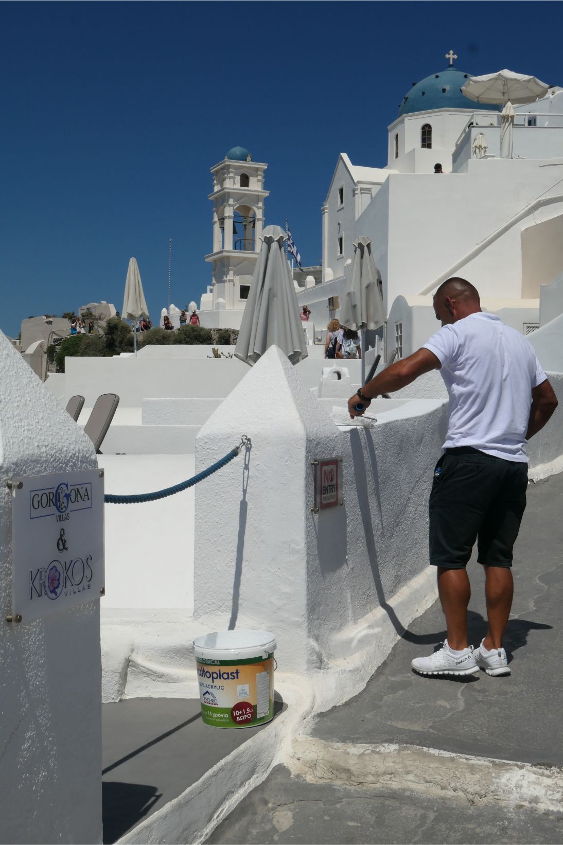 Sunglasses are an essential here, as the glare of the sun reflecting off the stark white surfaces is very strong. Not that I’m complaining, of course. The great beauty of Santorini is its white surfaces with occasional patches of blue. The blue roofs, gates and doorways are so much in harmony with the colour of the sea here. If you owned a paint store on Santorini, it would be a waste of time and money stocking any other colours. We found a guy whitewashing a wall. He must be just about the most employable man on the island.