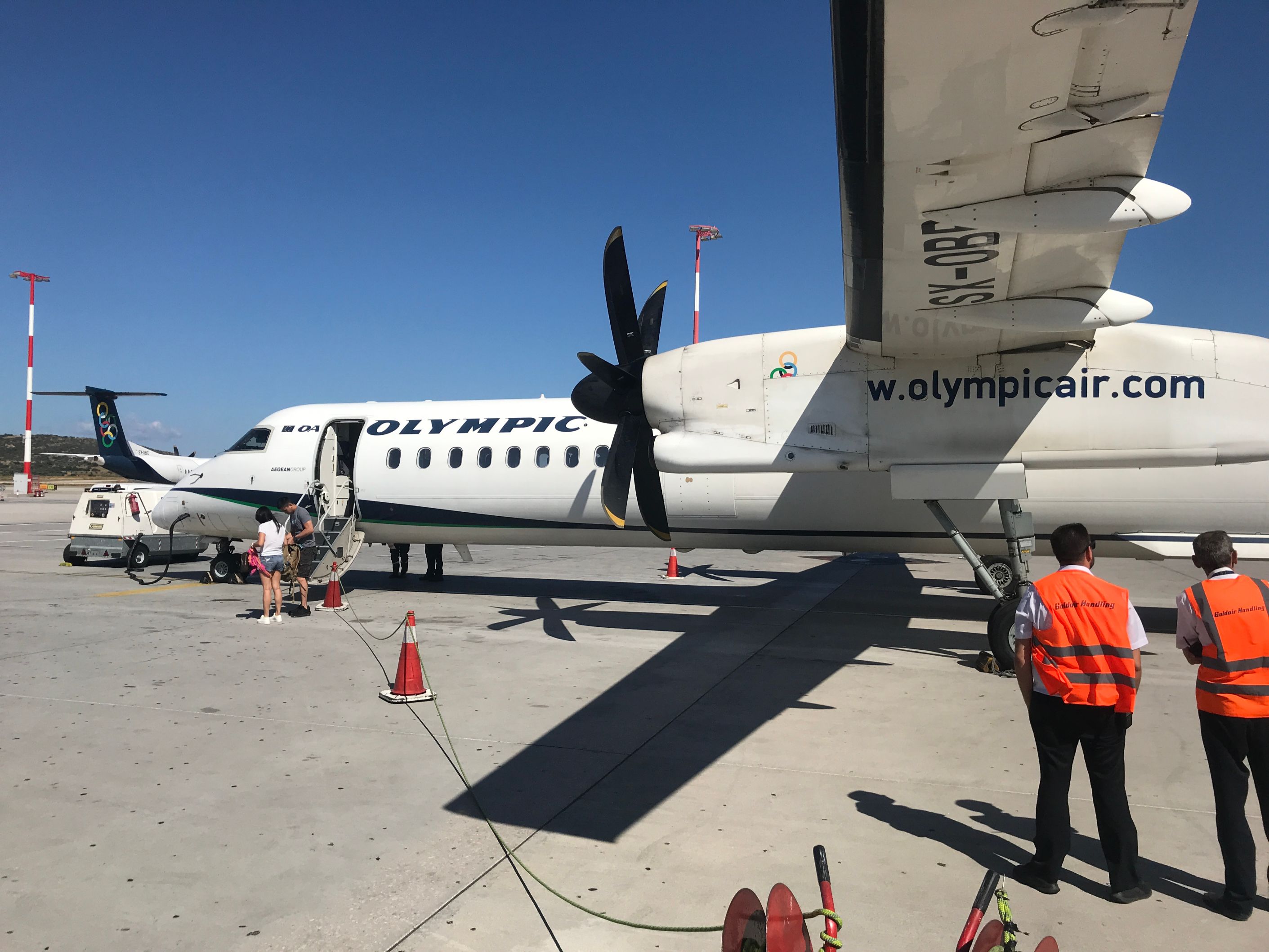So the staff printed us new boarding passes and held back our luggage. We were given the cash and the food and free flight vouchers. We moved upstairs to the cafe and found a couple of chairs, and that’s where we stayed for the next three hours. Eventually we went downstairs to the departure lounge again to find a similar crush of people waiting to fly out to other destinations. Eventually our Athens flight got away about 40 minutes later than it was supposed to, but we were glad to be in the air. The flight was a little rocky at times, due to the high winds that had swept across Santorini and other parts of Greece all day. Landing in Athens, we again felt the impact of the strong winds on our twin turbo-prop plane, and it was a little bumpy as we came in to land after the 40-minute flight.