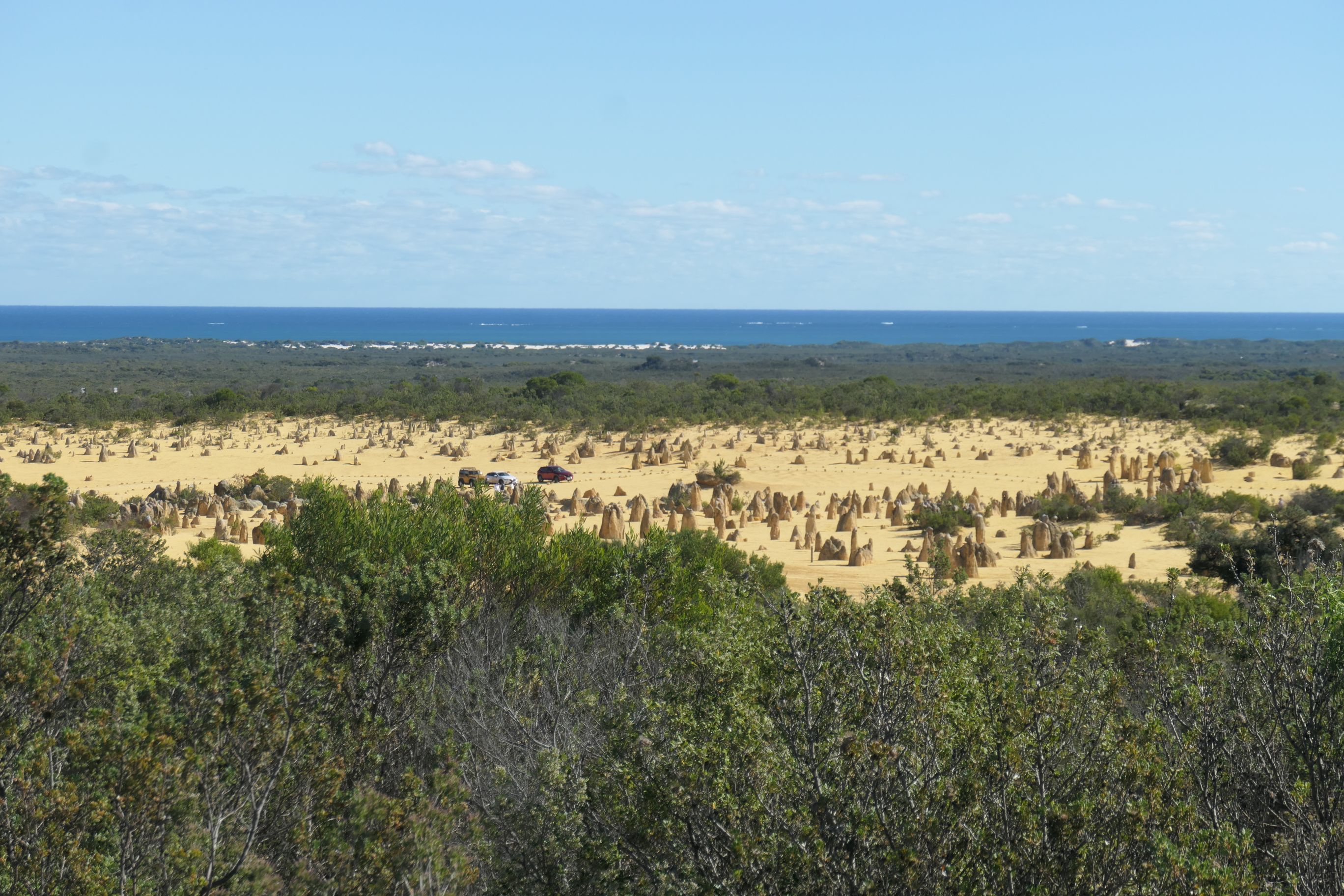 From Gingin, we returned to the coast highway. The leafy forests north of Perth had given way to lower, shrubby vegetation, which from time to time must have been exposed to fairly high winds and salty sprays from the Indian Ocean which lay just beyond the ridge to the west. Occasionally a high sand dune appeared above the trees. I’ve included a photo here, although it’s a little hard to see what it is as it was taken from a moving car.