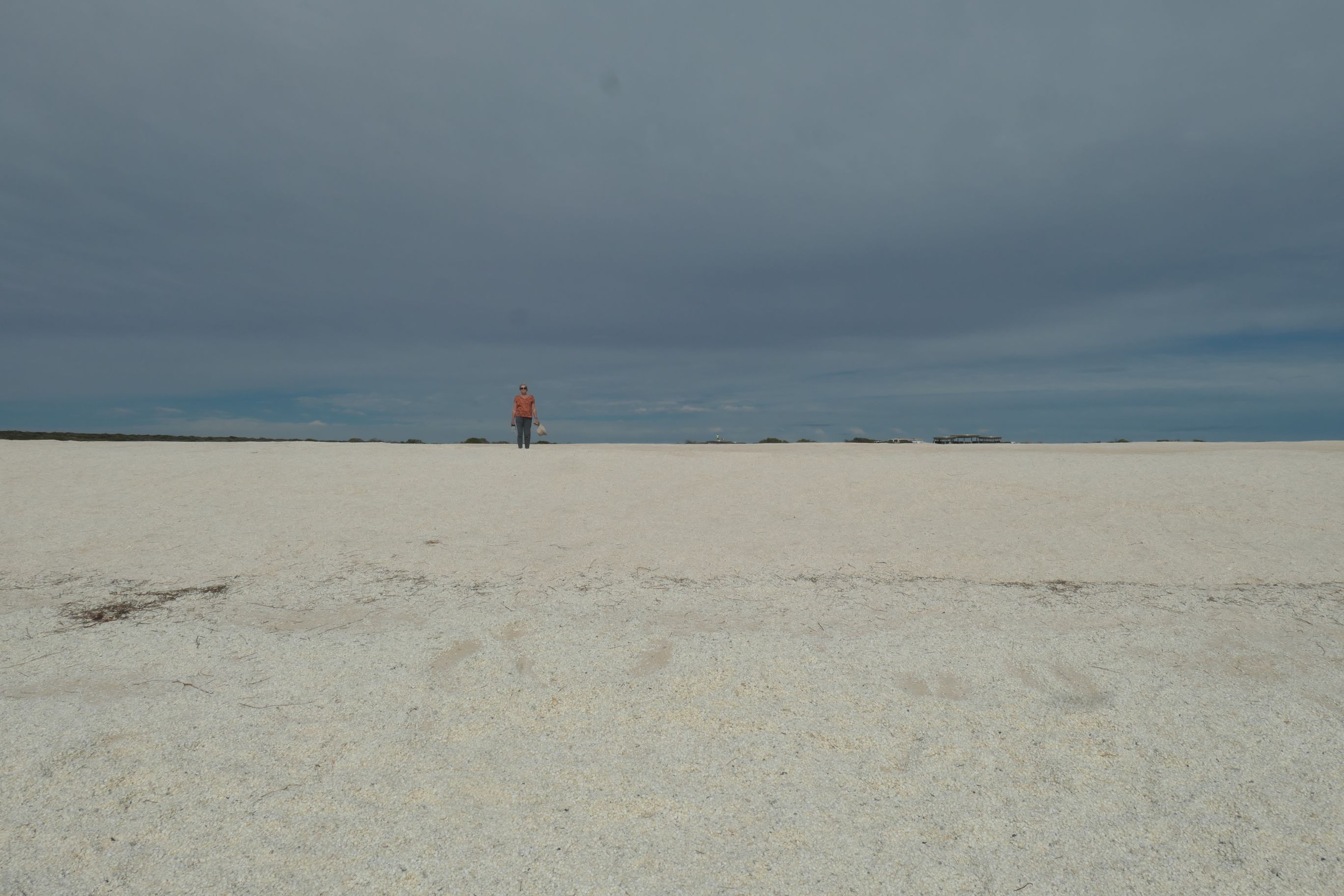 We stopped at Hamelin Pool to see the stromatolites. Hamelin Pool is one of only two places in the world with living marine stromatolites (the oldest living fossils on Earth). The metre-high stromatolites have grown over millions of years through a binding process of algae, sediment and sand. They only grow at the rate of 0.3mm per year. Unfortunately, when we reached the beach we found that Cyclone Seroja in April 2021 had destroyed the boardwalk. So although we were very close to these remarkable living organisms, we never got to see them. Soon after we called in to Shell Beach, where the tides deposit billions of tiny shells on the shore. In places, the shells have been laid down to a depth of 10 metres. The beautiful snow-white beach covers a 60km stretch and is entirely formed from shells – there is no sand.