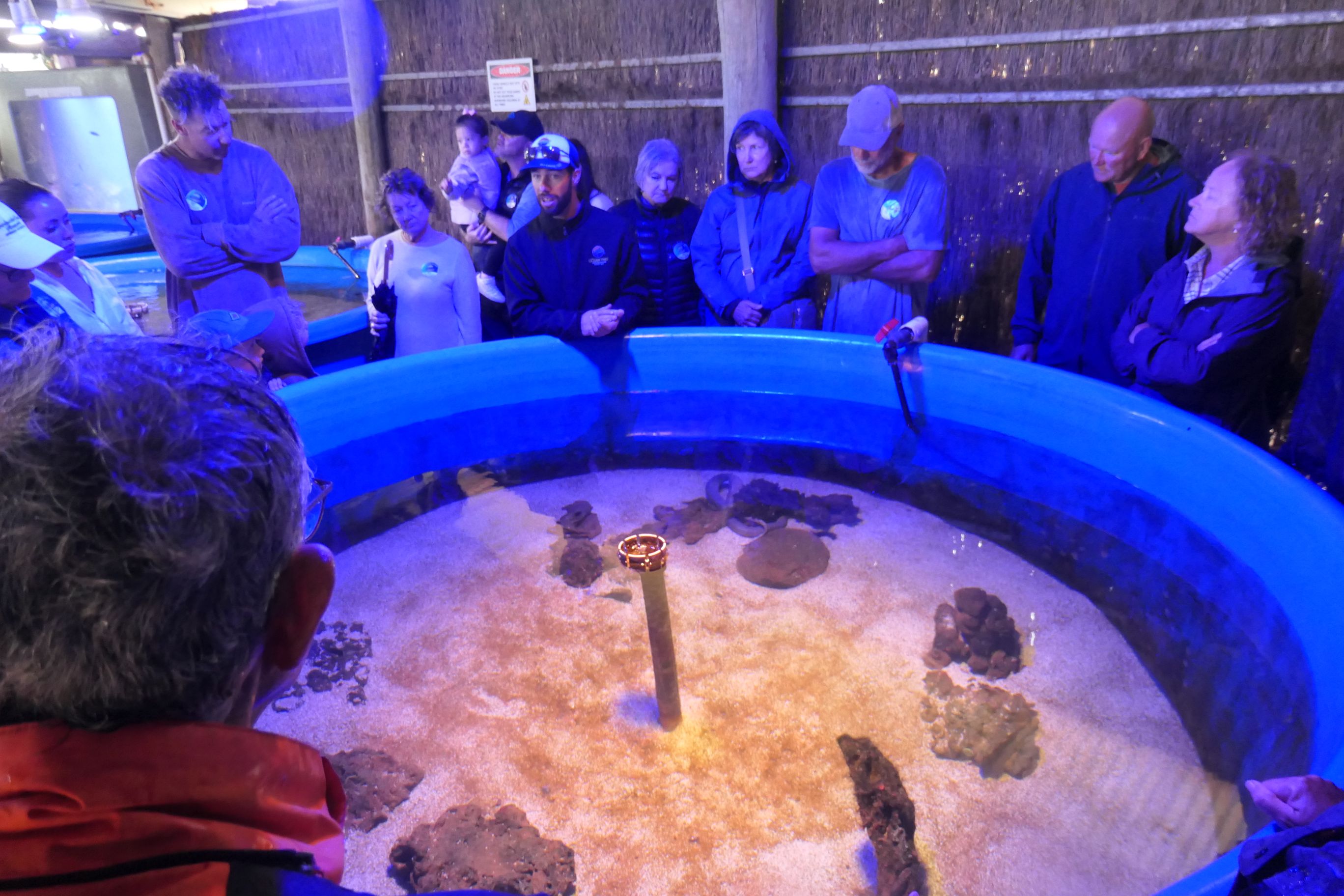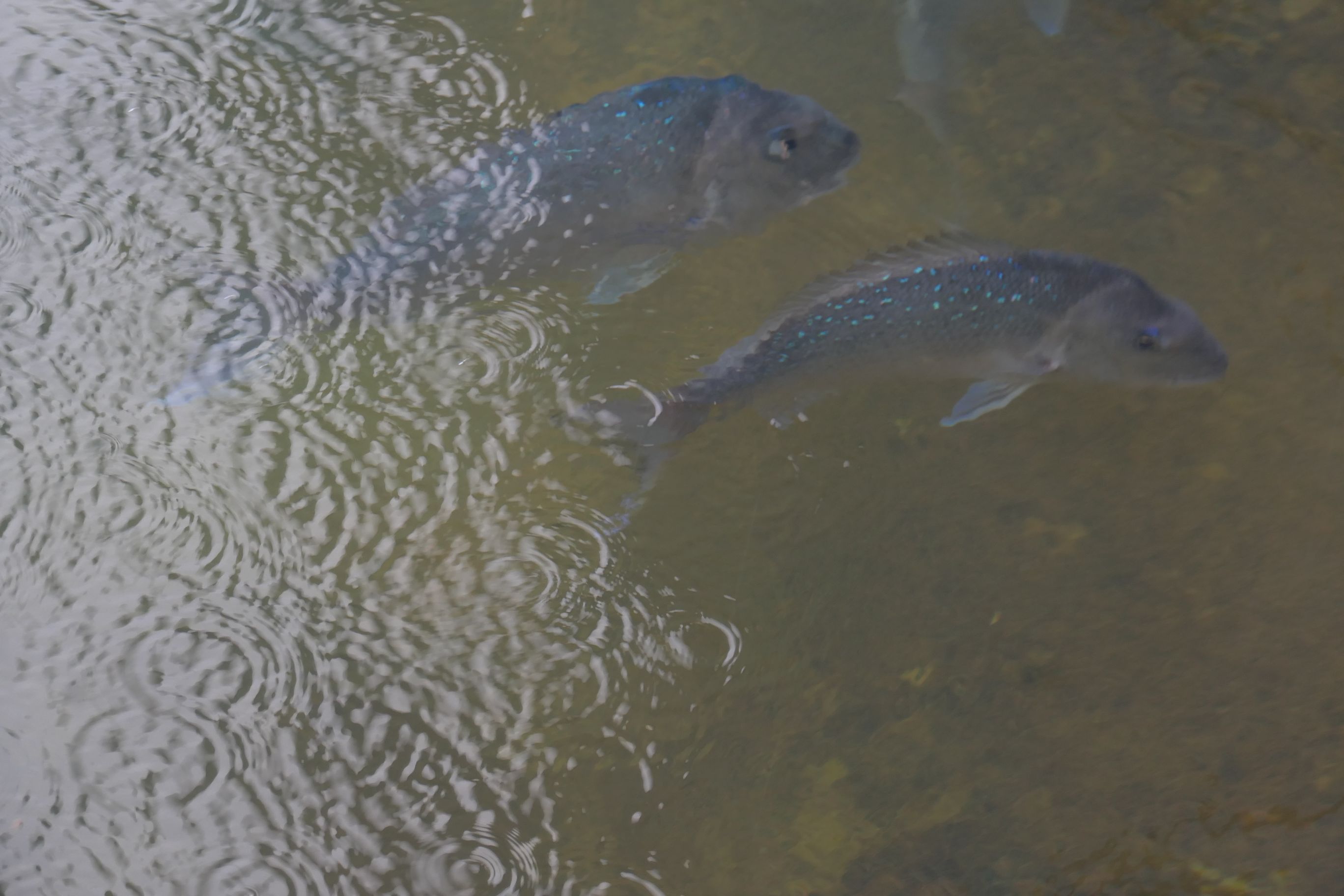 All of the marine life at the park is native to Shark Bay. There was a shallow tank to replicate the environment many of the creatures live in, which is only about one and a half metres deep for up to 500 metres distance from shore. Small lemon sharks and rays can be found there. We moved on to some larger pools with bigger fish, such as trevalley. The rain was coming down quite heavily as we moved to some outdoor pools with limited shelter. It was a bit of a challenge to see the fish in them clearly, especially with all the rain falling on the surface of the water.