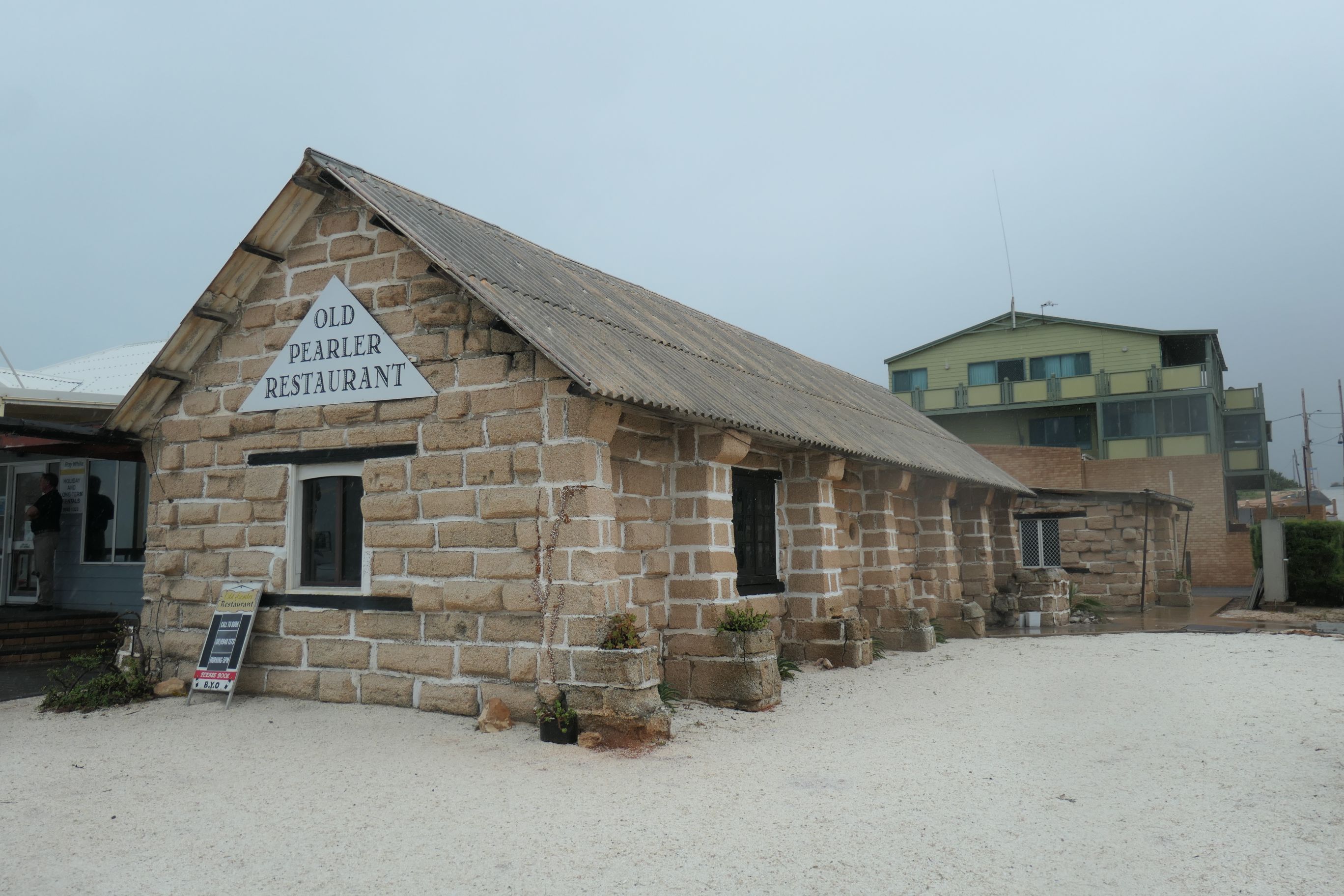 From there we drove a few more km into Denham. It was raining heavily so there was no chance to get out of the car and stroll around, though it looked like a fairly inviting sort of place. Instead, we only stopped to have a quick look at the Old Pearler Restaurant, built many years ago from blocks of quarried coquina shells from Shell Beach. Then we went into the tourist information centre to view the footage taken on the sea bed of the wrecks of HMAS Sydney II and the German raider Kormoran (see my Geraldton post). It was still raining heavily when we returned to our accommodation. We are keeping our hopes up that fine weather is on its way and that tomorrow our marine life cruise will be able to go ahead a day later than planned.