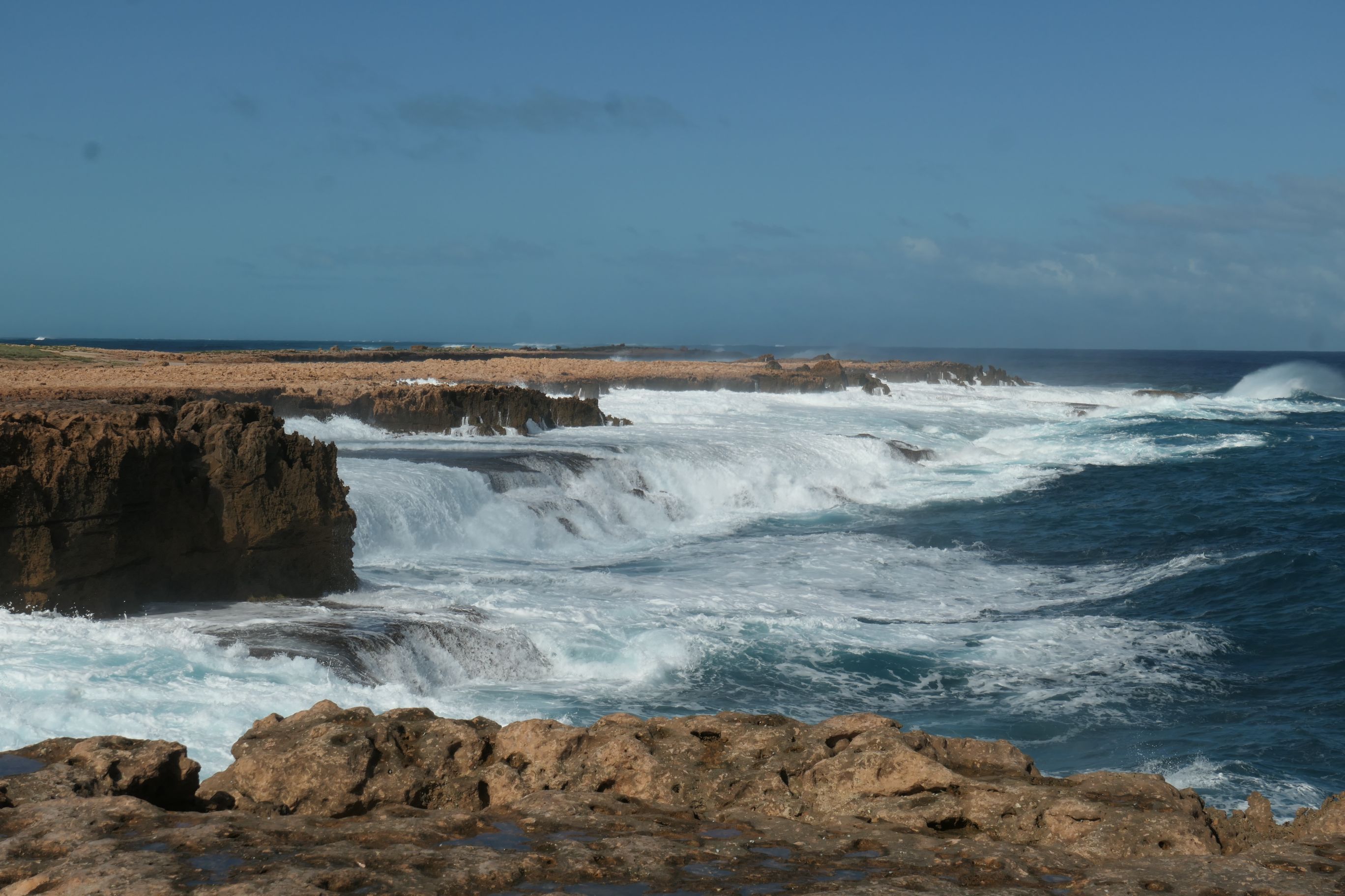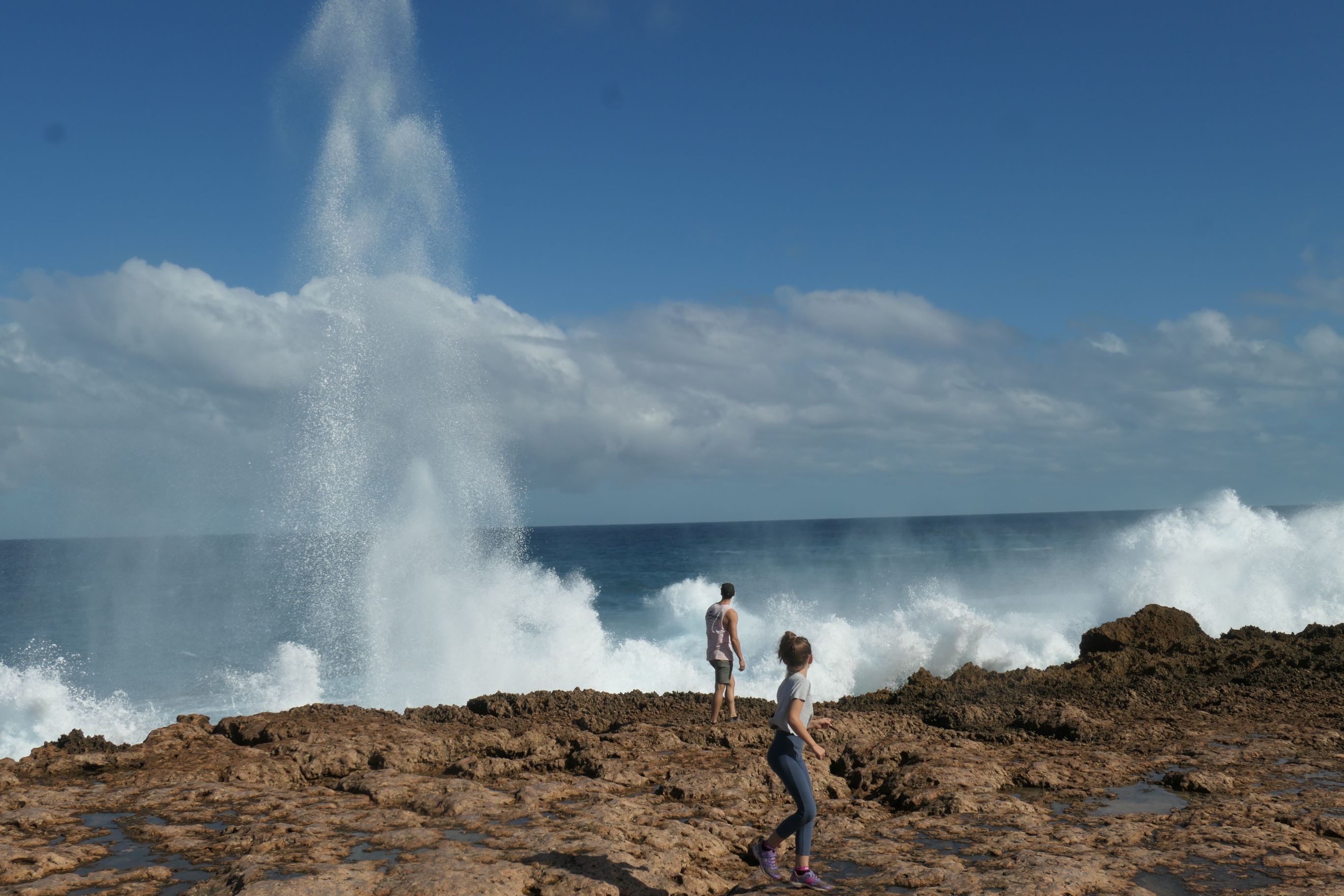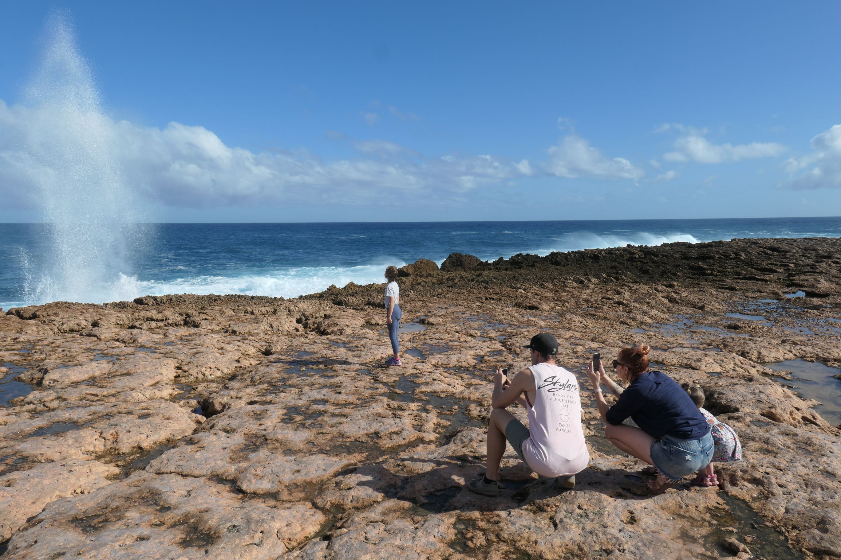 We would have driven north along the coastal road but it was closed, no doubt due to the heavy rain from the past few days. So instead we drove south, just a kilometre or two to the other side of the headland. Here was a tranquil lagoon known as the Aquarium. We could see the breakers at the Blowholes just over a ridge. It’s remarkable how the water could be so violent just a stone’s throw from a place where it was so peaceful and calm. Snorkelers were having a good time in the shallow waters of the lagoon, no doubt viewing plenty of fish and other marine life.