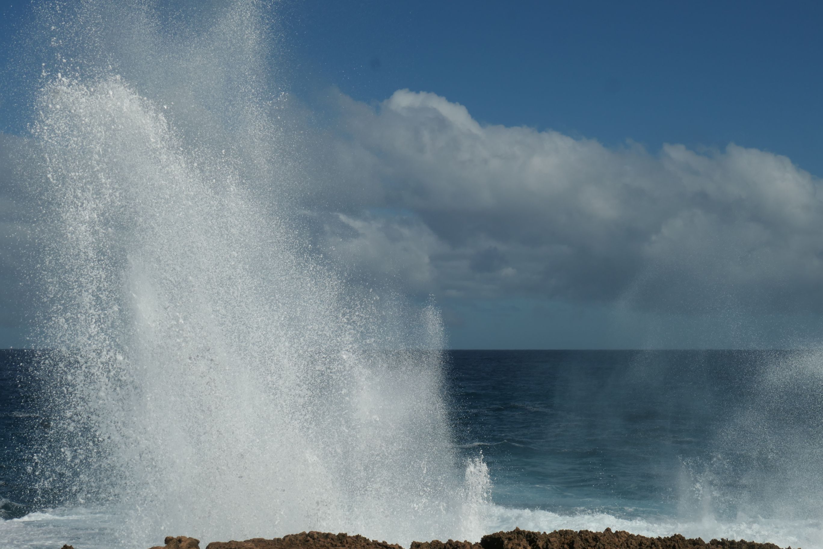 At the car park there was a small plaque in memory of a fisherman who got too close to the water. He obviously hadn’t paid much attention to the sign. We walked out across the rocks to a safe vantage point from where we could see plenty of wave action at the blowholes and down the coast to the south. There were some monstrous breakers coming in and smashing into the rocks, leading to some spectacular sprays.
