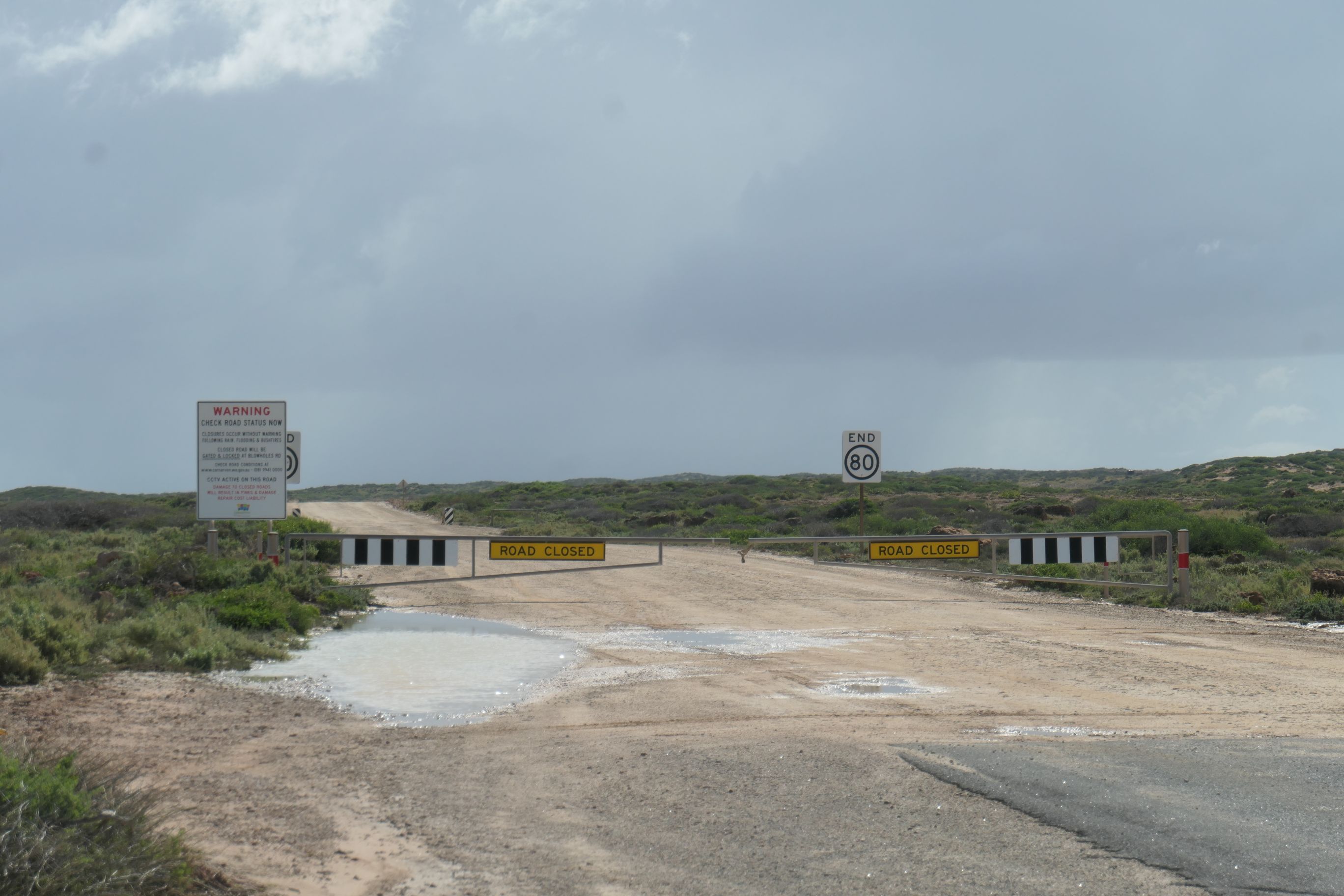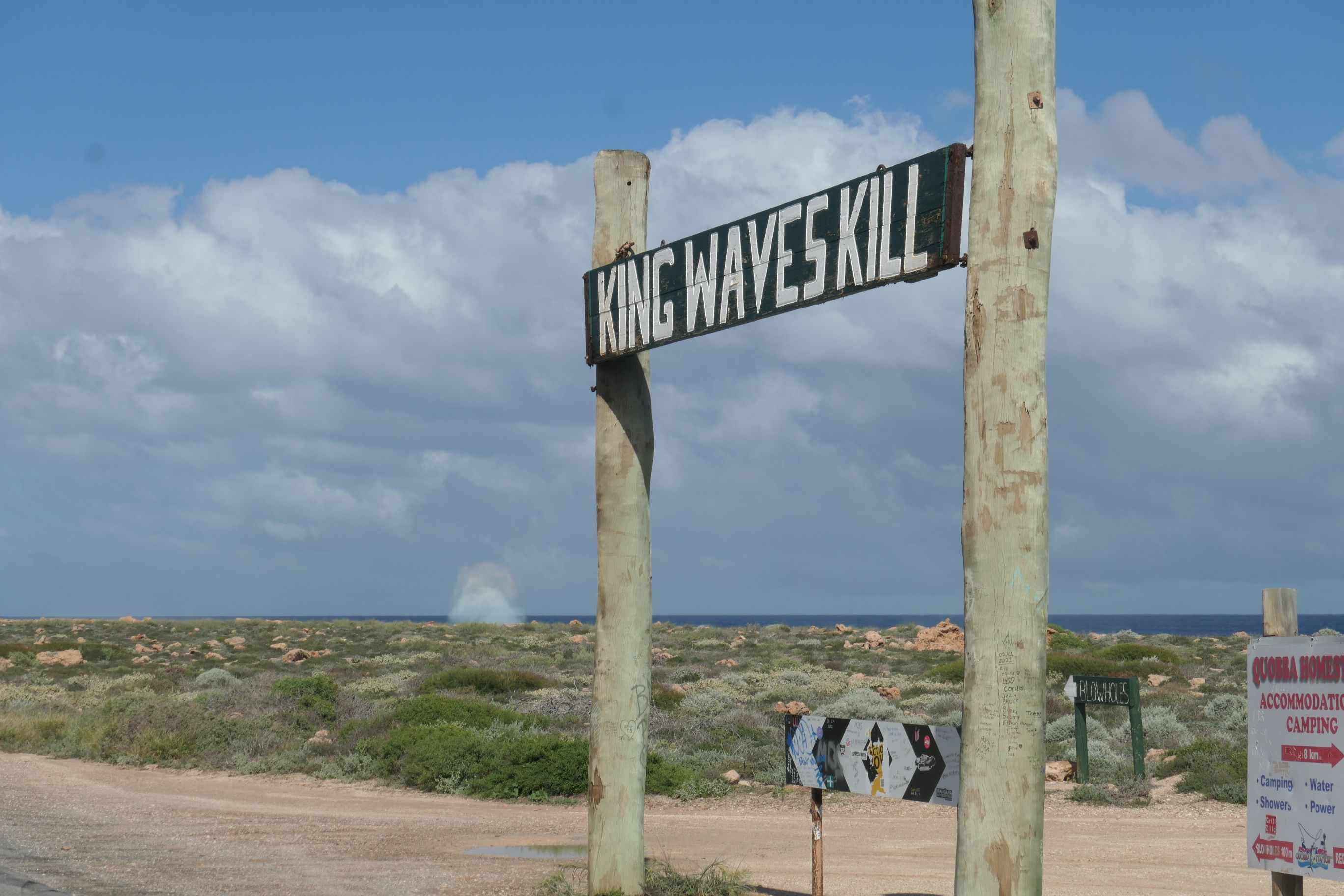 After breakfast we drove north to the Quobba Blowholes. There’s a turnoff not far out of Carnarvon that takes you all the way on a good sealed road. To the sides of the road there was plenty of water lying around, indicating that this region had also copped the heavy downpour we’d had at Monkey Mia. Lake Macleod is shown on maps as a dry salt lake, but a good deal of it was inundated as we drove past. We only encountered water across the road in a couple of places. Upon arrival at the blowholes, the first sign you see spells out in plain English ‘KING WAVES KILL’. Fair enough, I thought, I’m staying away from the edge.