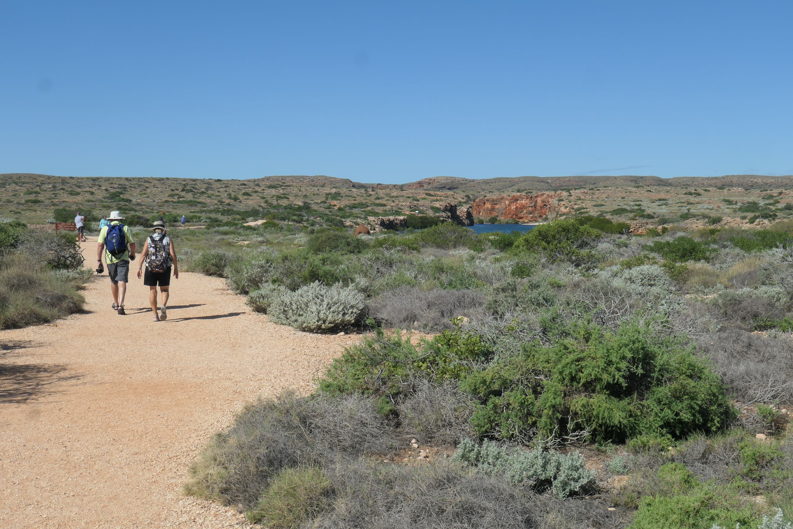 We stopped in at the tourist information centre in Exmouth for some advice on the roads to Karinjini, where we’re heading in a few days from now, picked up some take away lunch, then drove south into Cape Range National Park. The road ran between the limestone ridges to the east and the Ningaloo Reef to the west. We followed the road through to where it ended at Yardie Creek. After a quick bite to eat, Rod and Cornie headed off on the long trail along the Yardie Creek Gorge. Marg and I took the shorter option, the Yardie Creek Nature Walk.