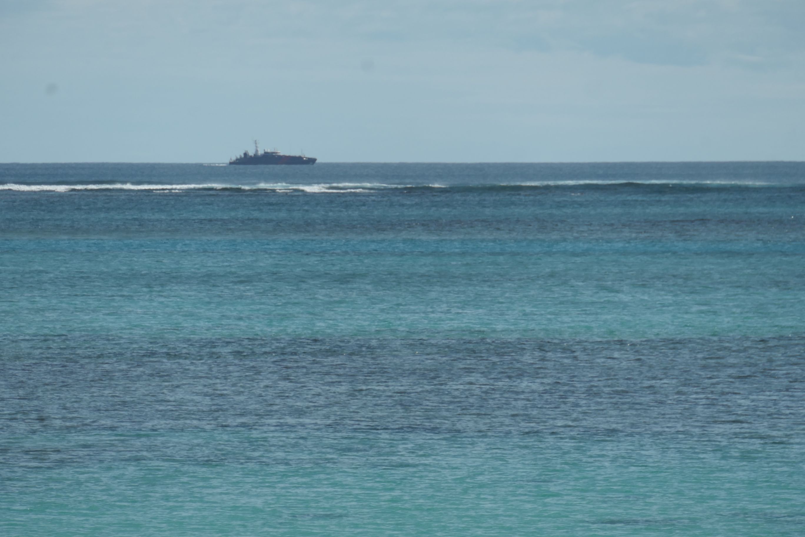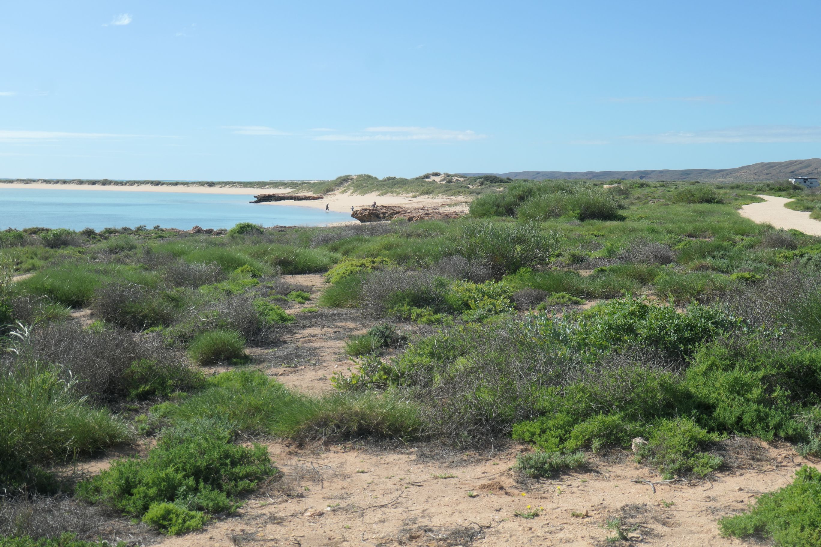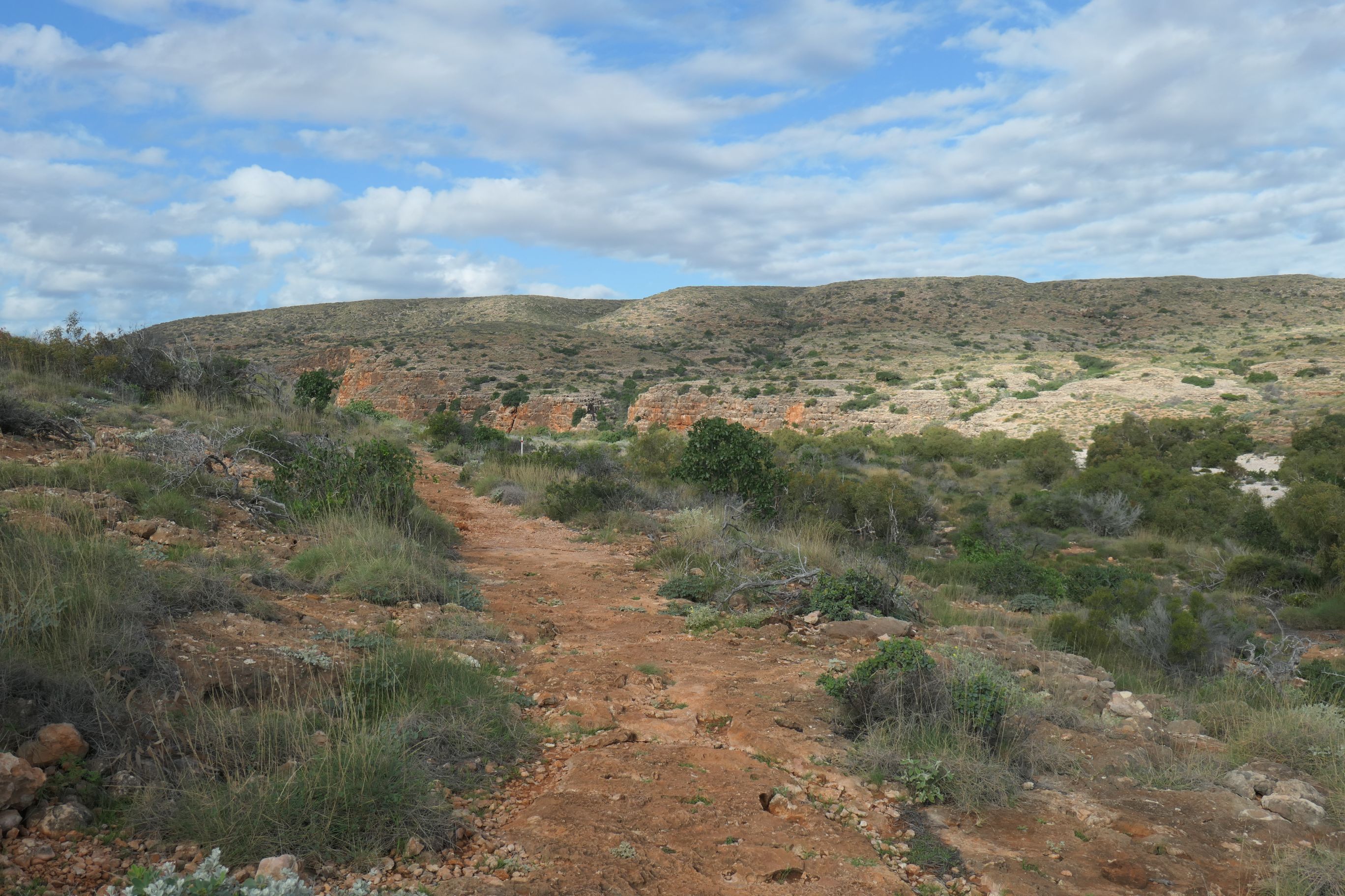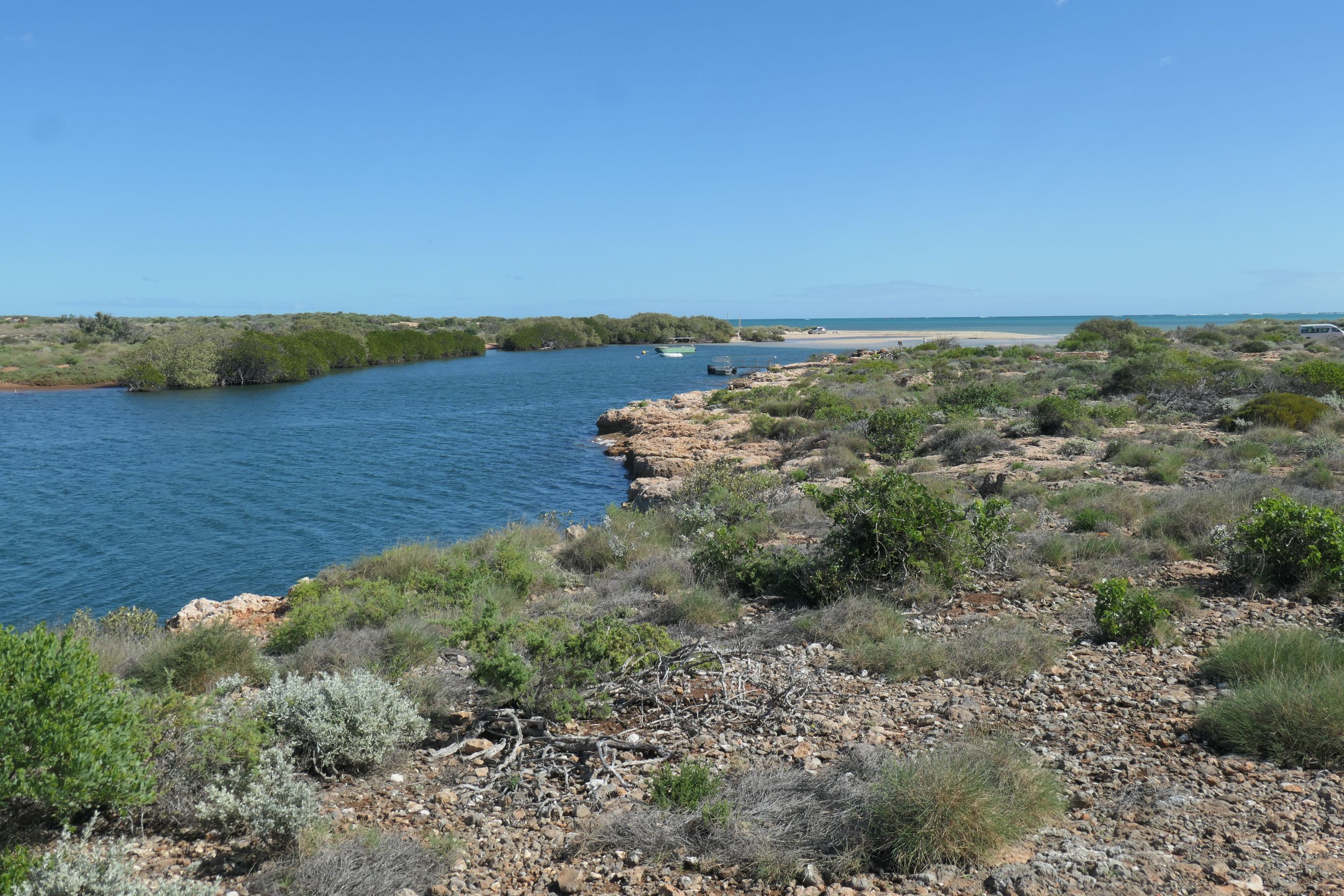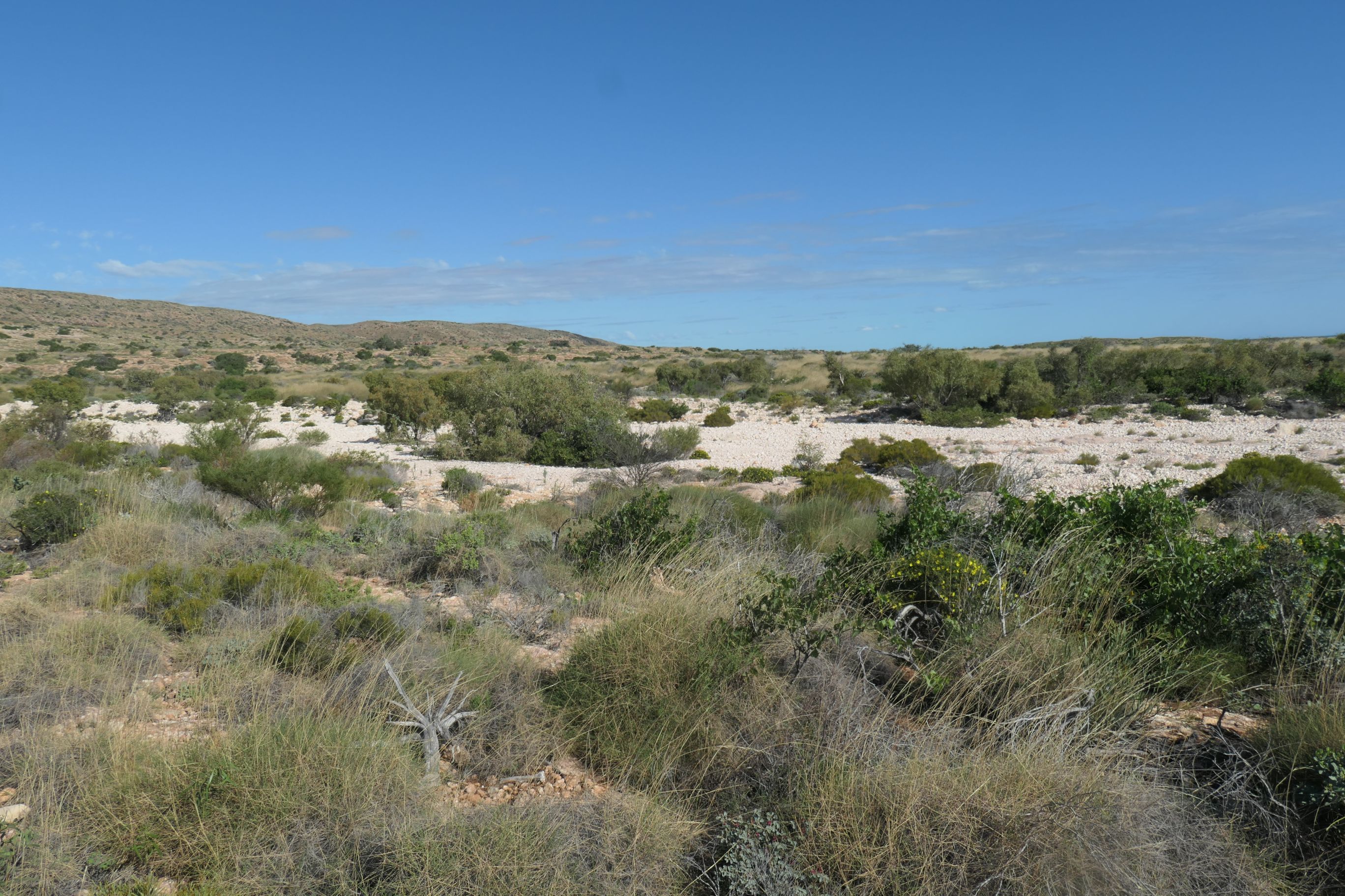 Heading back towards Exmouth, we stopped at Mandu Mandu Trail. Rod and Cornie headed off along the trail, while Marg and I spent the time exploring a dry creek bed. Unlike Yardie Creek, there was no water in this creek, but its smooth pebbles and the debris piled against some of its trees indicated that it must occasionally experience flooding to a significant depth. We spotted a few fossils in the rocks. From a ridge above the creek, a naval ship was visible.