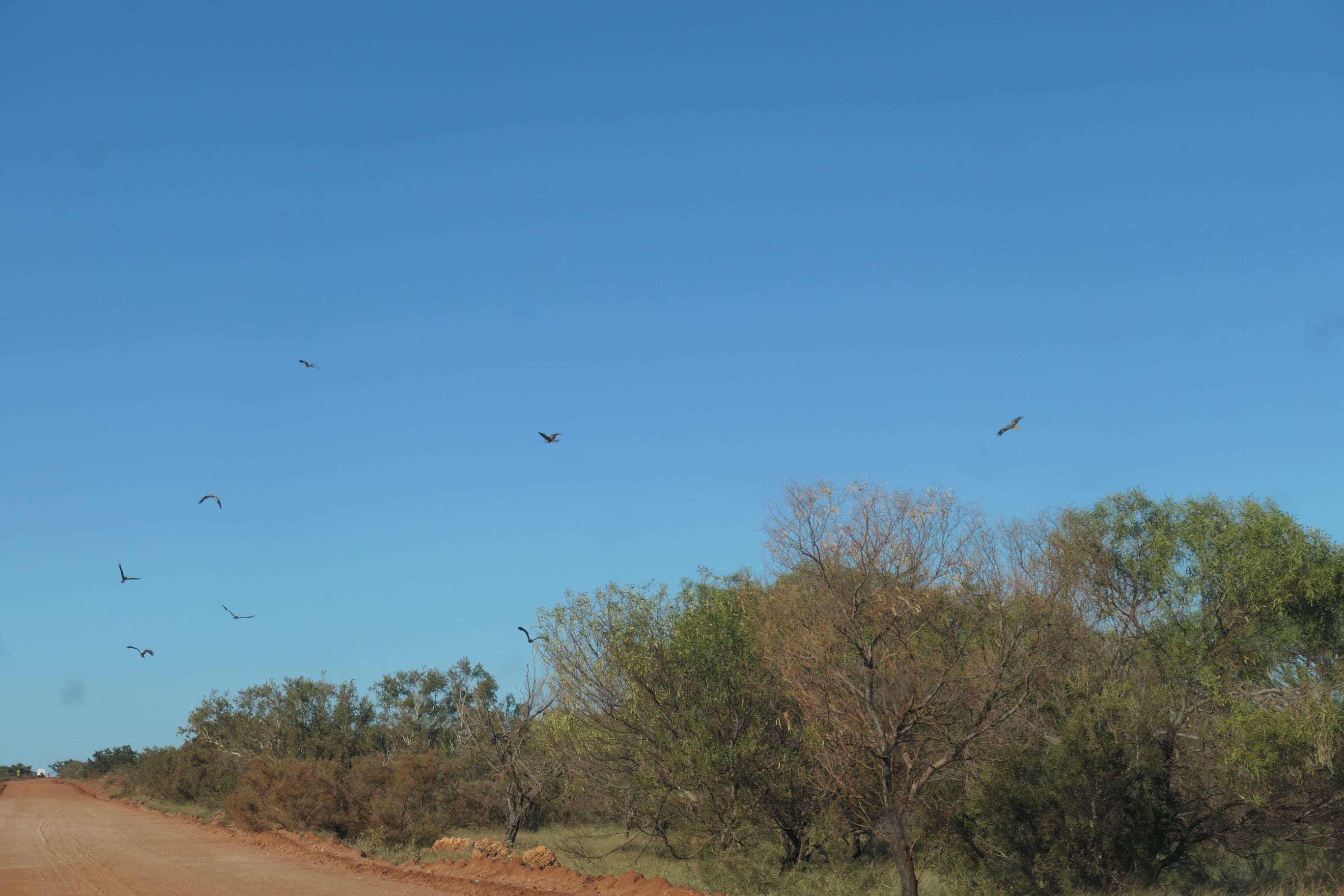 Today was our last day on the road. We took our time over breakfast and left for the final 375km stretch to Broome. Leaving the caravan park on the dirt road back to the highway, we startled a group of kestrels. We’ve seen lots of them on our journey north, although often they’ve been flying solo. They’re quite magnificent to watch when they spread their wings and circle round and round over the road – probably riding on the warm air rising up from the hot tarmac.