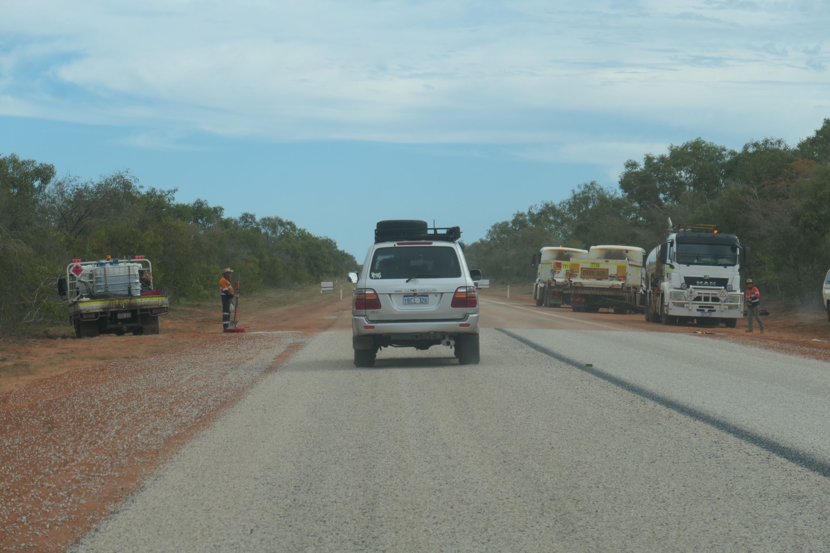 All the way from Perth to Broome, Rod and I have been commenting on the quality of the sealed roads. They are in outstanding condition and really great to drive on. But strangely, in this vast state, where you might have to travel hundreds of kilometres between towns, we’ve never seen a road crew working on a stretch of highway. Such a contrast to what you might see back home in Victoria. We wondered how it might be possible to keep WA’s roads in such good order when no one seemed to be doing any maintenance on them. Finally, about 30km out of Broome, we came upon our first road works. From there, we came upon them every few kilometres all the way into town.