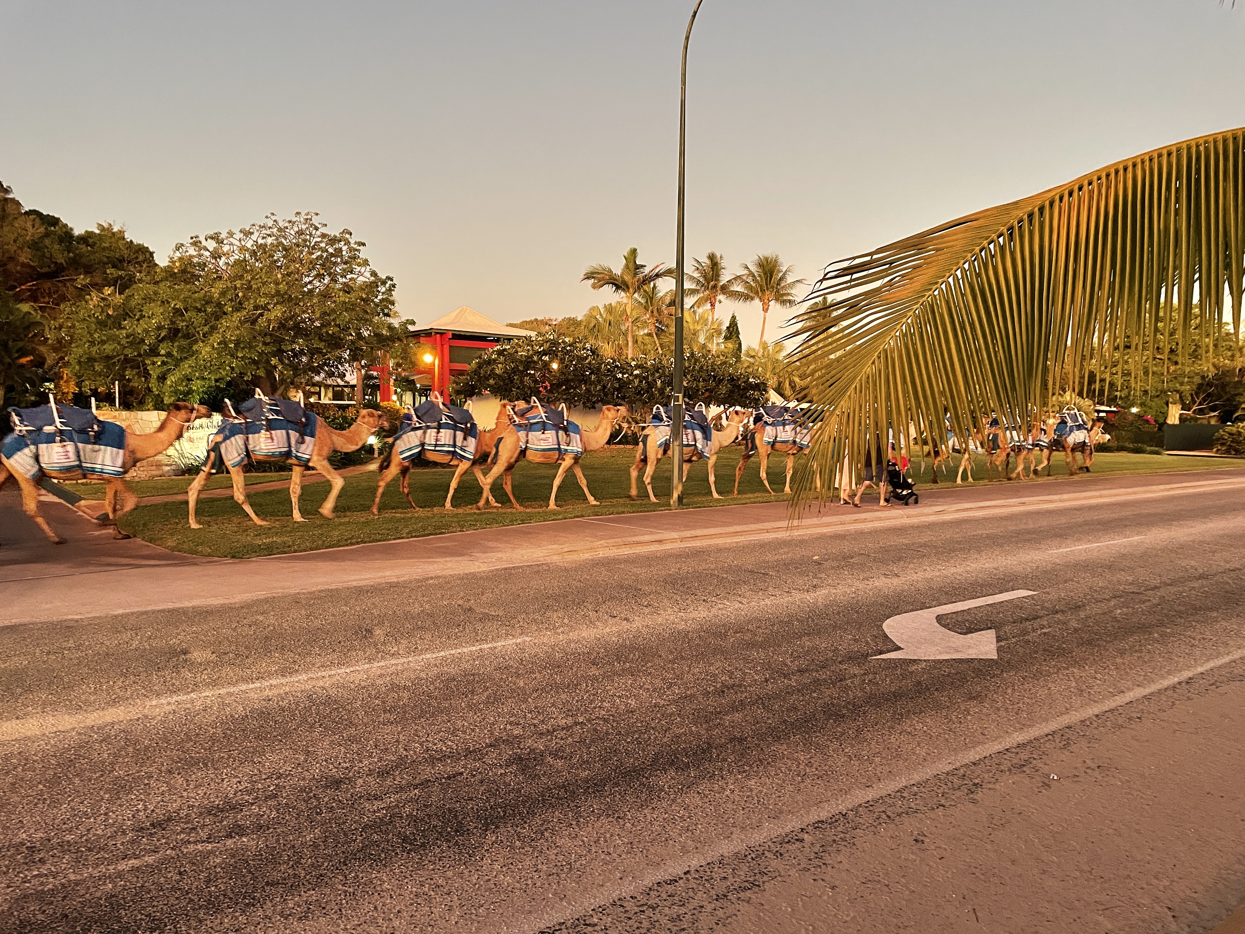 Late in the afternoon we drove over to Cable Beach to watch the sunset. Many people had the same idea. It was beautiful, although probably not as good as what we’d seen at Eighty Mile Beach a few days ago. We treated ourselves to fine dining at the Cable Beach Club nearby. The camels were returning home from their daily session with tourists on the beach as we entered the resort.