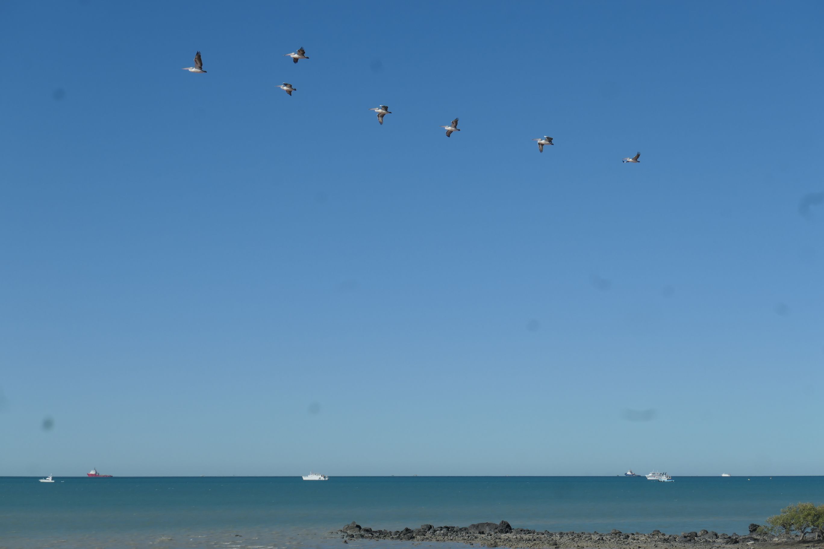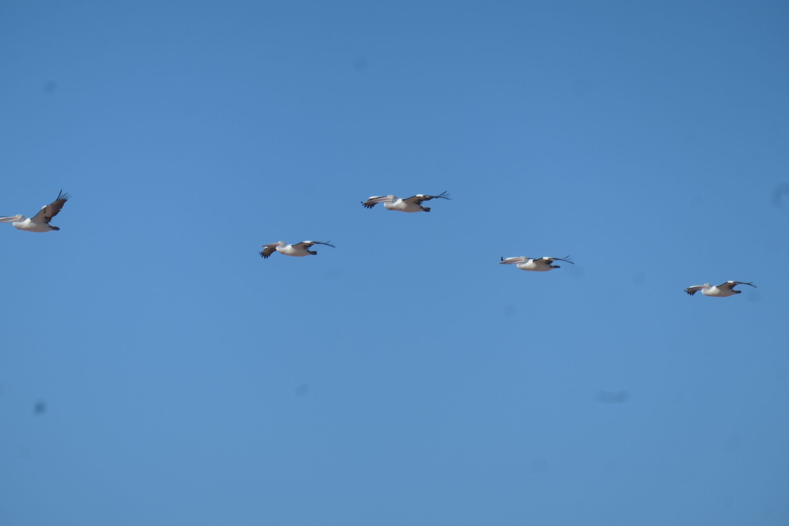 As we ate breakfast, a squadron of pelicans treated us to a flypast, just as you might expect from military aircraft. Perhaps that’s how the collective noun ‘squadron’ came to be chosen. It’s fitting. You might need to enlarge some of these photos to see them.