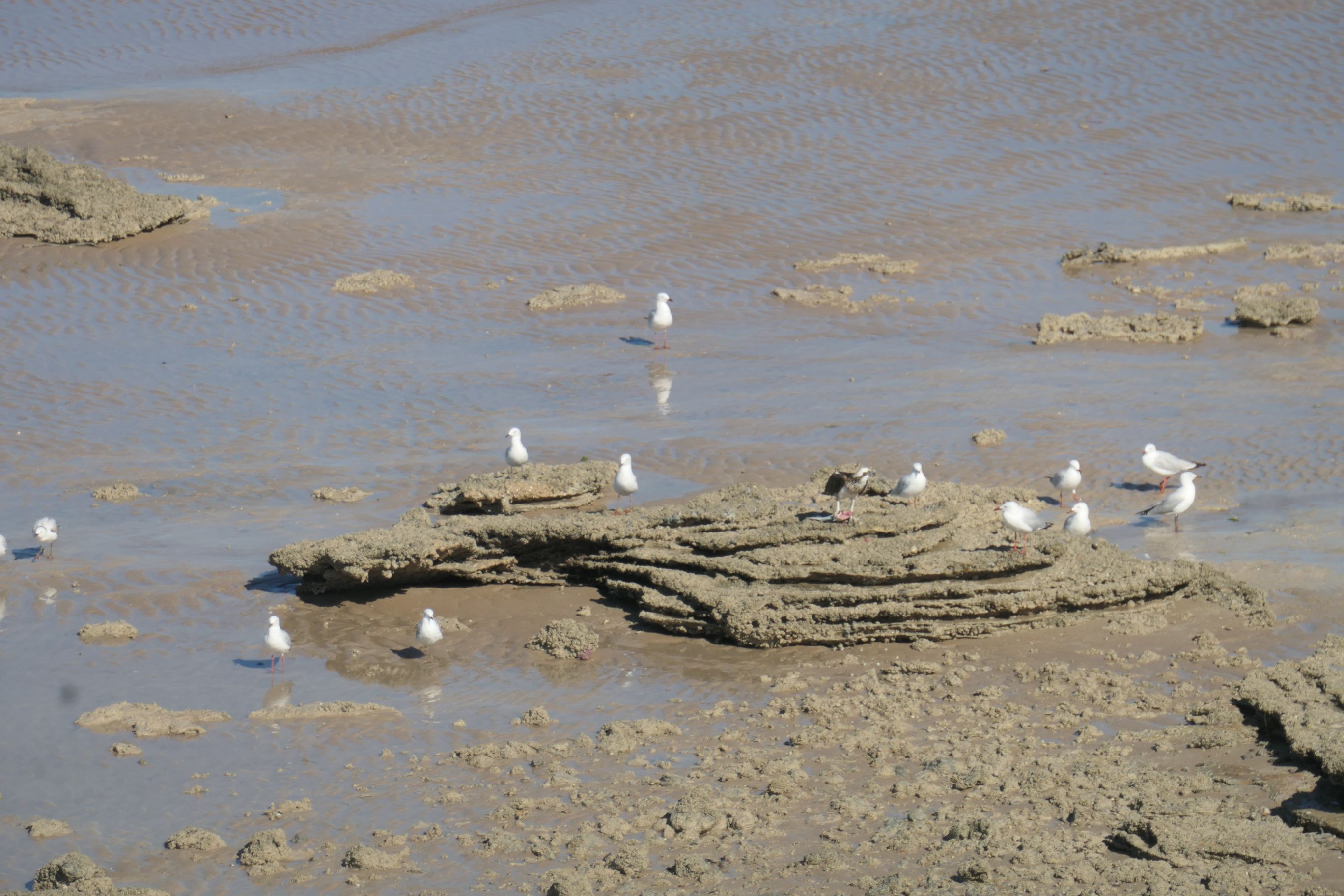 We were interested to see a flock of seagulls gathered around another type of bird on the rocks exposed by the low tide. From the jetty it was difficult to see what was occupying the bird’s attention, but it appeared to be something it had caught in the water or on the mud flats. A local came along and told us the bird was a sea eagle. We realised then that it was probably the bird that had been nesting atop one of the poles at the entrance to the jetty (You can see it sitting on the adjacent pole). Above us, black kites circled round above our heads on the shifting breeze. The Yawuru people know the black kite as Jir.