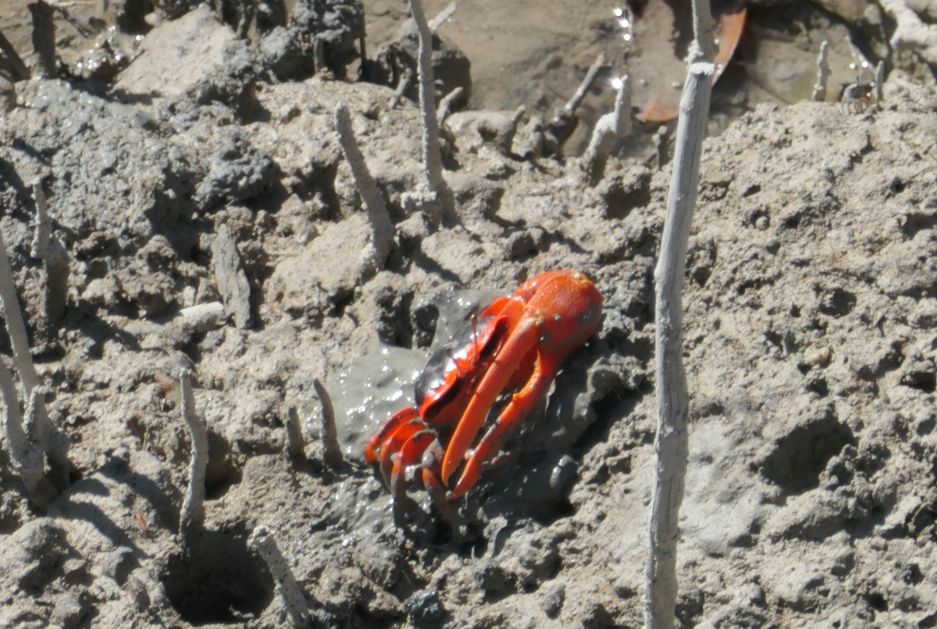 Back in town later in the morning, Rod and I wandered up to the old Streeter’s Jetty, which juts out into a dense mangrove forest. A narrow channel cuts through the mangroves to the bay. The tide was out and there were bright orange crabs with large pincers busily moving about on the exposed mud. This jetty was once used by the pearling luggers when the industry was a mainstay of Broome’s pioneer days. Nearby sculptures commemorate the contribution of Japanese pearl divers and Japanese business men who established the industry.