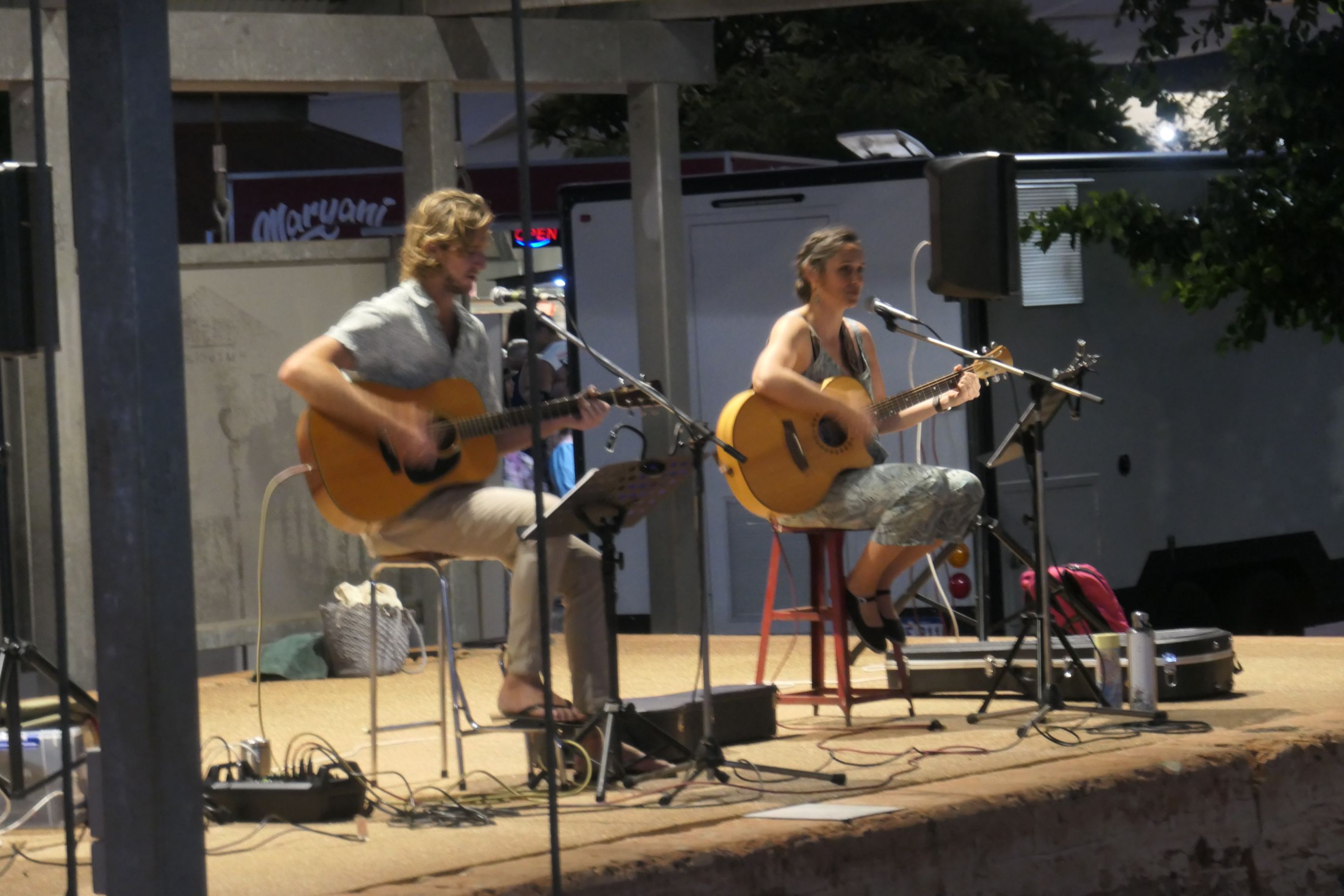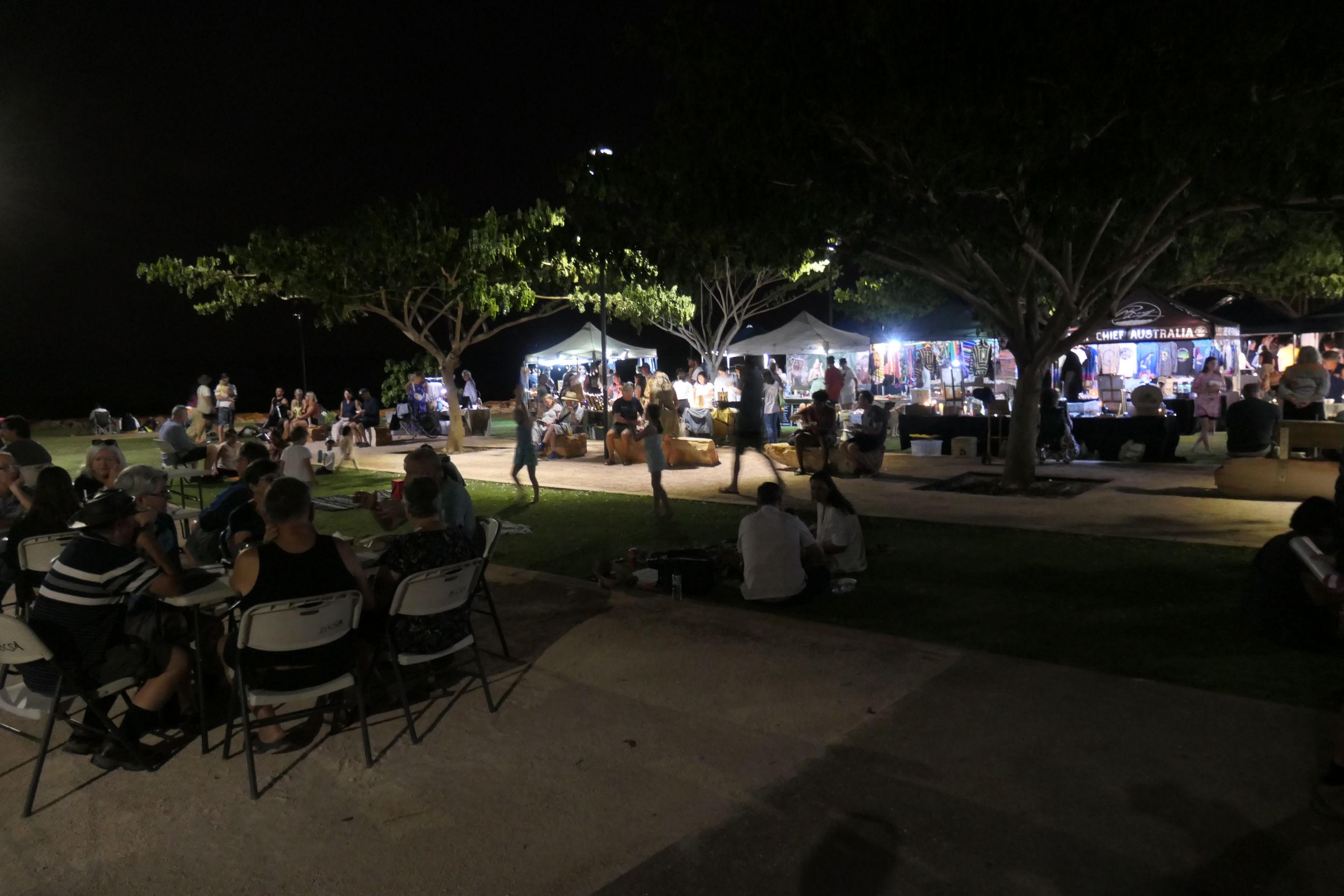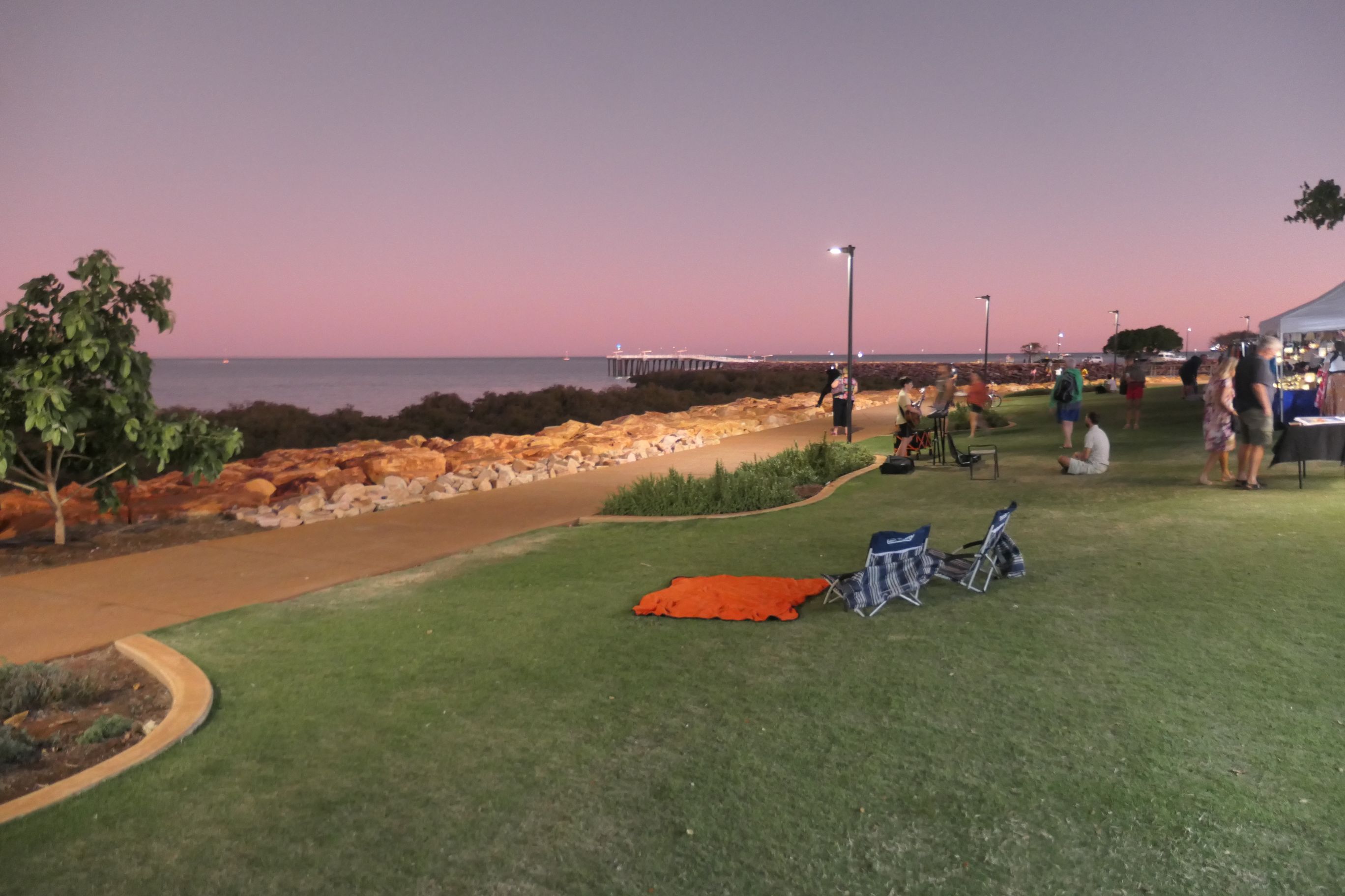 From Matso’s we walked down to Town Beach, where the Thursday night market was buzzing. The market was bigger than I remember from before the Town Beach redevelopment. They’d set aside a large area for people to sit and eat and they had a duo playing music to entertain them. There was a good selection of food vans (although Marg lamented the lack of an ice cream van), and I opted for the bao buns, which were delicious.