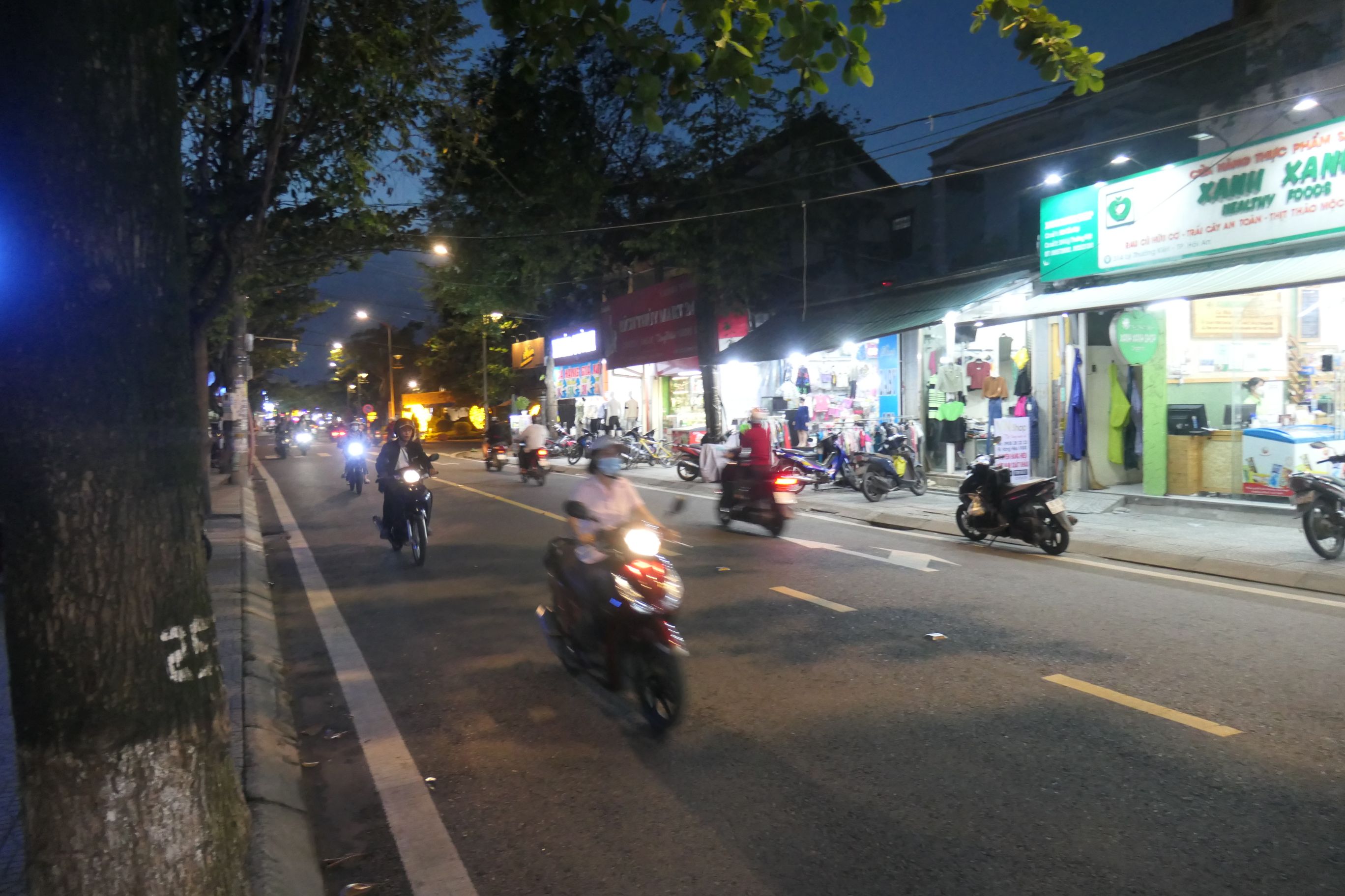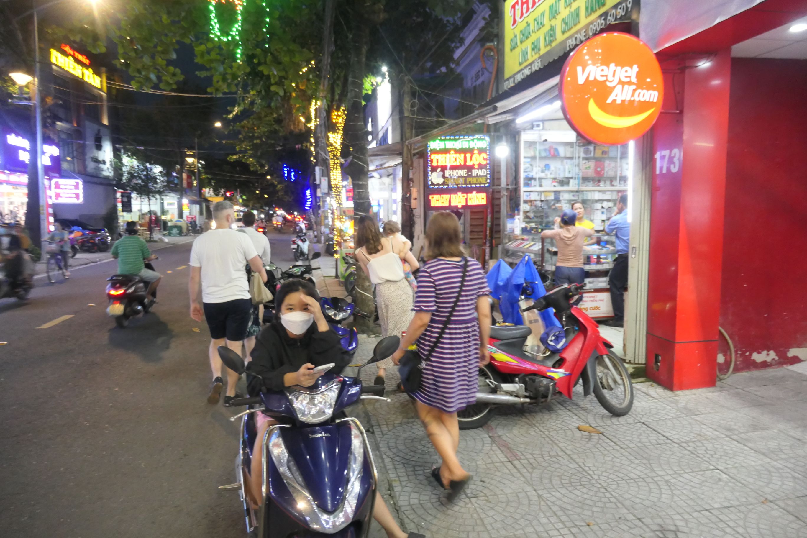 After dark we walked into the Old Town for a quick look around. It wasn’t easy trying to cross the road with a baby and stroller as the motorbikes just kept on coming. We had to chance it and cross the roads whenever there was a slight break in the traffic. The walk into town was not straightforward. Motorbikes were frequently parked up on the kerb, forcing pedestrians to step out onto the road – and almost directly into the paths of speeding motorbikes – to get around them. We soon abandoned the plan of wheeling Layla all the way in her stroller, because every time a parked motorbike blocked the footpath, you were forced to take the stroller out onto the road (and into the path of the traffic) to get around it. Casey carried Layla in her arms and out of harm’s way, while Nick weaved on and off the footpath with the empty stroller.