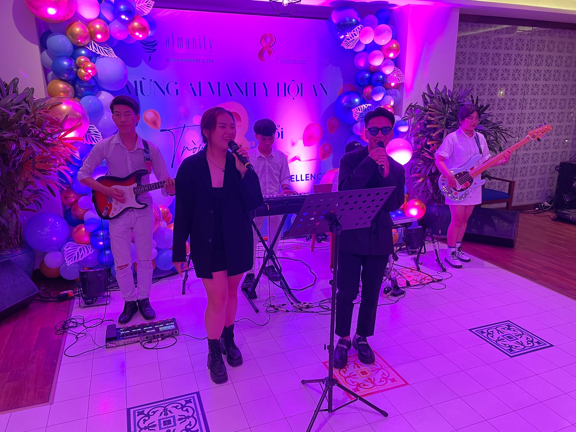 Quite a few locals, including VIPs and government officials turned up, as did the Hoi An media team. Floral bouquets welcomed invited guests to the resort and the dining hall was decorated with balloons and food displays for the occasion. The dignitaries gathered for speeches before the dinner. At the completion of the speeches a band began playing. Most of the musicians appeared to be barely out of their teens, but they worked hard and sounded pretty good.