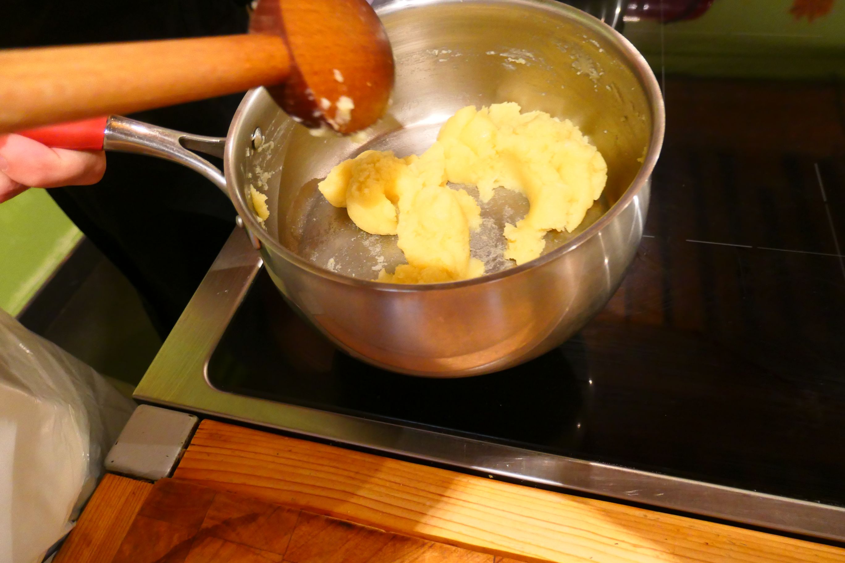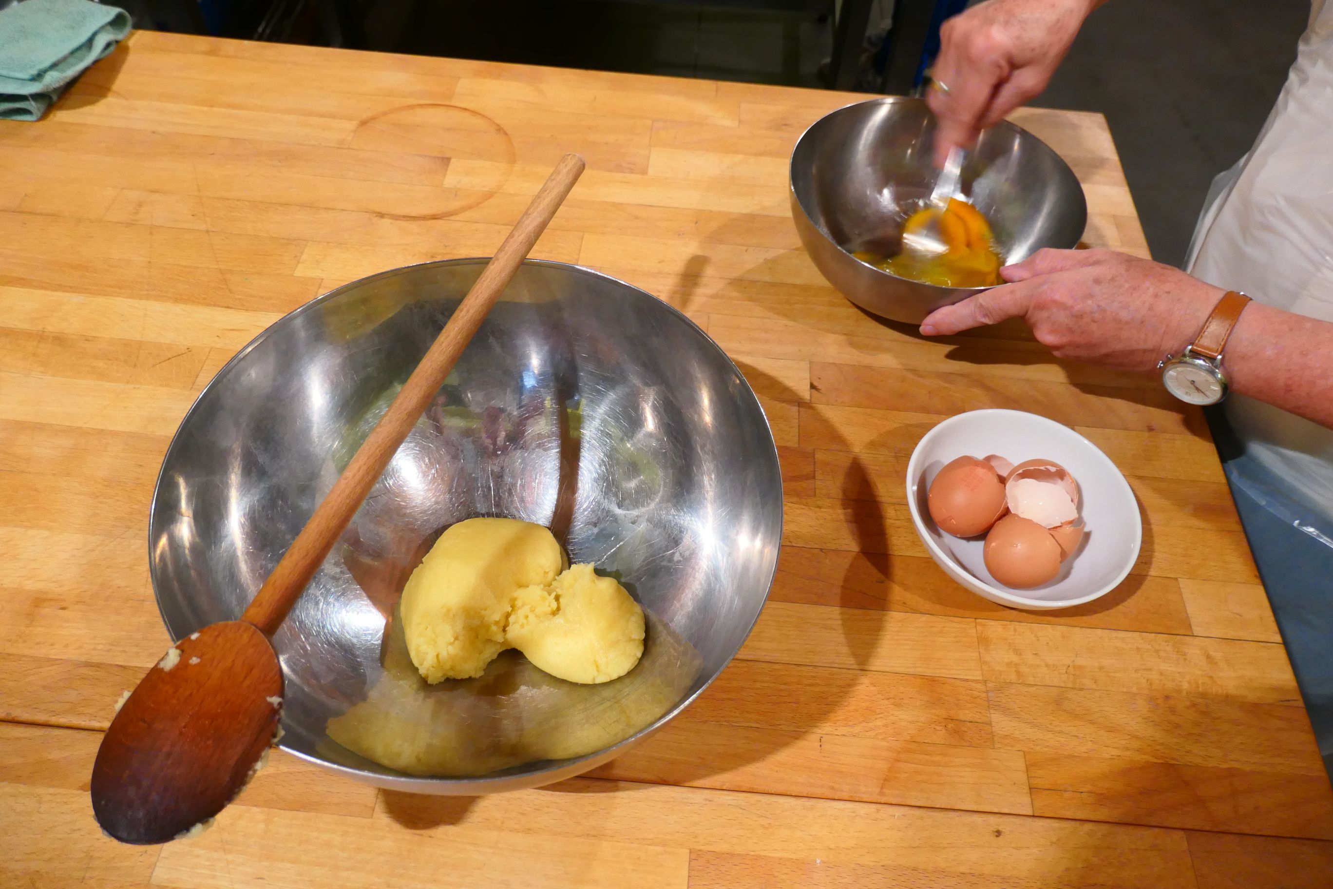 Anyway, as it turned out, three people was a suitable number for our group. The lady, Ivy, took one table and Marg and I took the other. On each table were a mixing bowl and the ingredients used to make choux pastry – butter, flour and eggs. I took the easy way out and took the photos, while Marg made the choux pastry. Her first task was to mix the butter and flour into a dough and keep adding beaten eggs until the mixture had a moist, spoonable consistency. Then it was packed into a piping bag. Marg then had to pipe small circles of the choux mixture onto a baking tray. There was some skill involved in making them all the same size and shape, but I was pretty impressed with how well she did that.