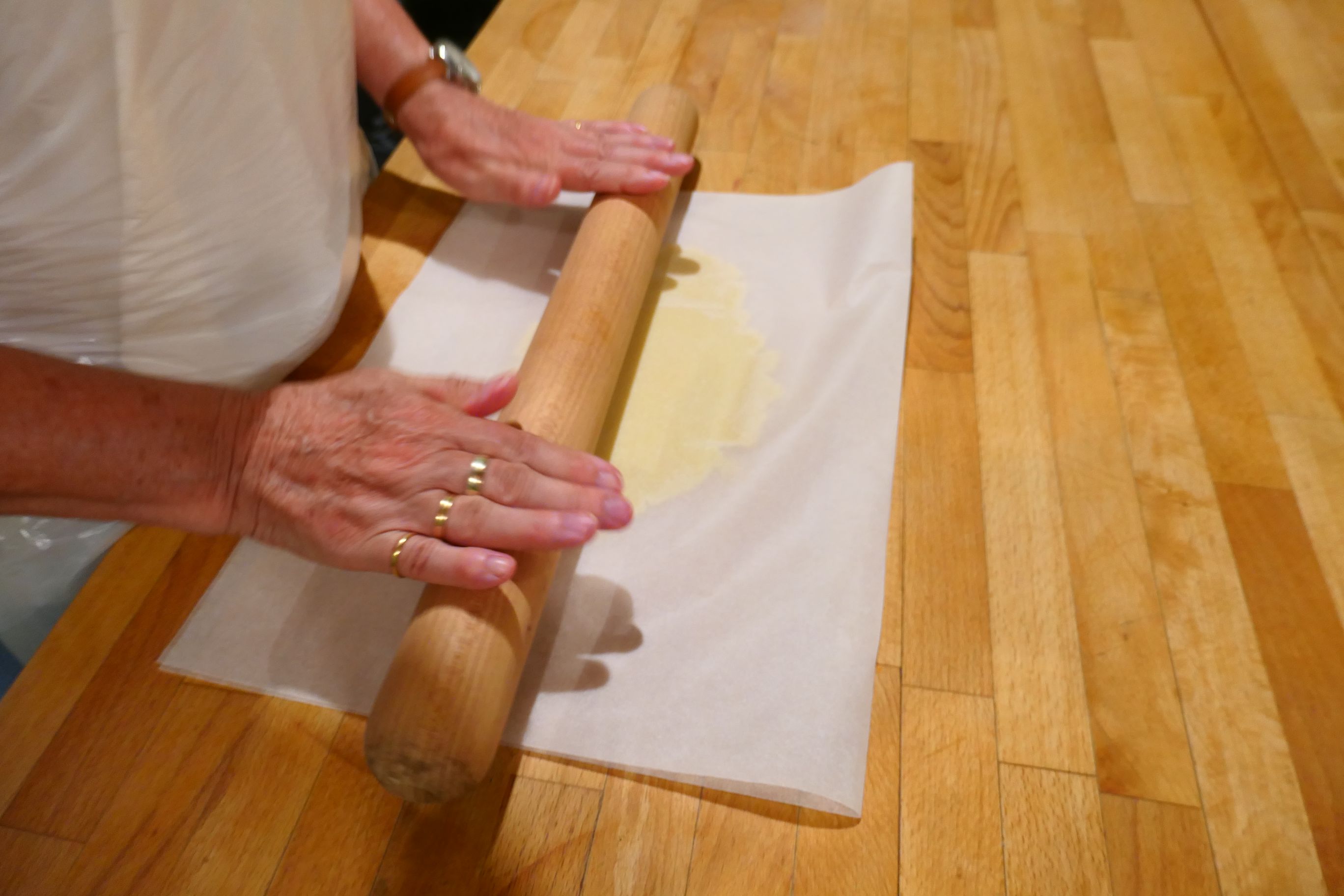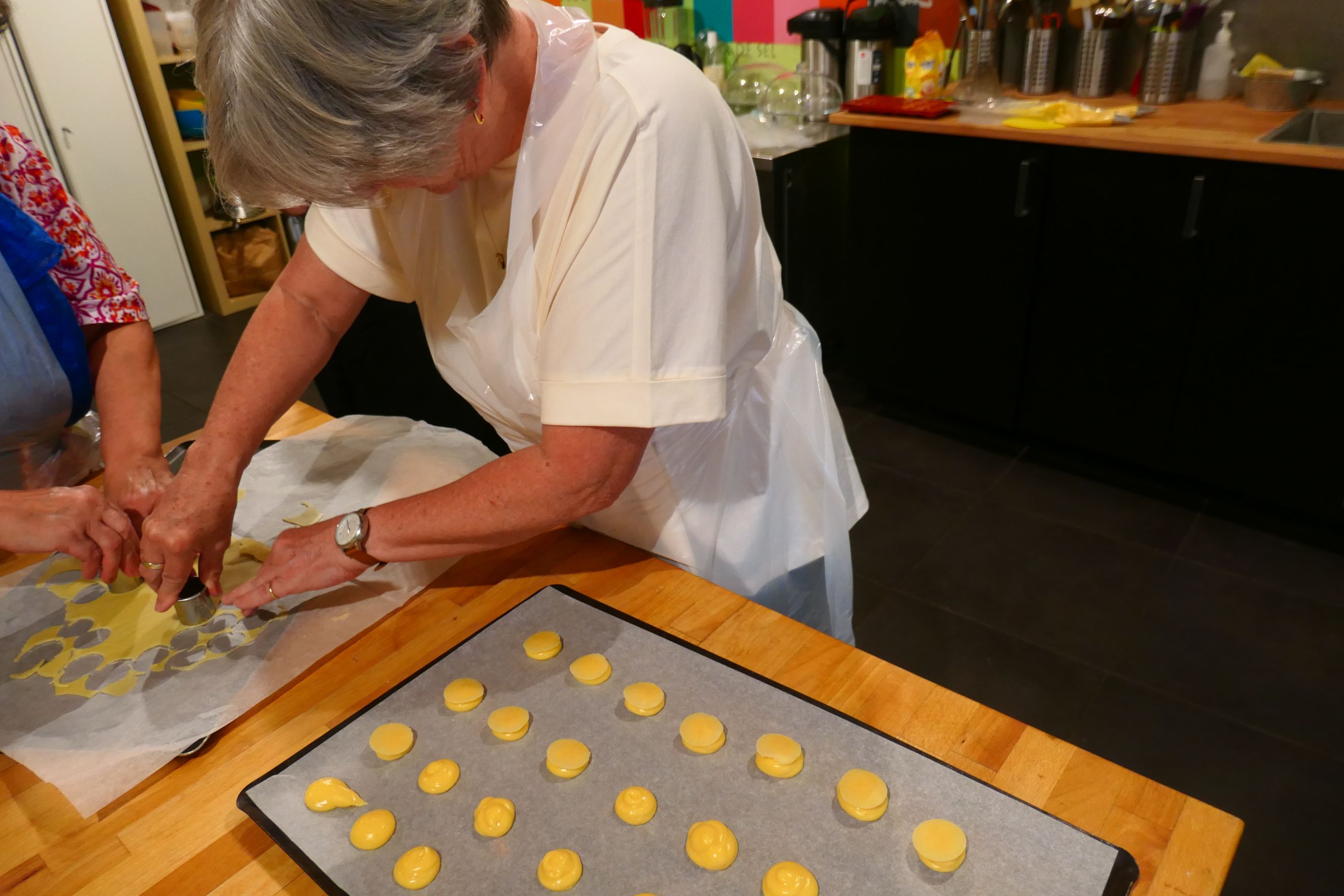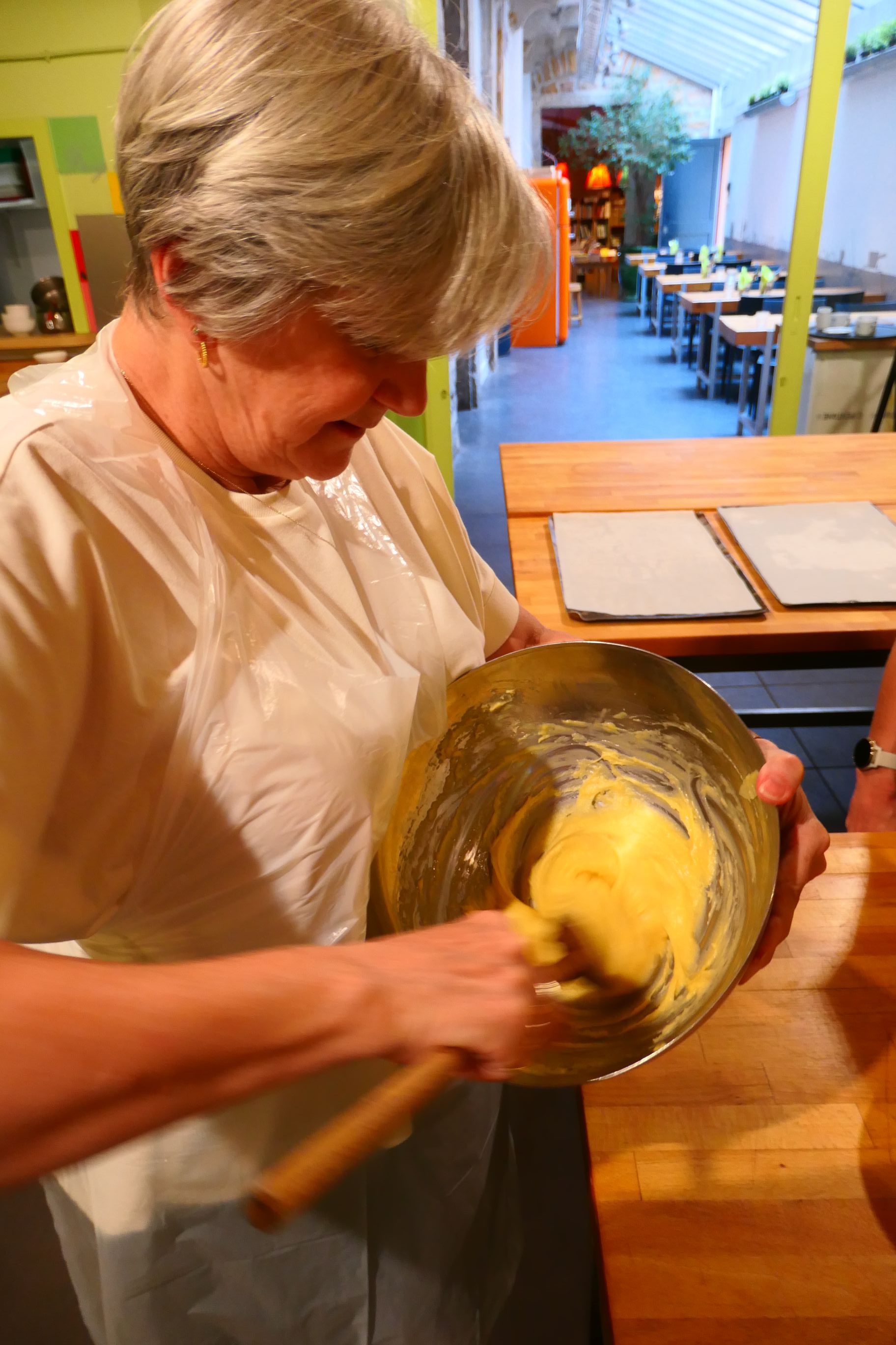 More dough had to be mixed, this time in an electric mixer, and rolled with a rolling pin until it was very thin, and then put into the fridge to cool down. Of course, our chef had some rolled dough she’d ‘prepared earlier’, and we had to press small discs from this rigid dough and place each disc carefully on top of a pastry as if it were a cap on a person’s head. The next step was to place the baking tray into a 180 degree oven for 20 minutes.