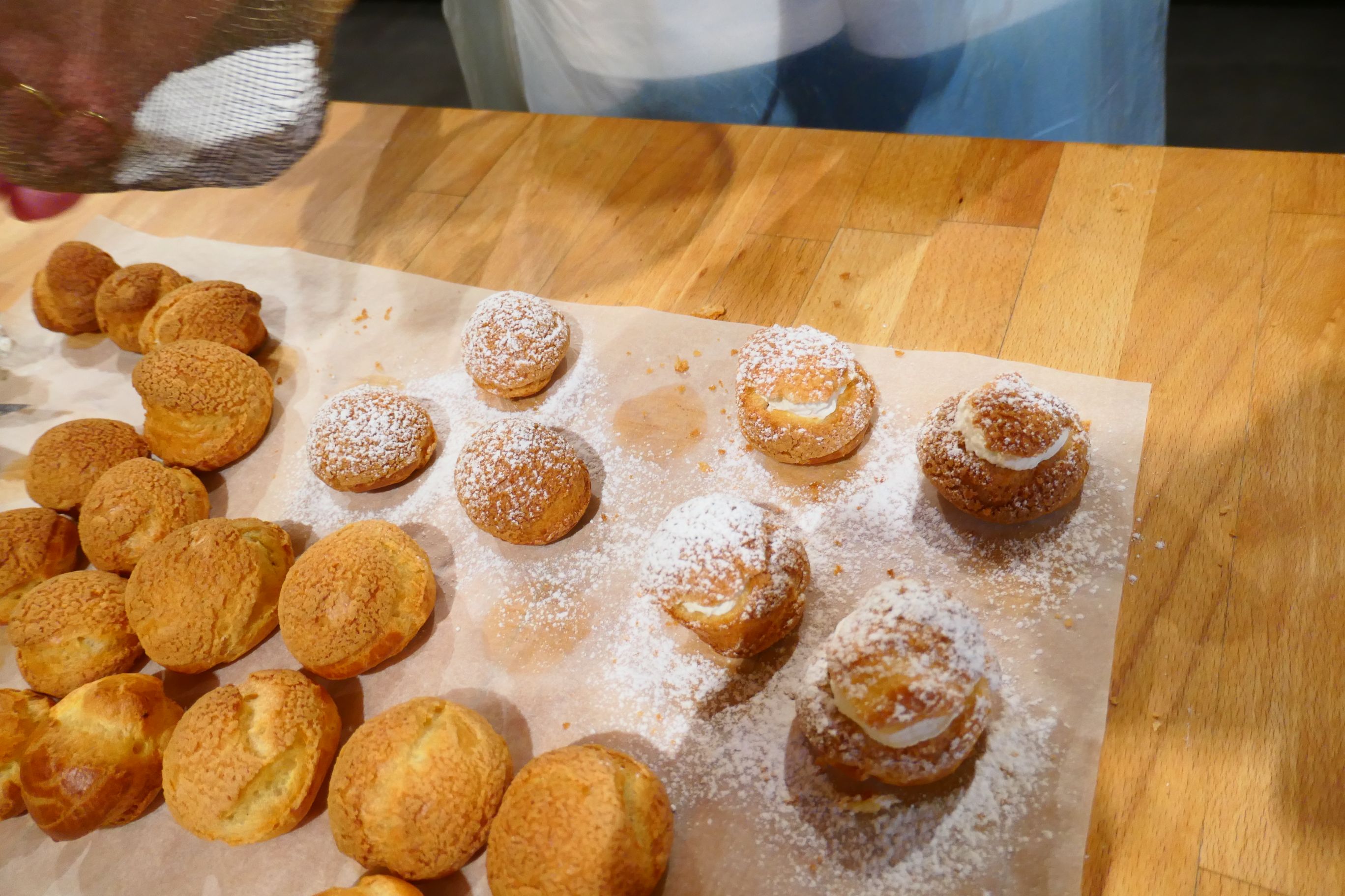 While the pastries were in the oven, Chantilly cream was prepared in another electric mixer and placed into a clean piping bag. We were shown two ways of putting the cream into the pastries. One was to make a small hole beneath the pastry and squeeze the cream into the cavity. The other was to carefully slice the top off the pastry and pipe the cream into the cavity before replacing the cap. The pastries were then dusted with icing sugar. Finally came the good bit, the taste test. They were delicious, believe me. I think Marg did a great job.