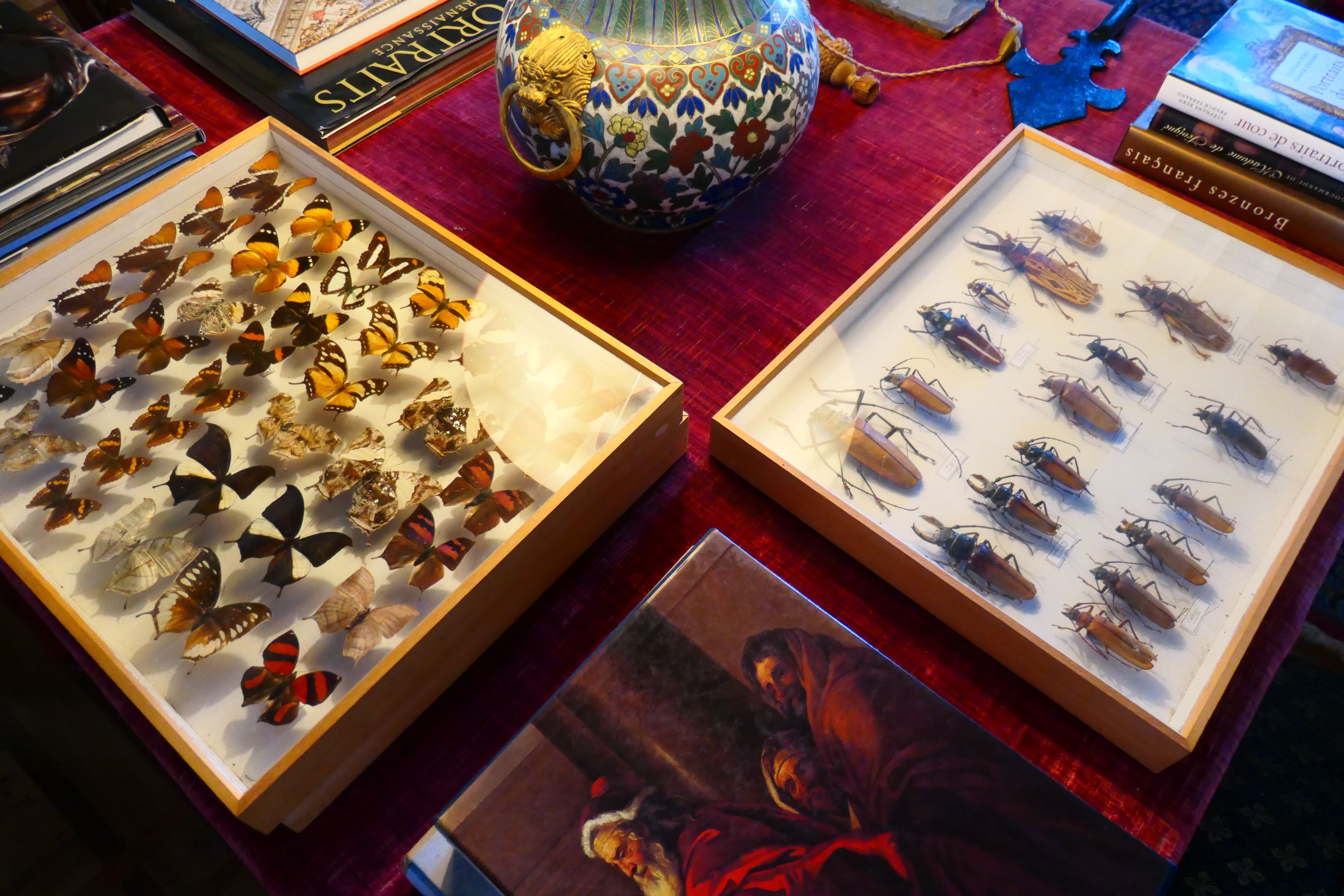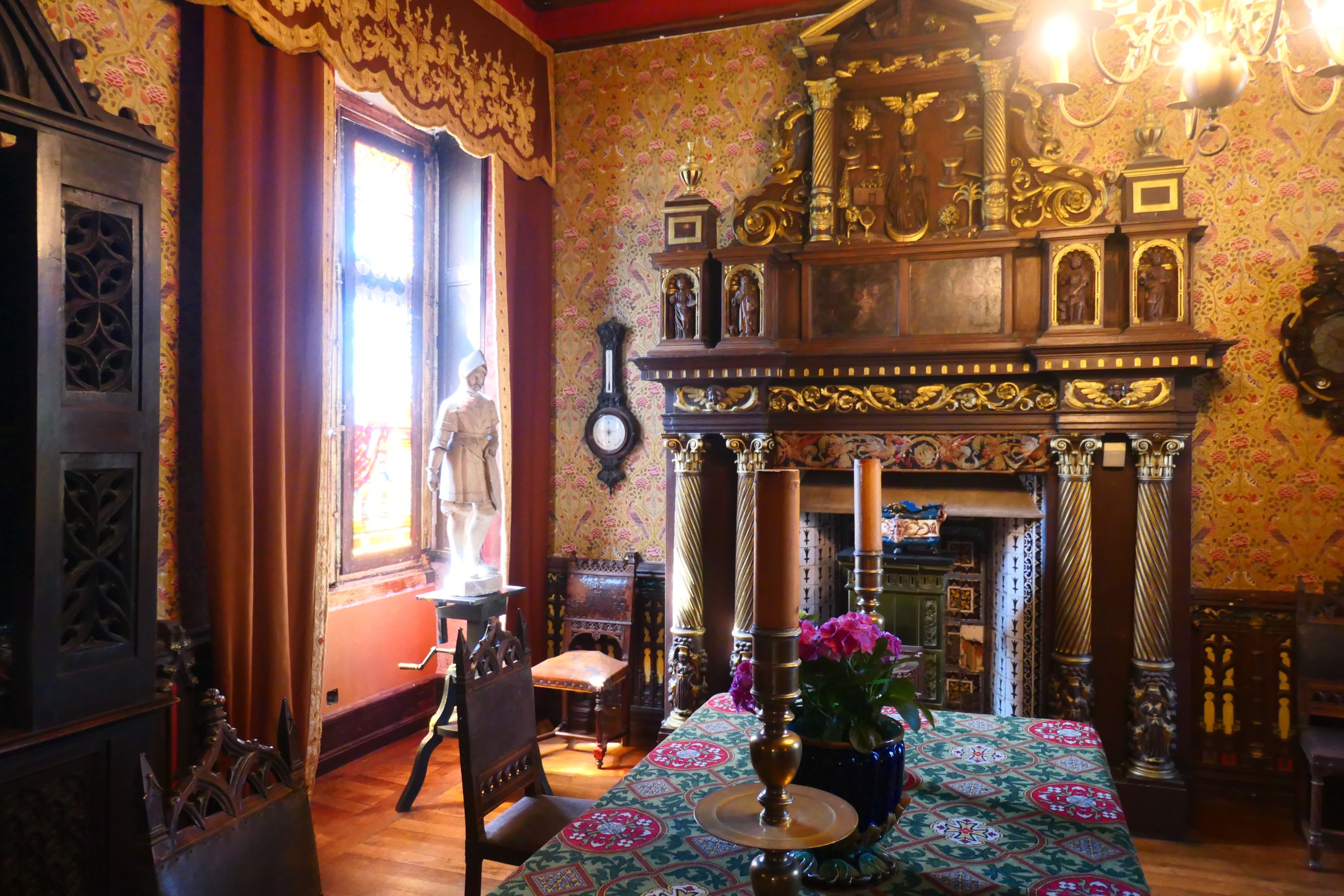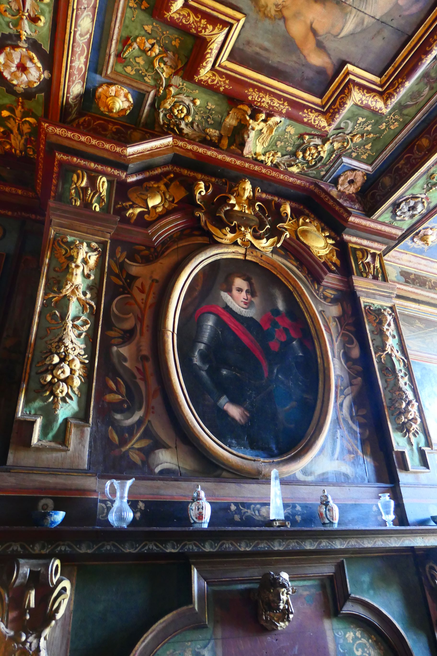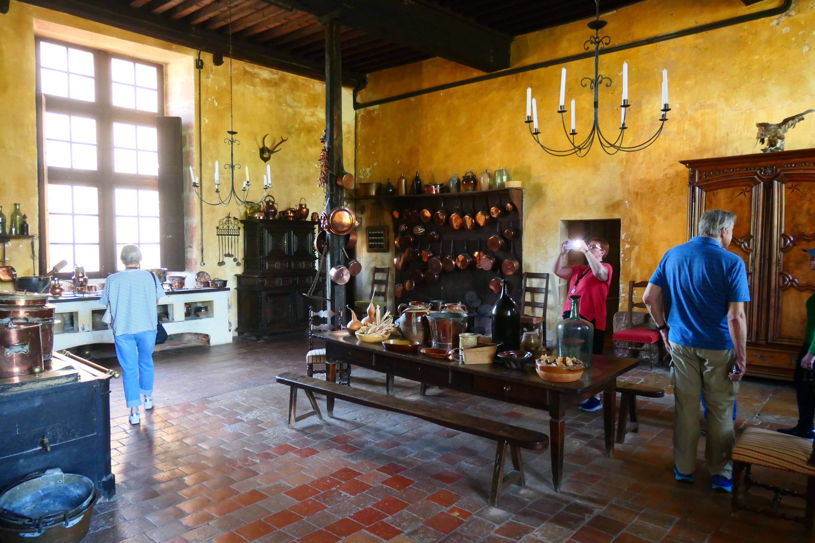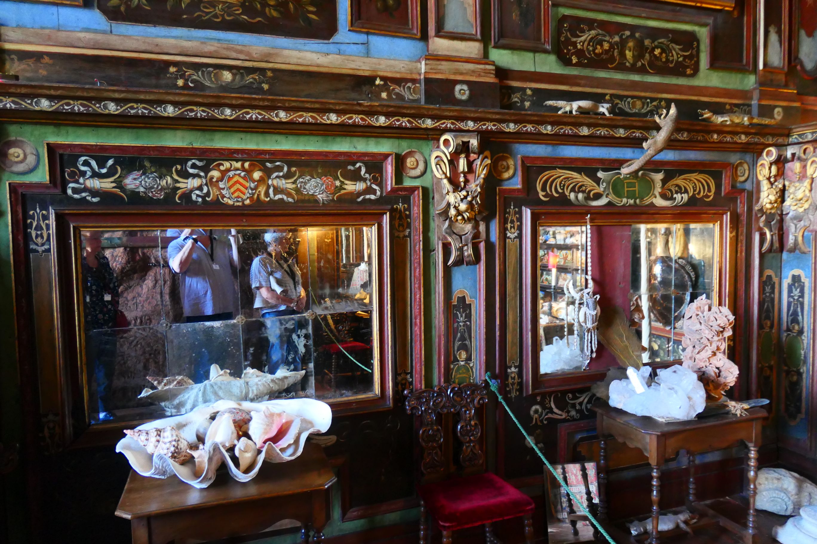 We entered the apartments of the family who once lived there. The most likely word to describe the decor and colour schemes of the rooms is ‘flamboyant’. From floor to ceiling (and even right across the ceiling) the rooms were painted in bold colours – often reds and blues. Large artworks, including sculptures, paintings and tapestries, adorned the walls. Finely crafted period furniture was present in every room. The room that intrigued me the most was the ‘cabinet of curiosities’, a room where anything connected with scientific knowledge was displayed – a human skull, a turtle shell, sea shells etc all formed part of the clutter. The kitchen was massive. There you could find a very early device for turning a spit roast, a large wood fired oven, and a vast array of shiny copper cooking implements.