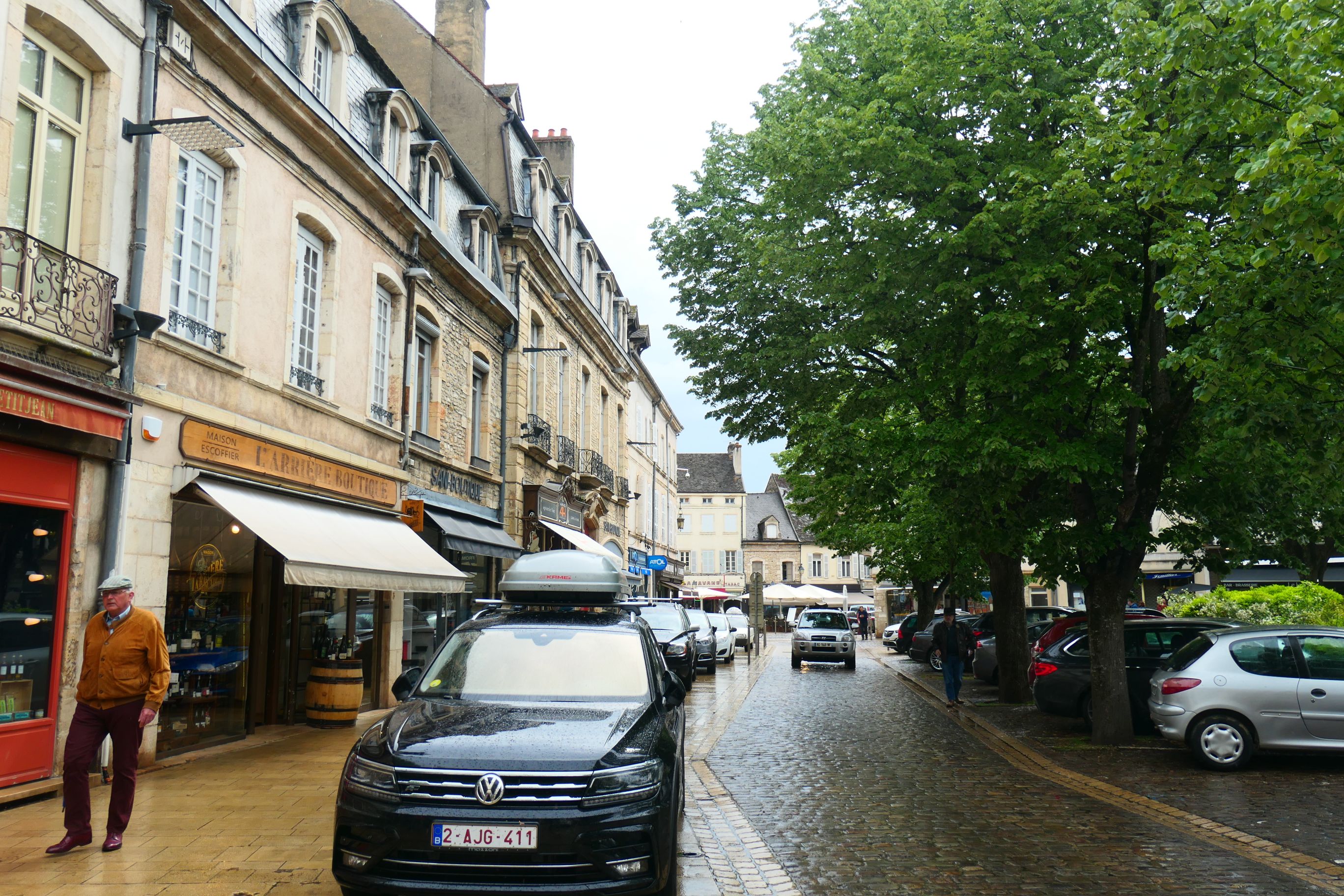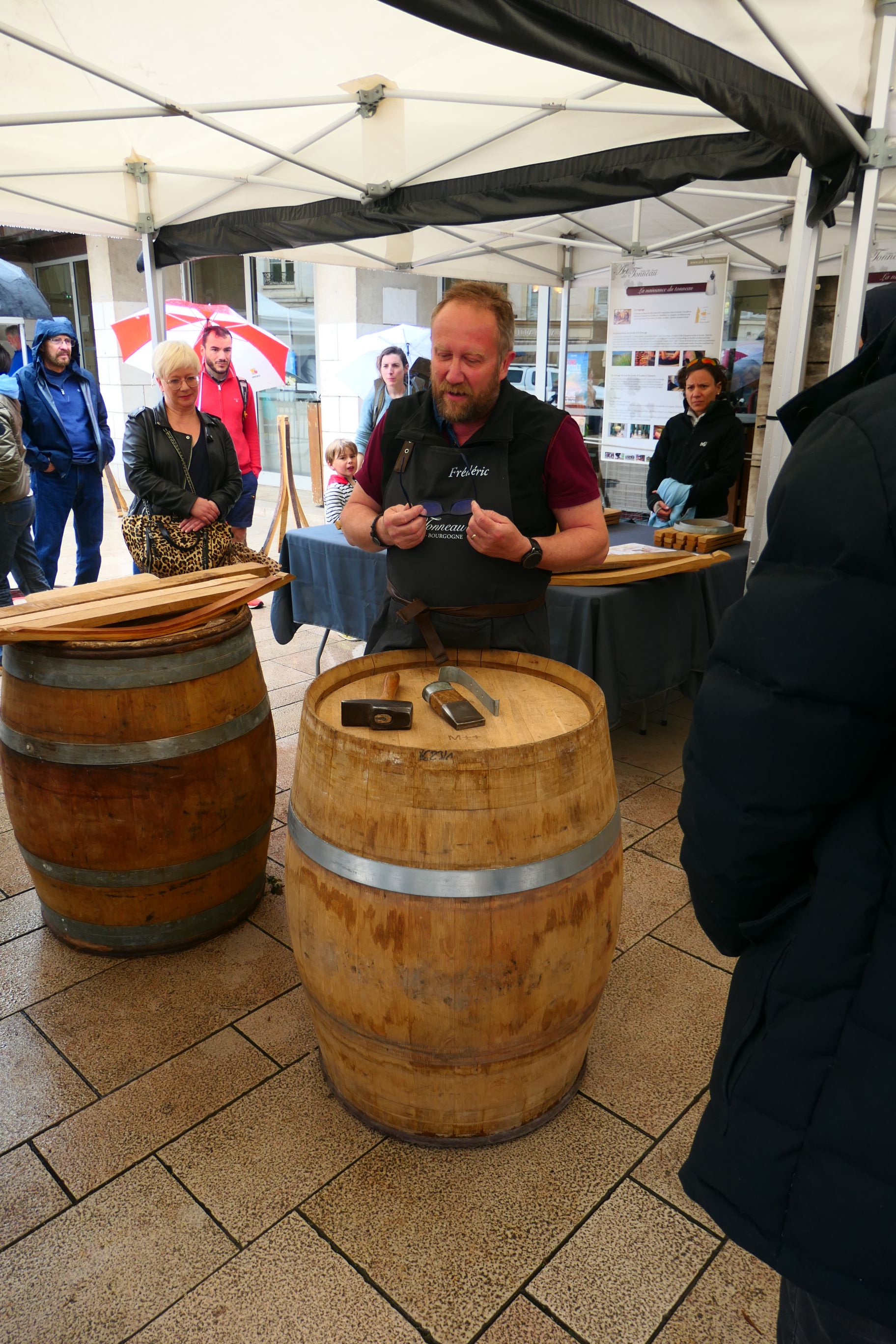 Following our tour of the hospices, we had another hour to enjoy a walk around the town. It’s Sunday, and in most other parts of France we’d be lucky to find anything open. But Beaune is a mecca for tourists, so there were plenty of souvenir shops and cafes open. There was also a Sunday market that we wandered through. I’d neglected to mention that Burgundy is also famous for its cheeses, and we saw some of the local produce on sale here. And of course, the wine merchants were also open, proudly displaying some of Burgundy’s most famous wines. A cooper was demonstrating the art of making wine barrels, which were also available for sale.