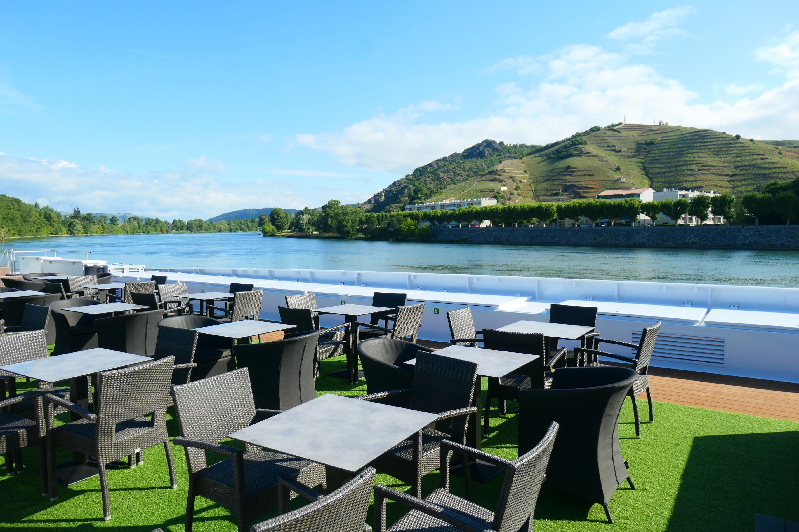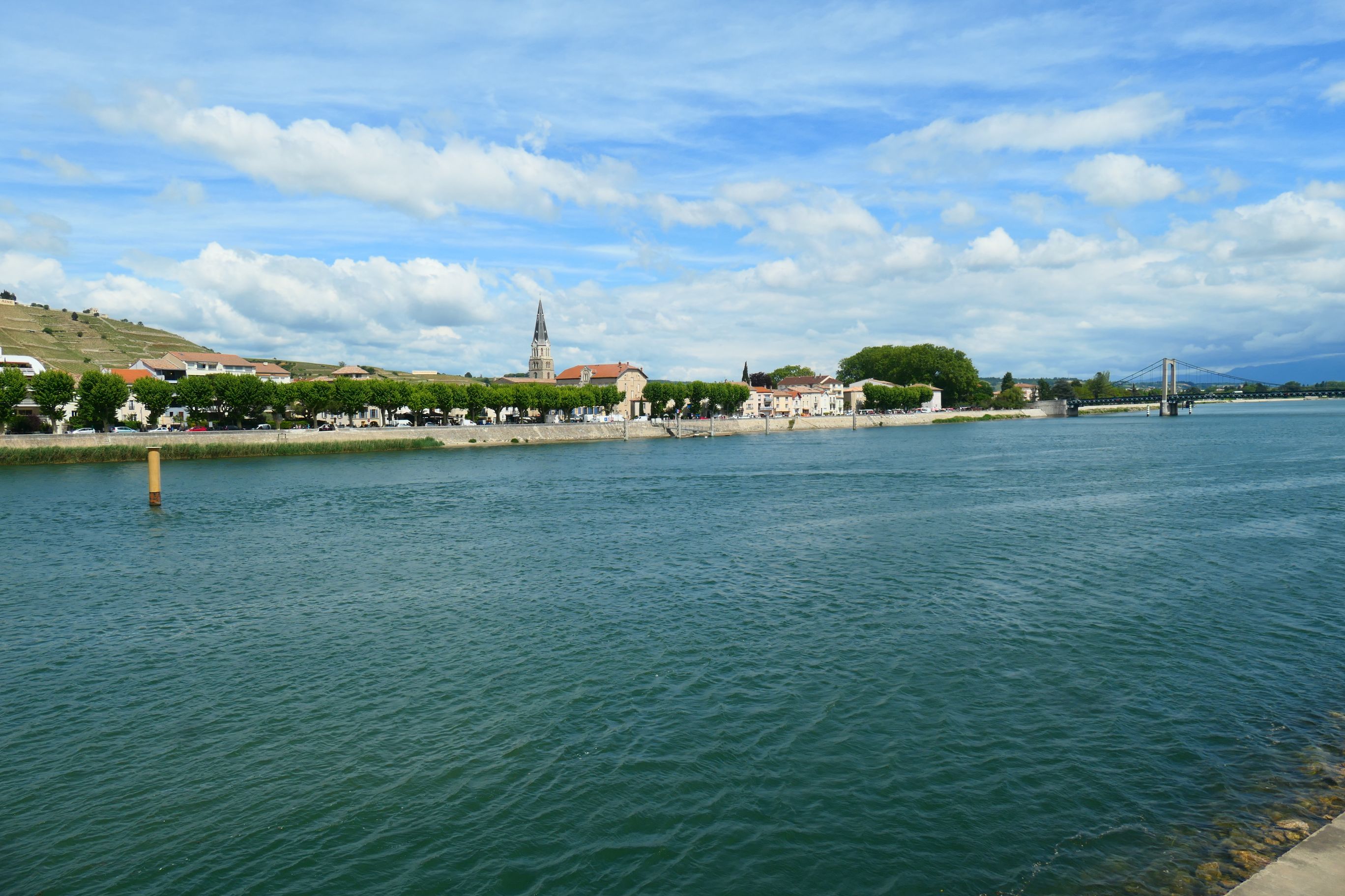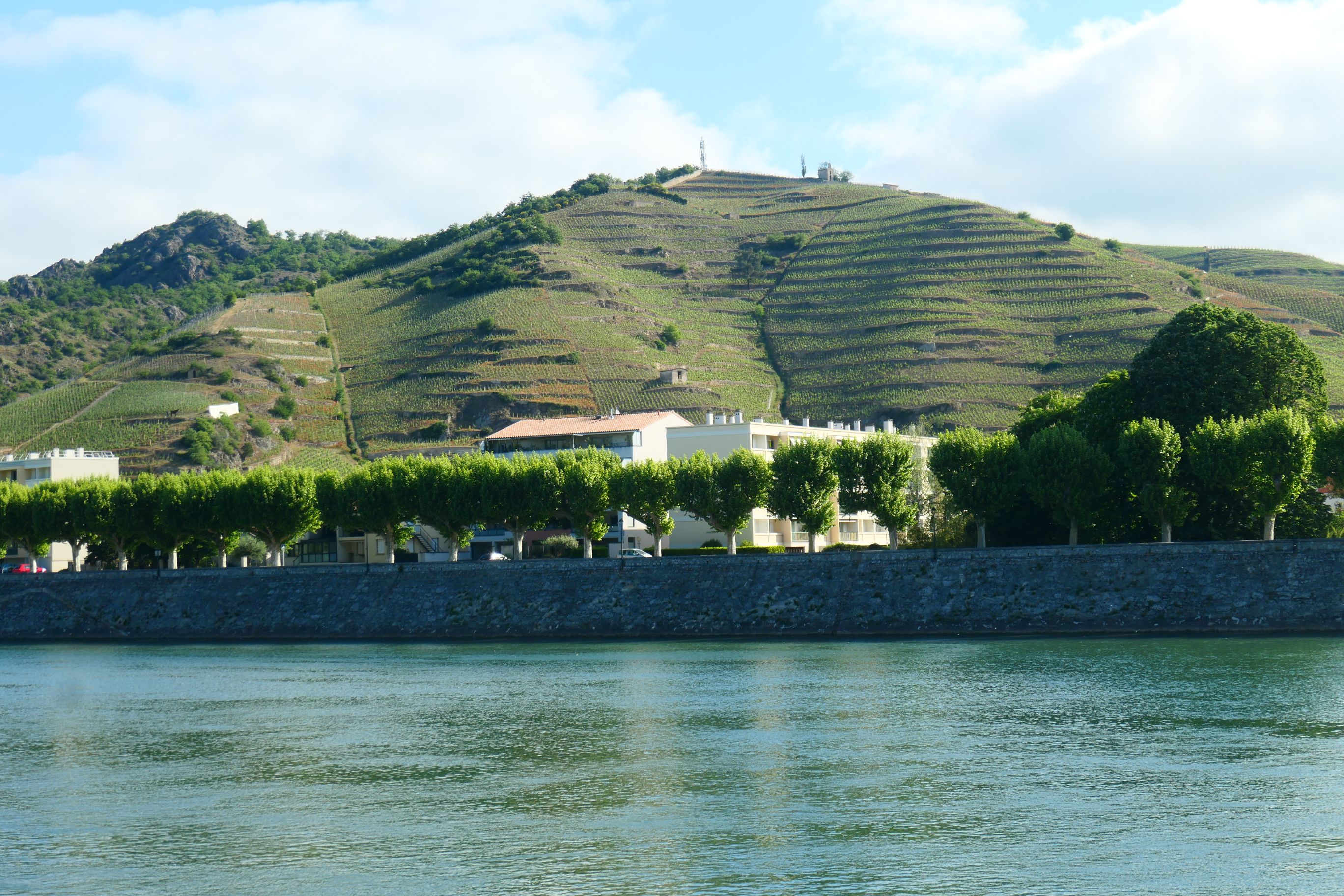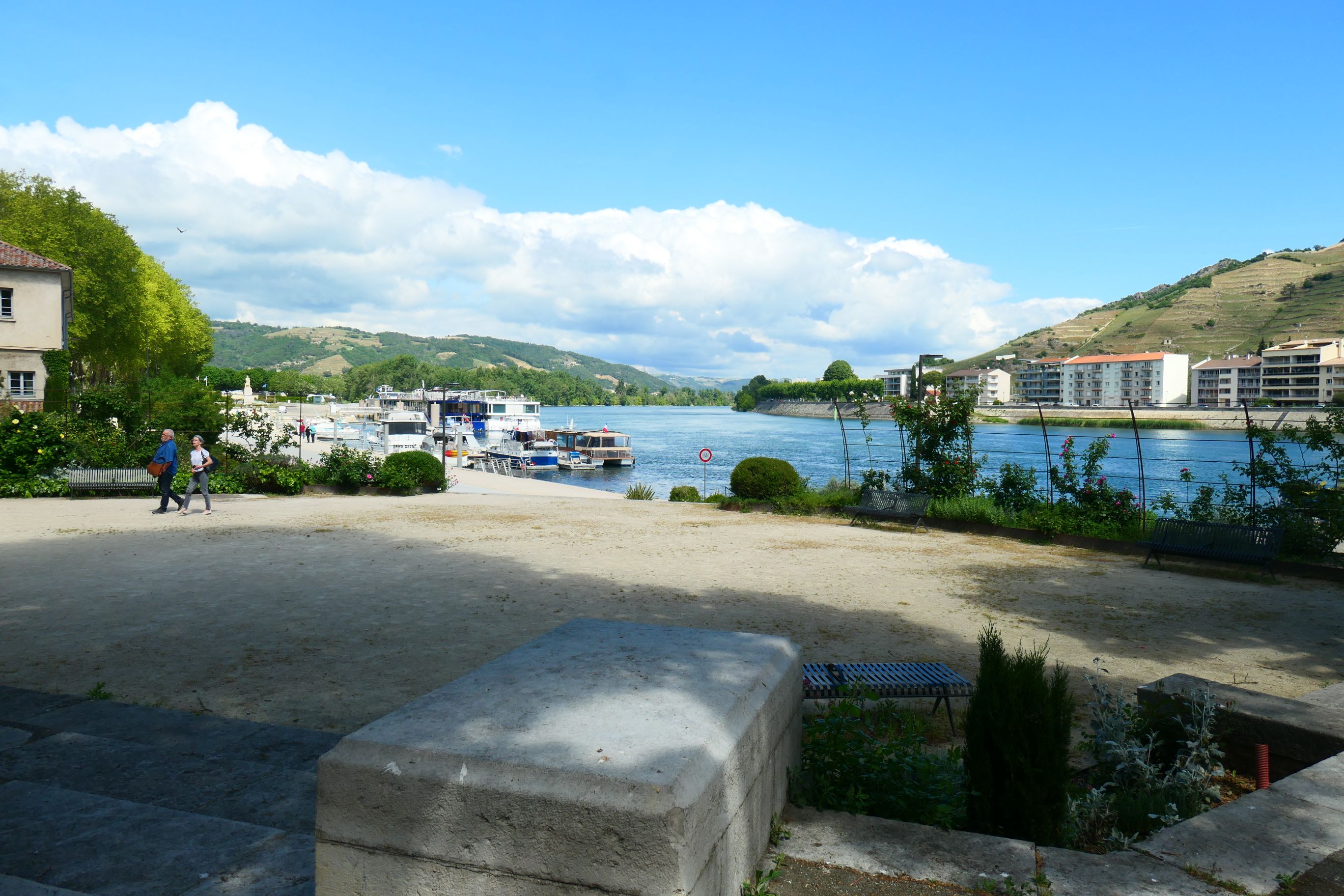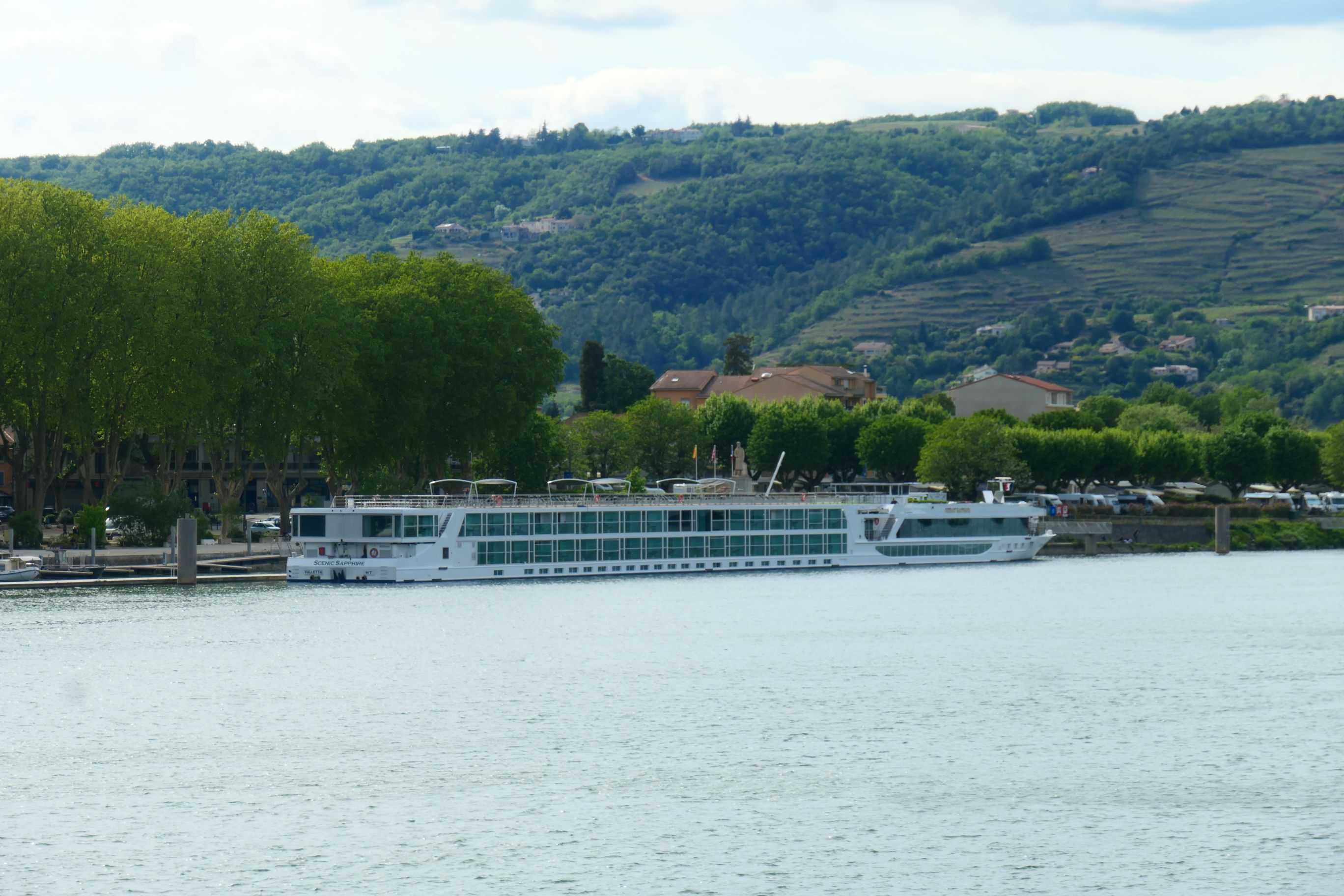 We walked back towards the bridge through the back streets of Tain, doing our best to avoid the flea market. From this side of the bridge we had beautiful views across the river to the hills behind Tournon, where vineyards had also been planted. We arrived back at the dock to discover that the other ship had departed, so our ship was now docked right at the water’s edge.