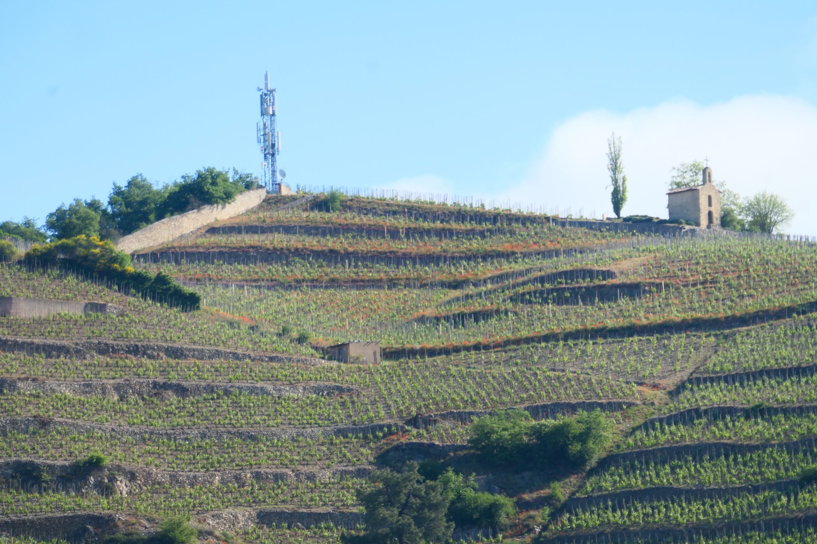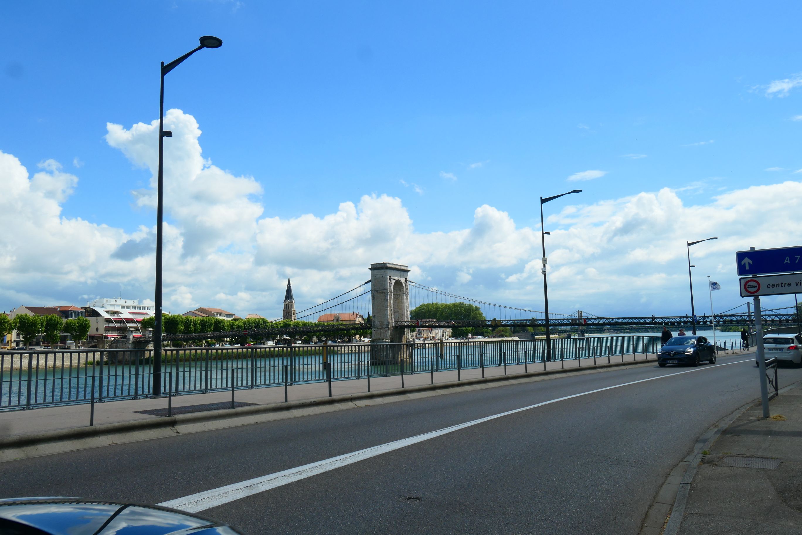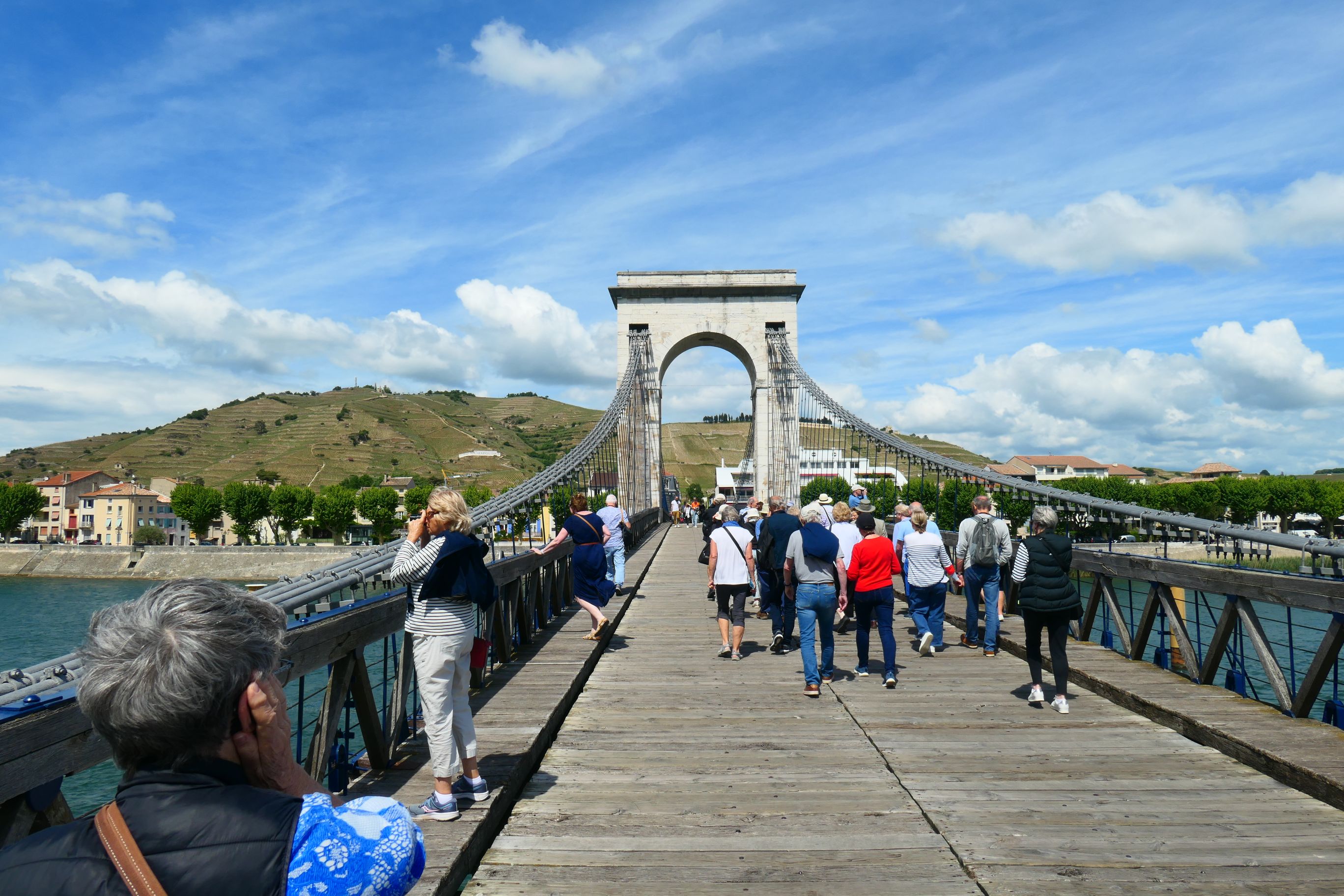 Directly across the Rhône from Tournon is Tain L’Hermitage. From our ship we could clearly see the hillside vineyards that produce the world famous Hermitage wines. They cover every available square metre of the hillside, making me ponder about the technology and harvesting methods they might use to gather the vintage each year. High on one of the slopes, I did spot a man with a horse walking slowly back and forth among the rows of vines. To cross from Tournon to Tain, we would need to walk across a historic suspension bridge which was only available to foot traffic and cyclists.