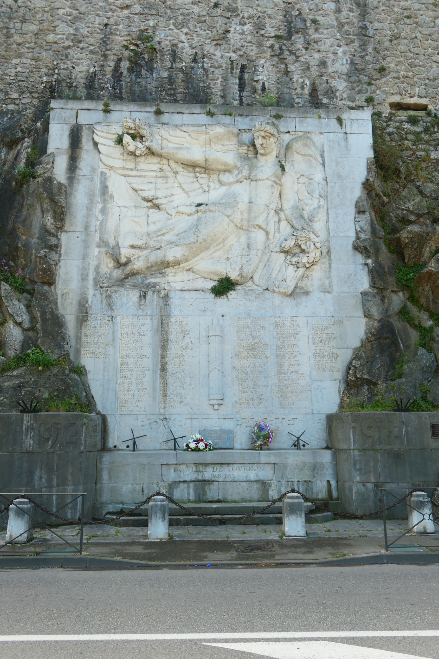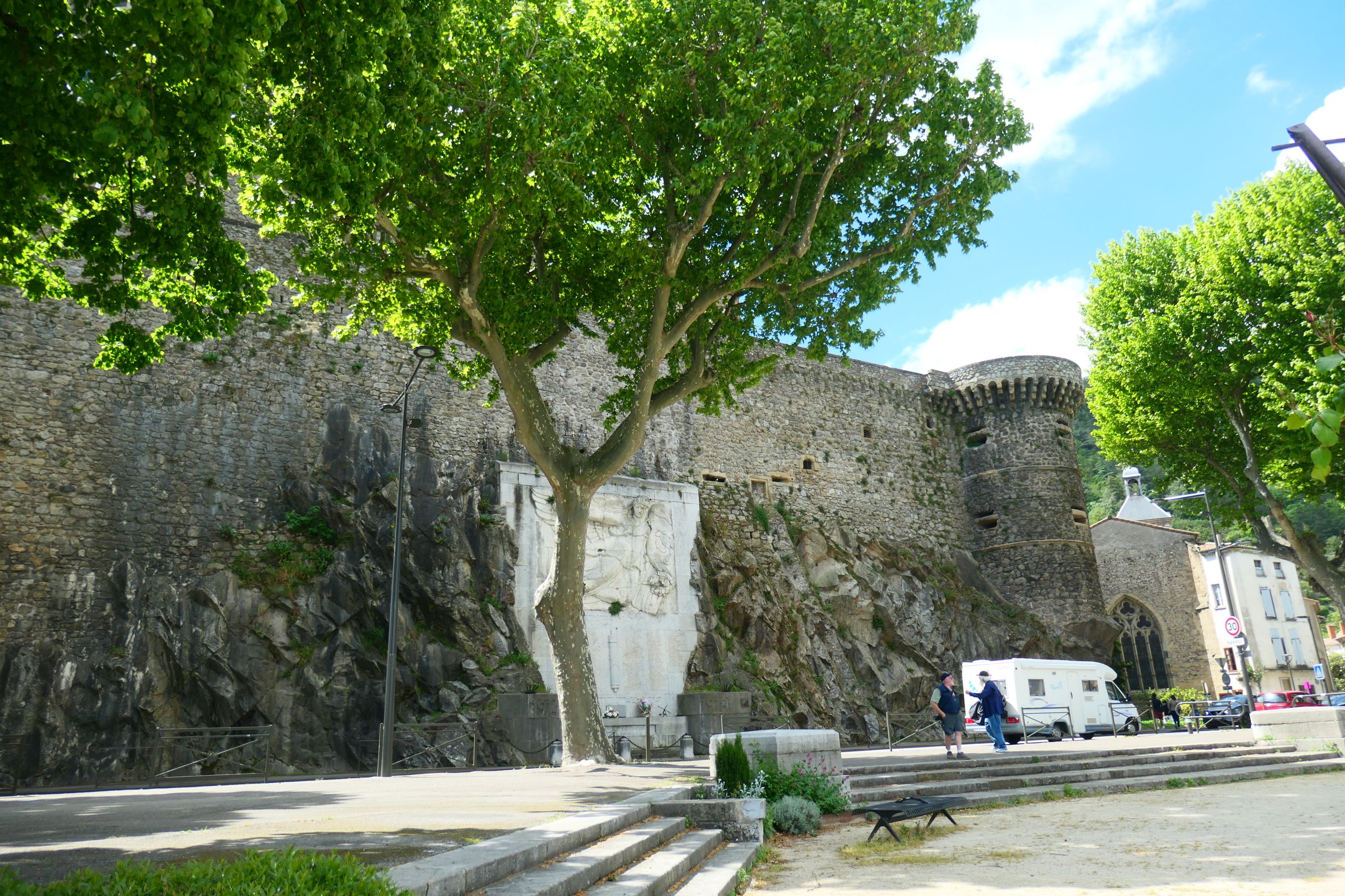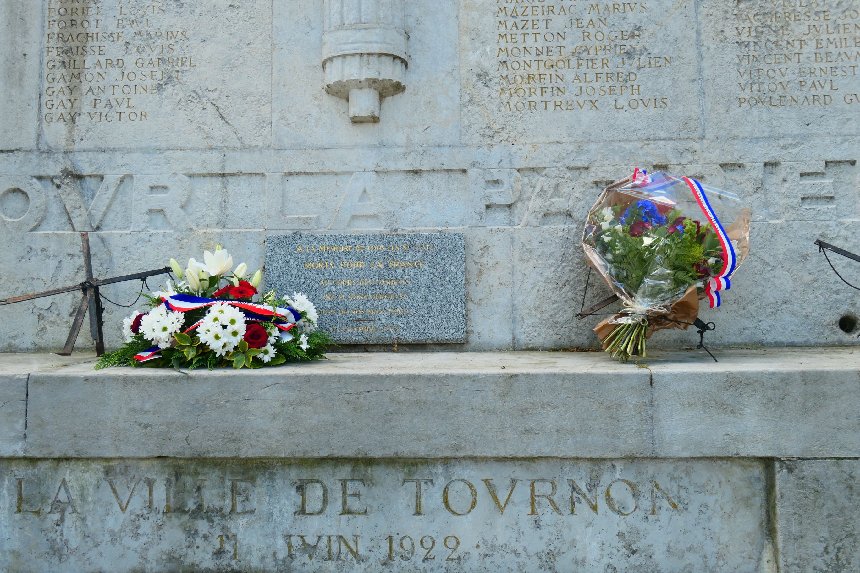 Tournon is a historic town. As well as the remains of the city wall and its towers on the nearby hillside, it also features a medieval church and a former castle which more recently was a prison. Today it’s connected with a museum and visitors can wander through its rooms. We were there before it opened for the day, so unfortunately we never had a chance to look inside. On one wall is a large memorial to the people of the town who died in 20th century wars. Floral bouquets had been placed there for V-day commemoration only hours earlier.