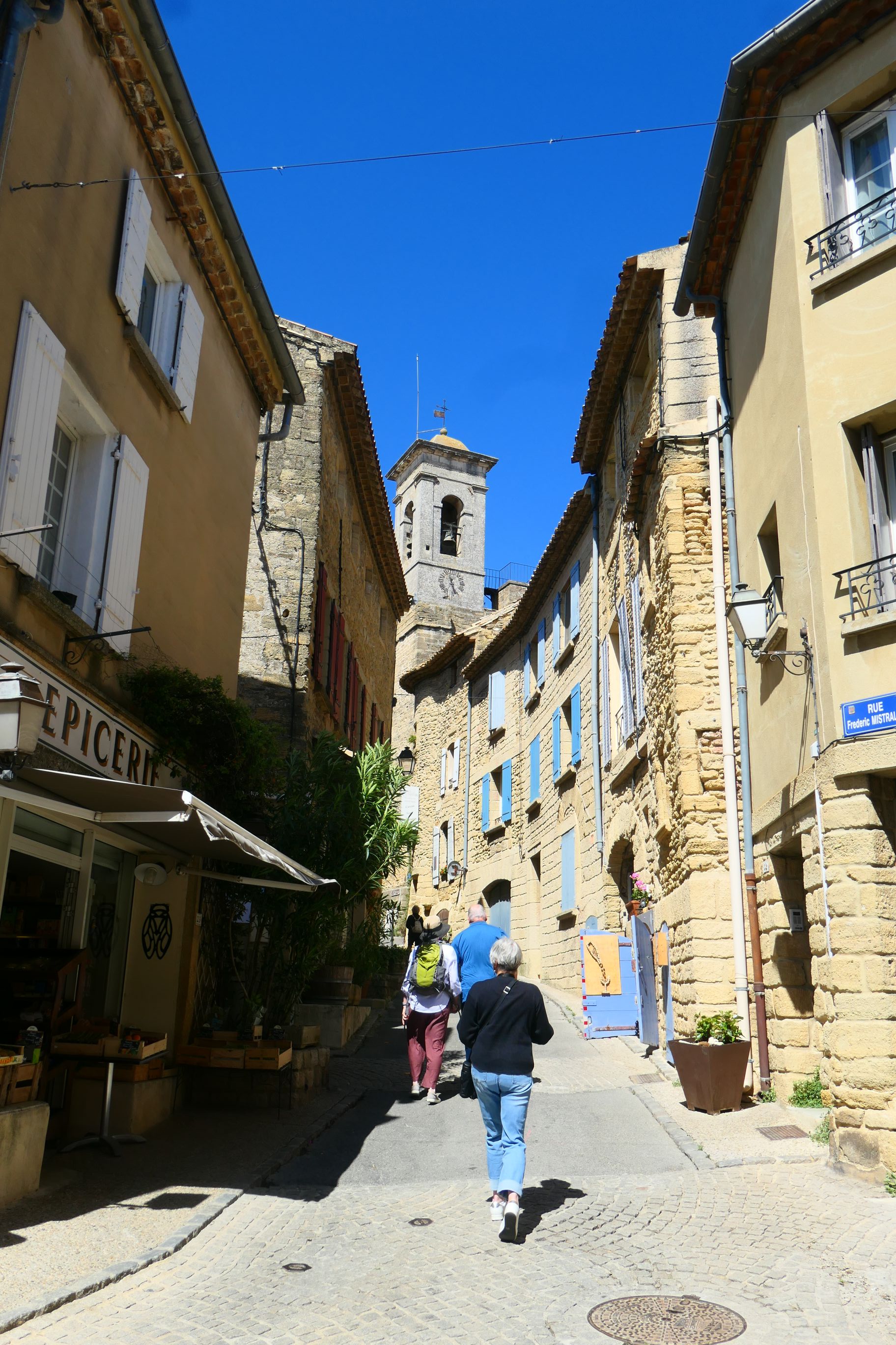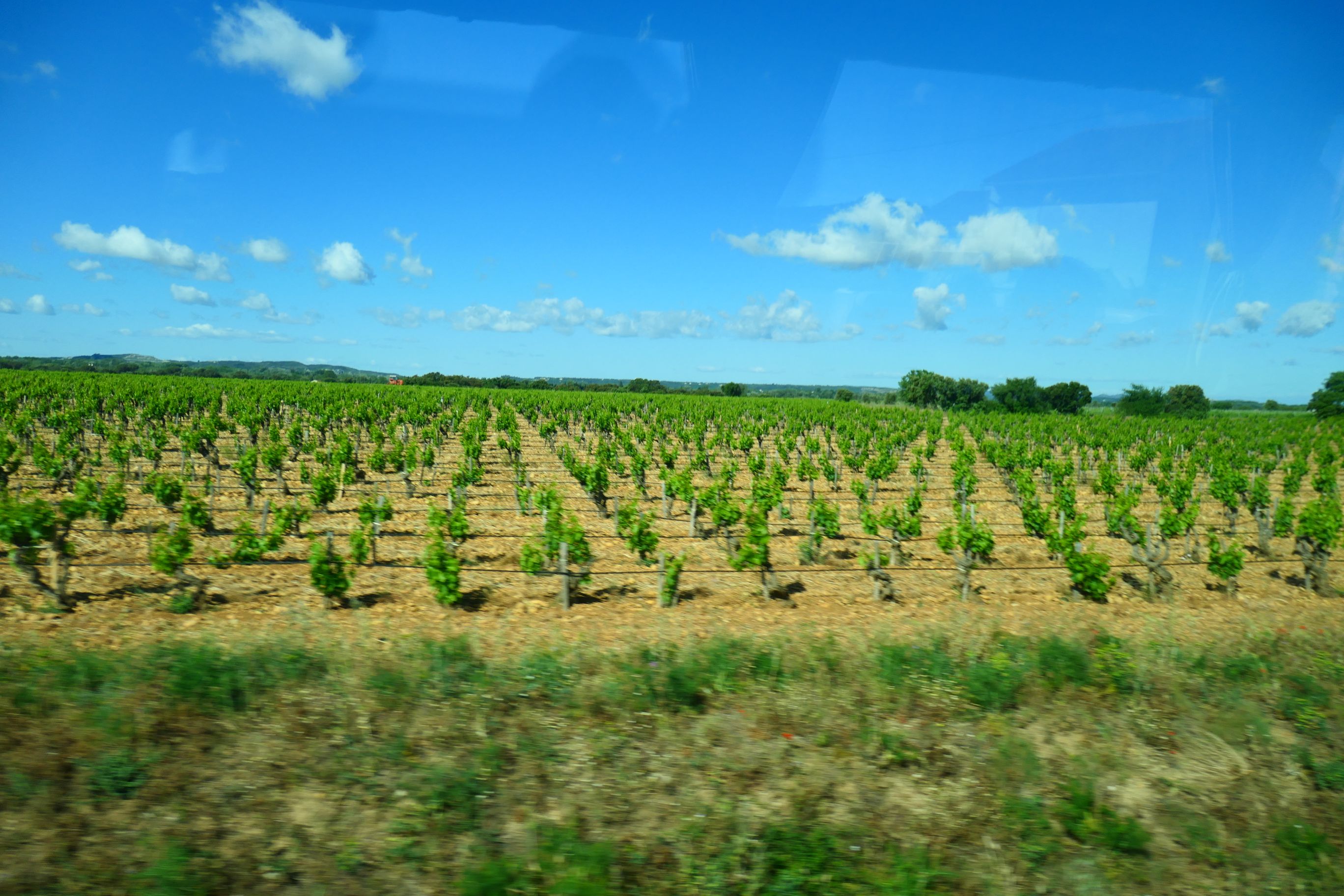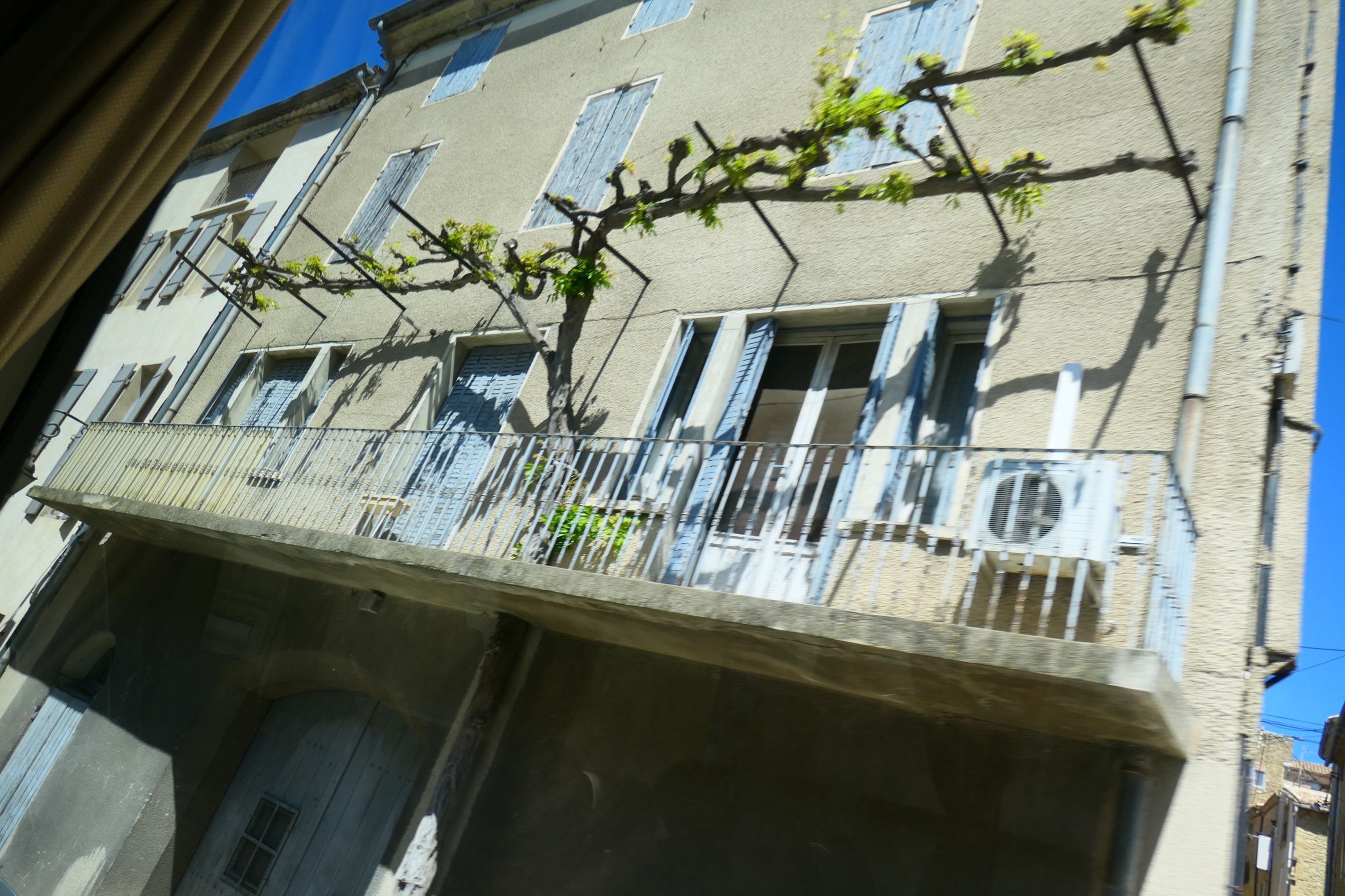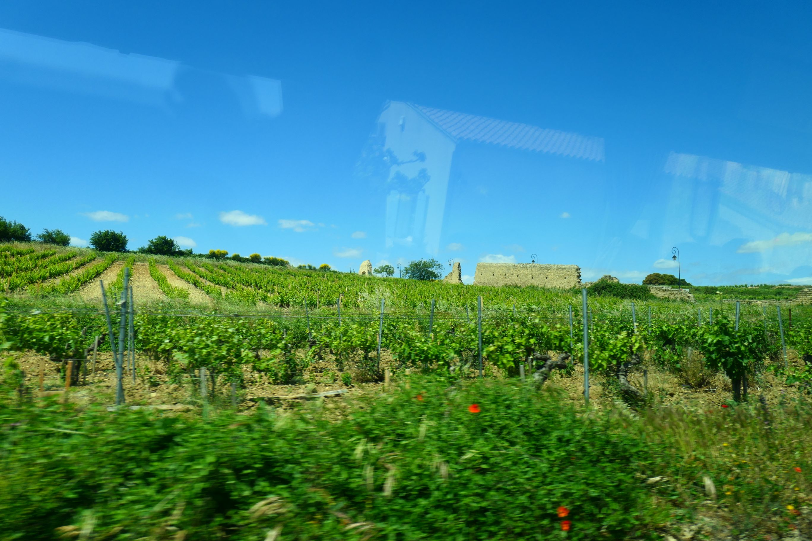 We were promised a scenic drive to reach the commune. It certainly started off that way, as our coach crossed over the Rhône and soon entered a wine region. Under sunny blue skies, we drove through vineyards to the left and right of us until we reached a small village and turned into a side road. Our bus stopped and could go no further. It happened to be right outside a police station and there was a police vehicle now blocked by our bus from leaving the compound. There was a friendly exchange between one policeman and our driver. He offered her help and pointed out directions. At one stage he got onto his phone and began searching for information. He guided her as she manoeuvred the bus around, as it was quite a tight turn in that narrow street. Then he smiled and waved us on our way. Our guide informed us that our vehicle was too wide for the narrow street we’d been on, and that the driver was now heading all the way back to Avignon to take another route, this time through an industrial area. So back we went until the vineyards were behind us and soon our ship and then the Popes’ Palace and the Pont du Avignon appeared. We drove past them and left town in a new direction. Our guide was right. We did drive though a number of industrial sites on this new road, but eventually we entered wine country and once again on both sides of the bus were green fields of vines.