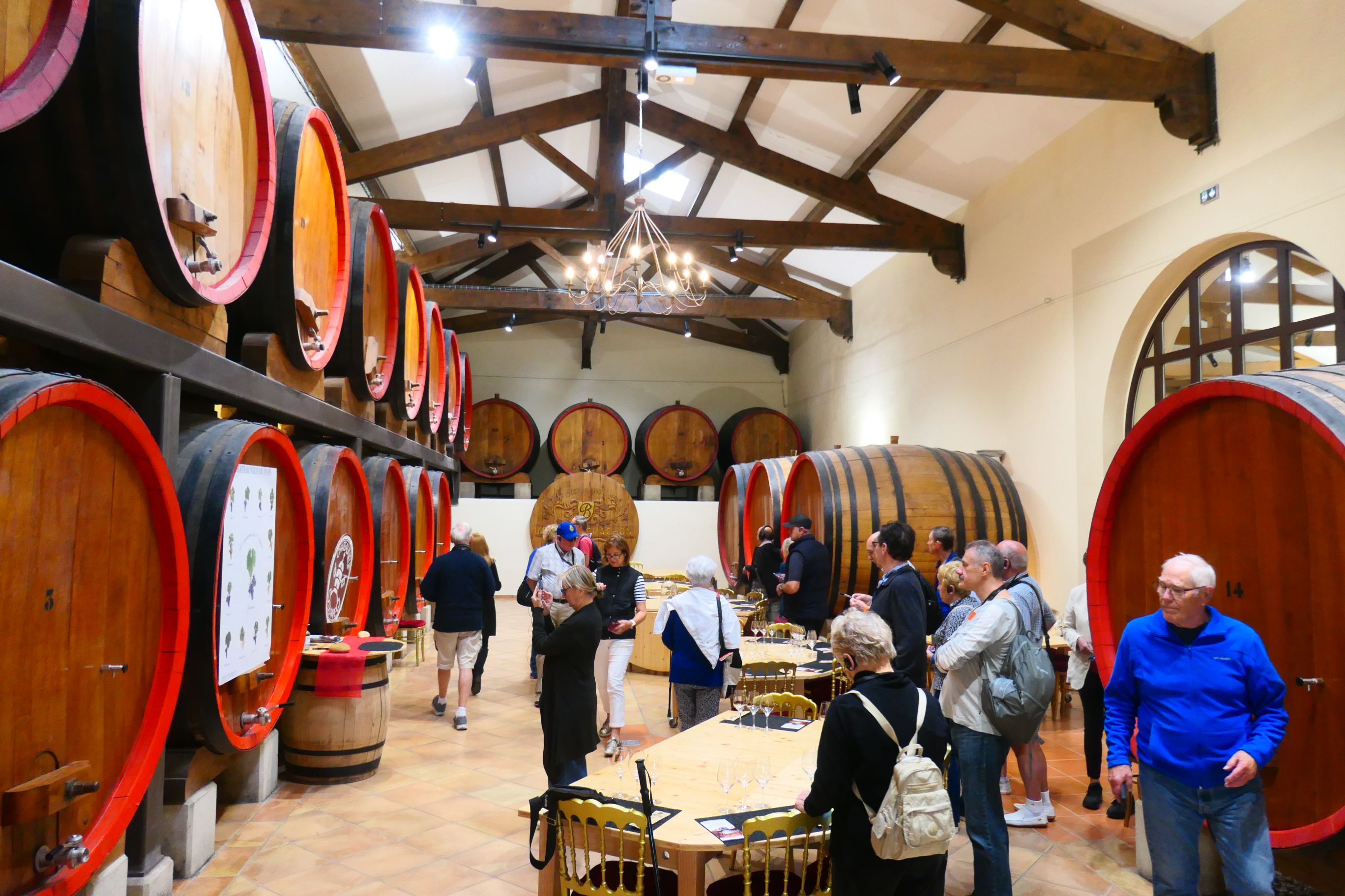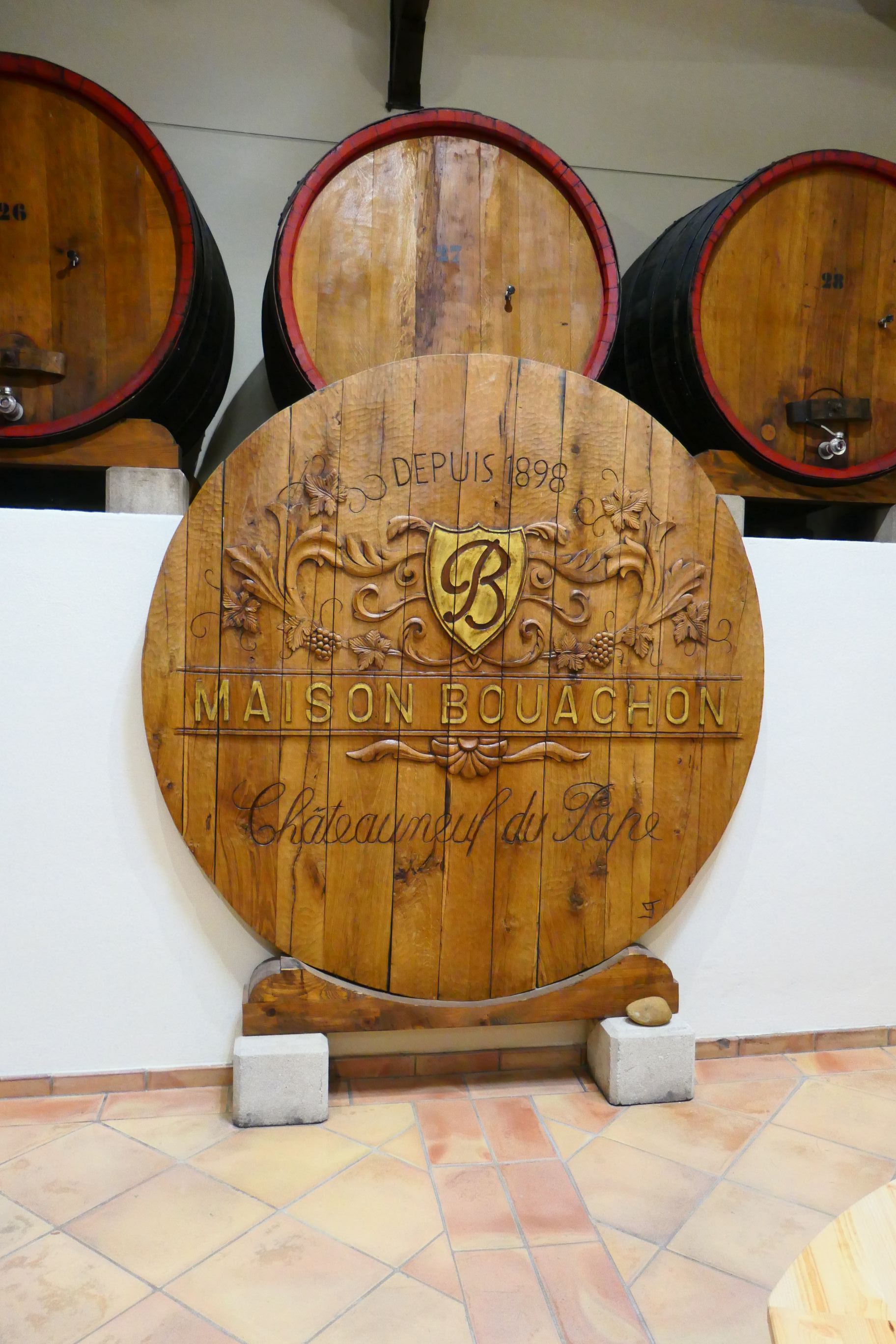 Our coach pulled into Maison Bouachon, one of the wineries which produces Châteauneuf-du-Pape’s famous vintages. Our sommelier, Julian, explained the terroir of the region to us. A simple definition is that terroir is a combination of the soil, the environment (wind, rain, sunlight, neighbouring plant species etc) and human knowhow and labour. He talked about environmental factors such as the mistral (the strong cold wind which sweeps across the Rhône valley), the low rainfall and the stony soil. Julian spoke about the vines putting their roots down very deep into the soil, seeking moisture and the goodness the plants take from the soil at that depth.
