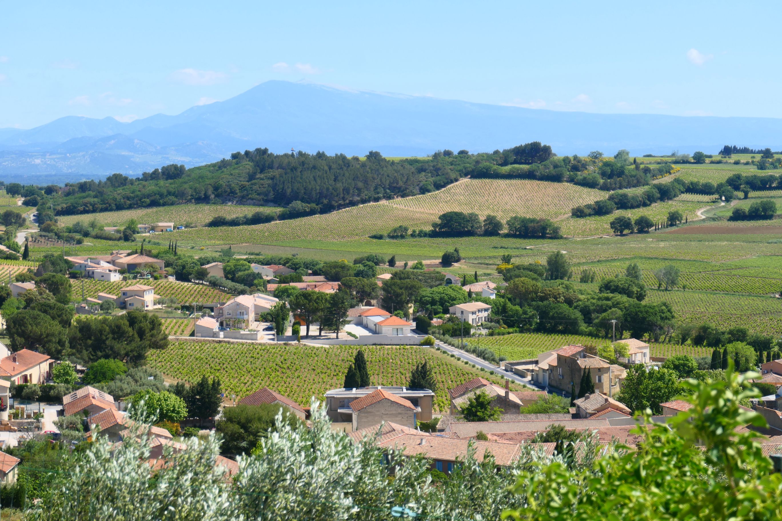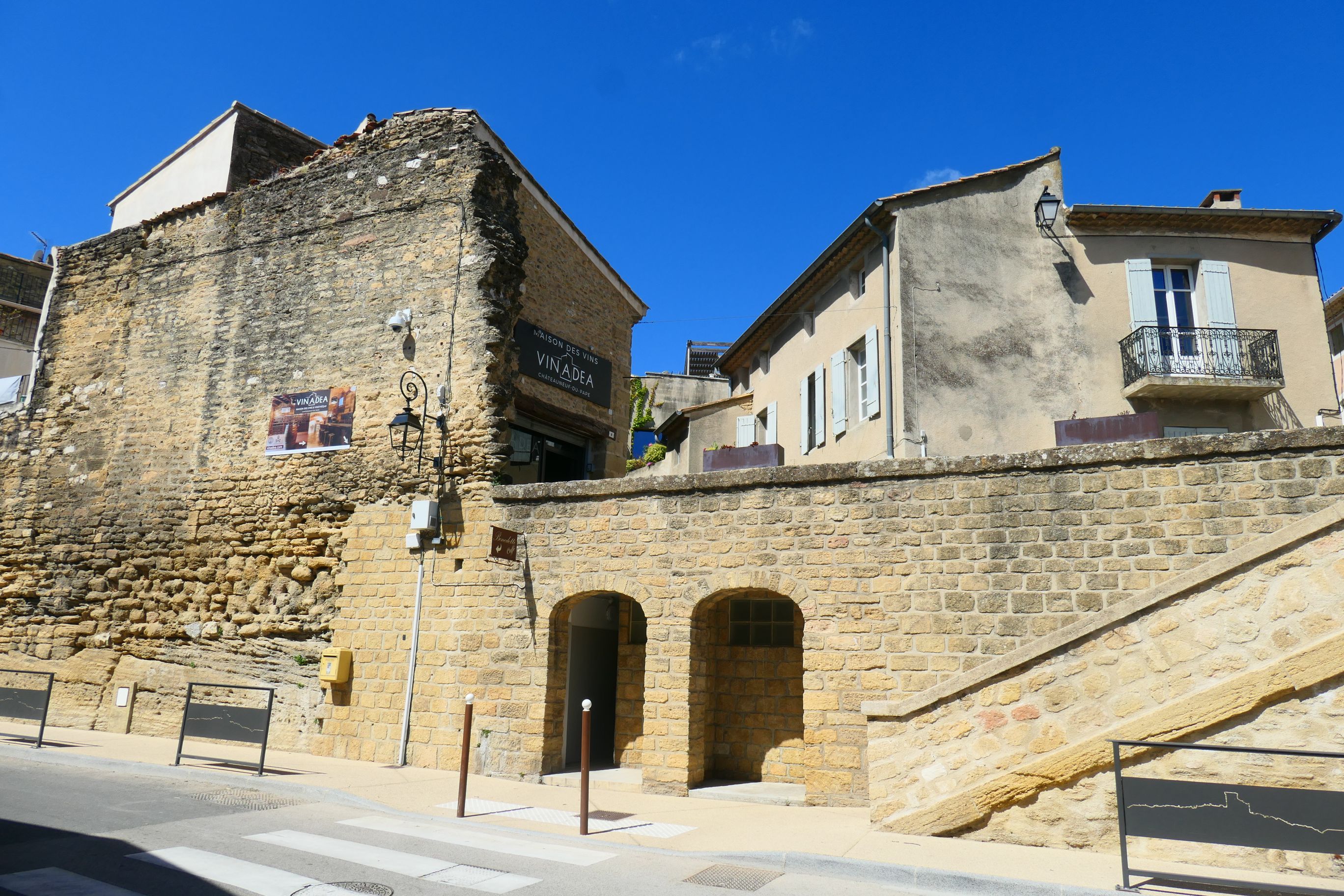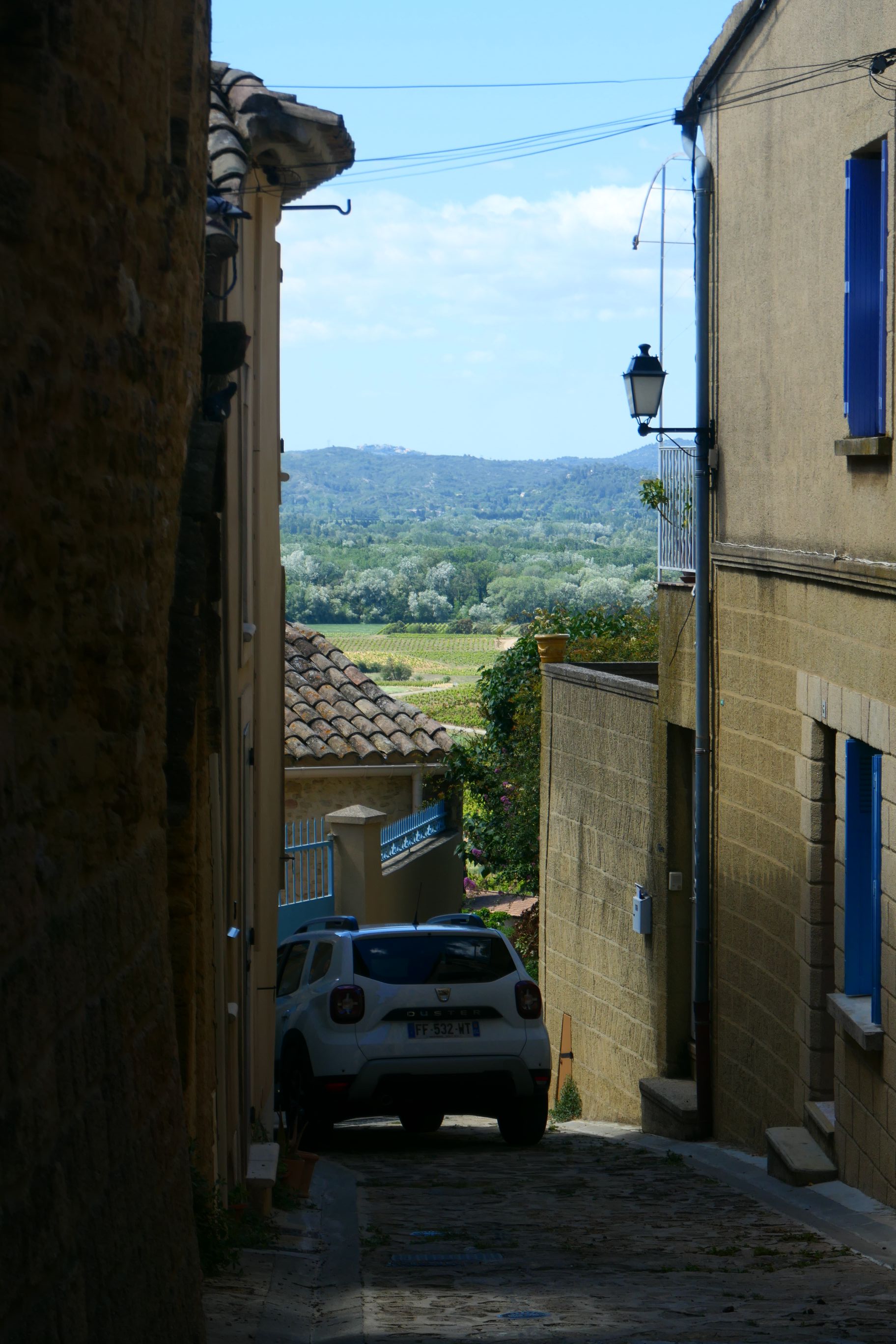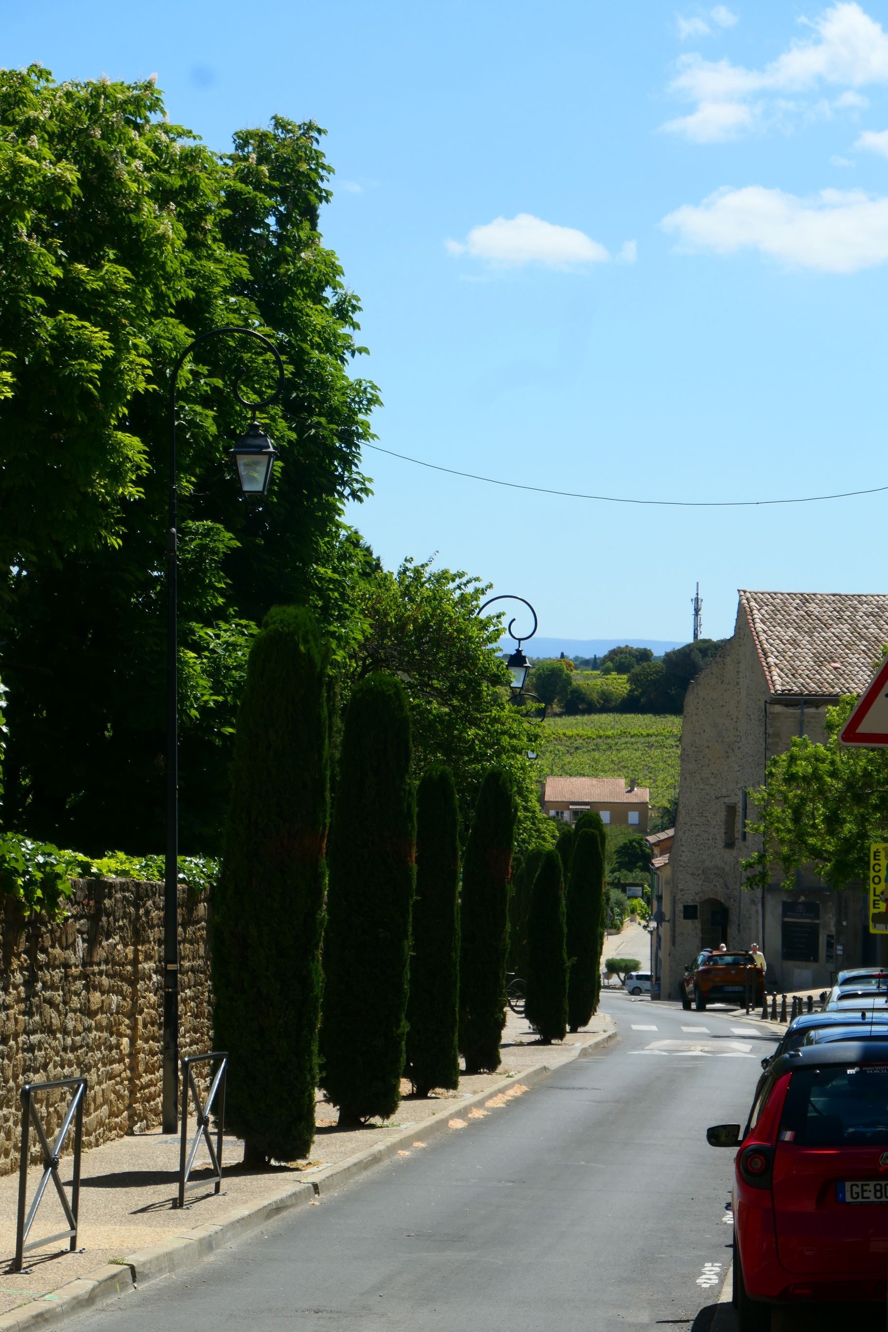 Following the wine tasting, we spent half an hour walking the streets of Châteauneuf-du-Pape. It’s only a relatively small commune. Typical of other communes we’ve visited over the past week, it’s quite hilly. Some of the buildings are very old, possibly medieval. Dominating the hilltop above the village are the ruins of Pope John XXII’s Castle. He was the second of the Avignon Catholic Popes. It was constructed in the early 1300s. The final occupants of the castle were the Nazis in August 1944. They used it as an observation post and ammunition store. Before they left, they attempted to destroy the building, but only partially succeeded, leaving one high wall still standing today. From the castle hill you could look out over the valley to the Rhône in the west and across cultivated vineyards on the eastern side. The eastern view reminded me a little of the views I had from San Gimignano in Tuscany on our previous European trip.